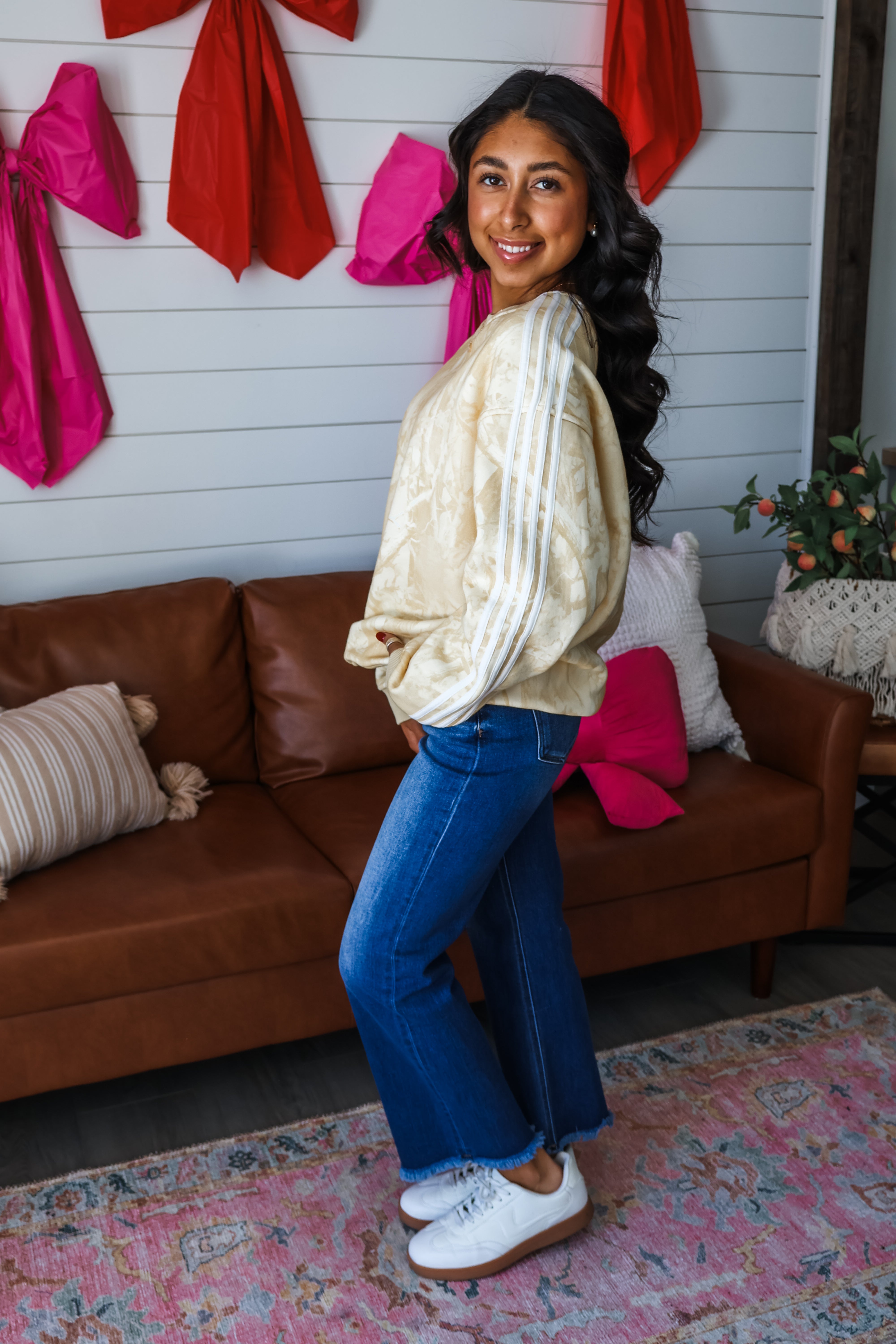 Playful essentials to refresh your spring style. This pullover top is featured in a loose silhouette for the comfiest fit, with a forest camo print and striped detailing for a cute trendy look. The super soft fleece fabrication provides a layer of warmth, while the crewneck and rib band finishing make it an easy staple you’ll keep reaching for.