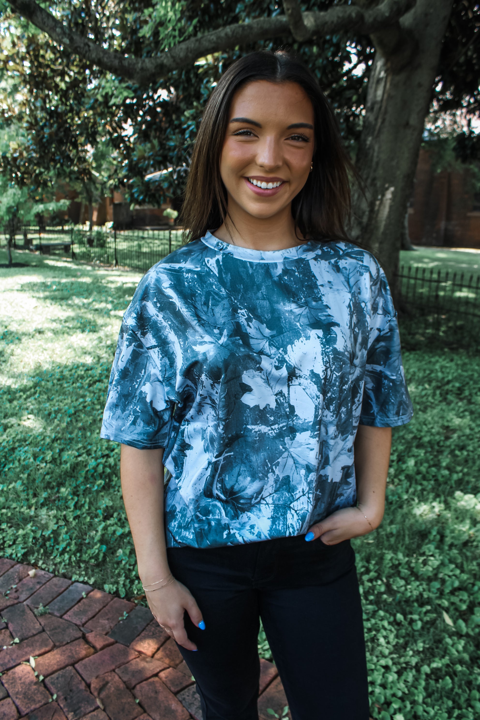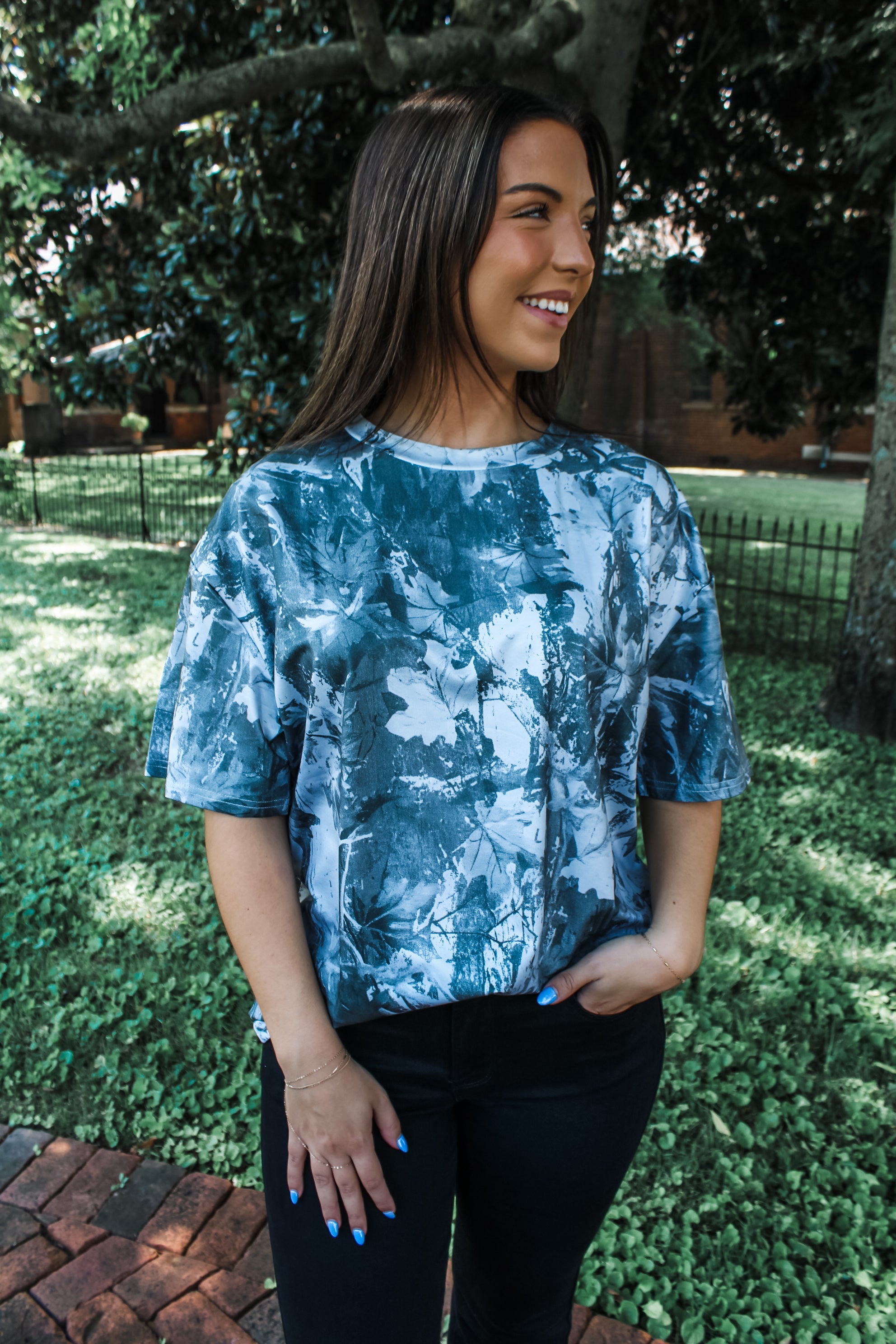 Fun times ahead in this cutie camo! New colors as we head into fall. This color is more grey in person. The computer lightning is more of a blue tone. This lightweight top is perfect for the upcoming season! Loose fit throughout. Model is wearing the small and is 5”5. Small 0-6 medium 6-10 large 10-14. 100% polyester