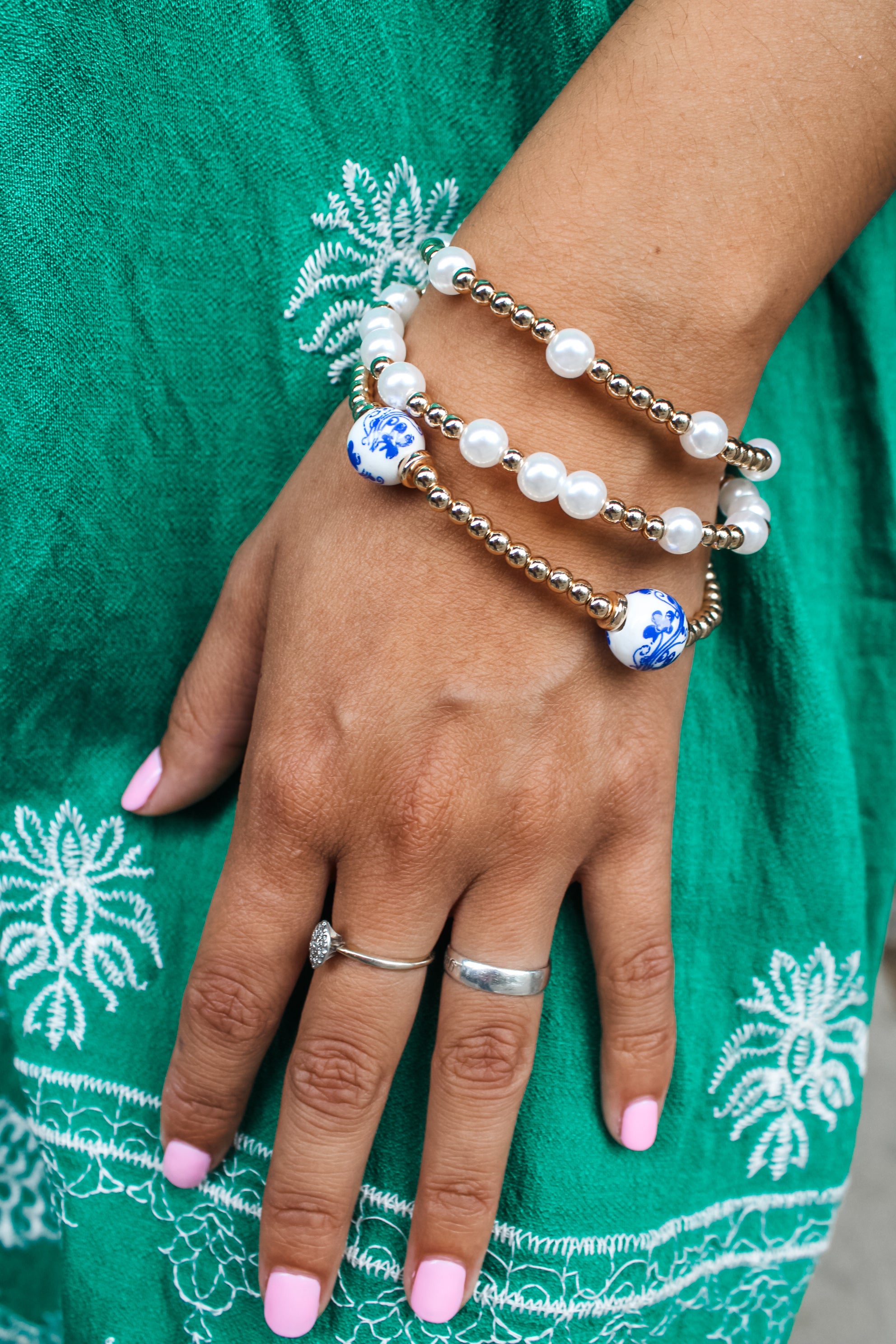 Featuring painted beads and pearls, this elegant 3-piece bracelet set will add polish and charm to any look. Materials may have natural variations. Colors may vary from different viewing devices and lighting. Final sale item.