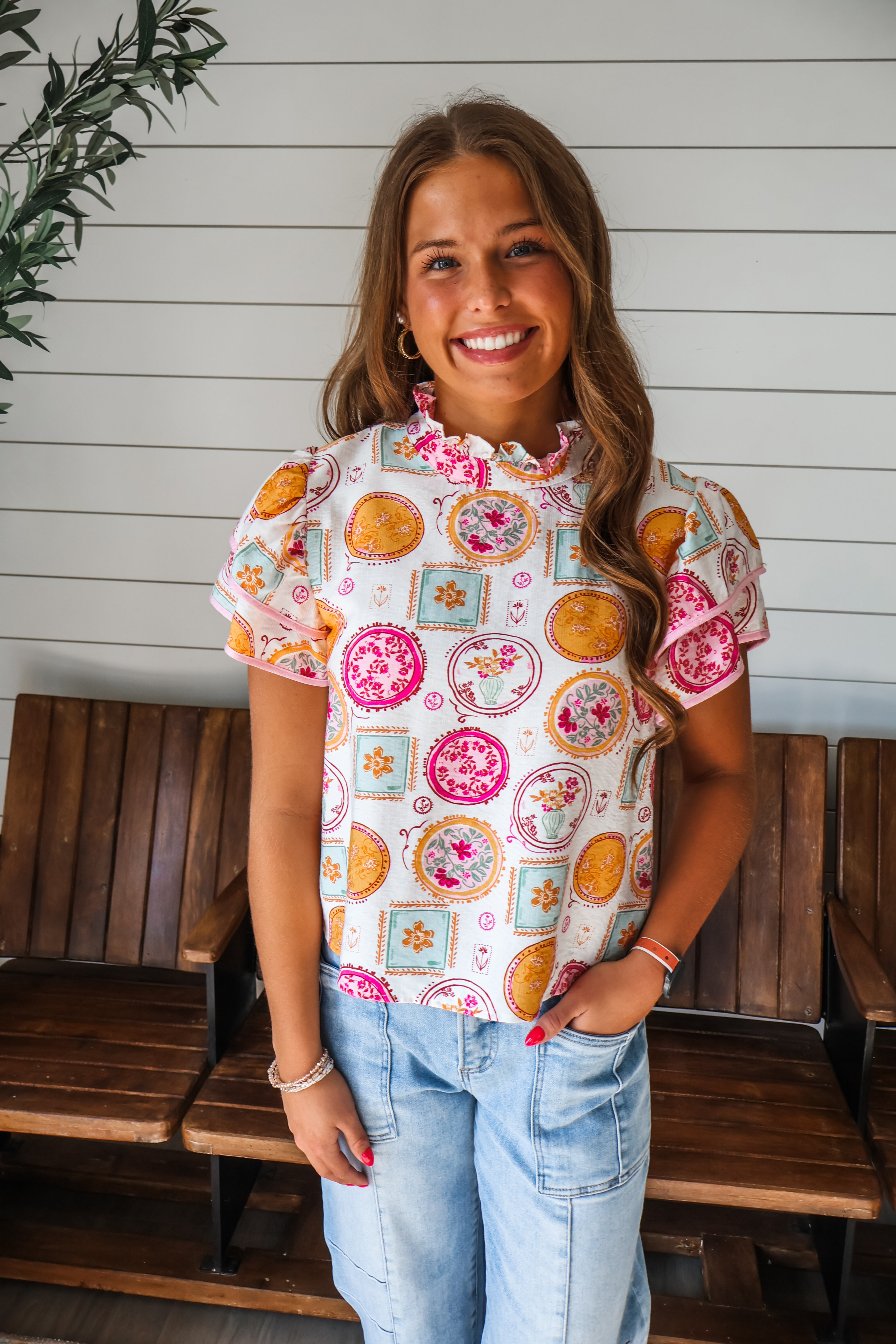Fresh florals for a sophisticated spring style. This blouse combines a lovely print with contrast piping trim details for a pretty and polished look. The layered ruffle sleeves add more feminine charm and the flowy silhouette provides an easy flattering fit. Crafted from a textured woven with a ruffle trim neckline, back button closure and slightly cropped hem length.