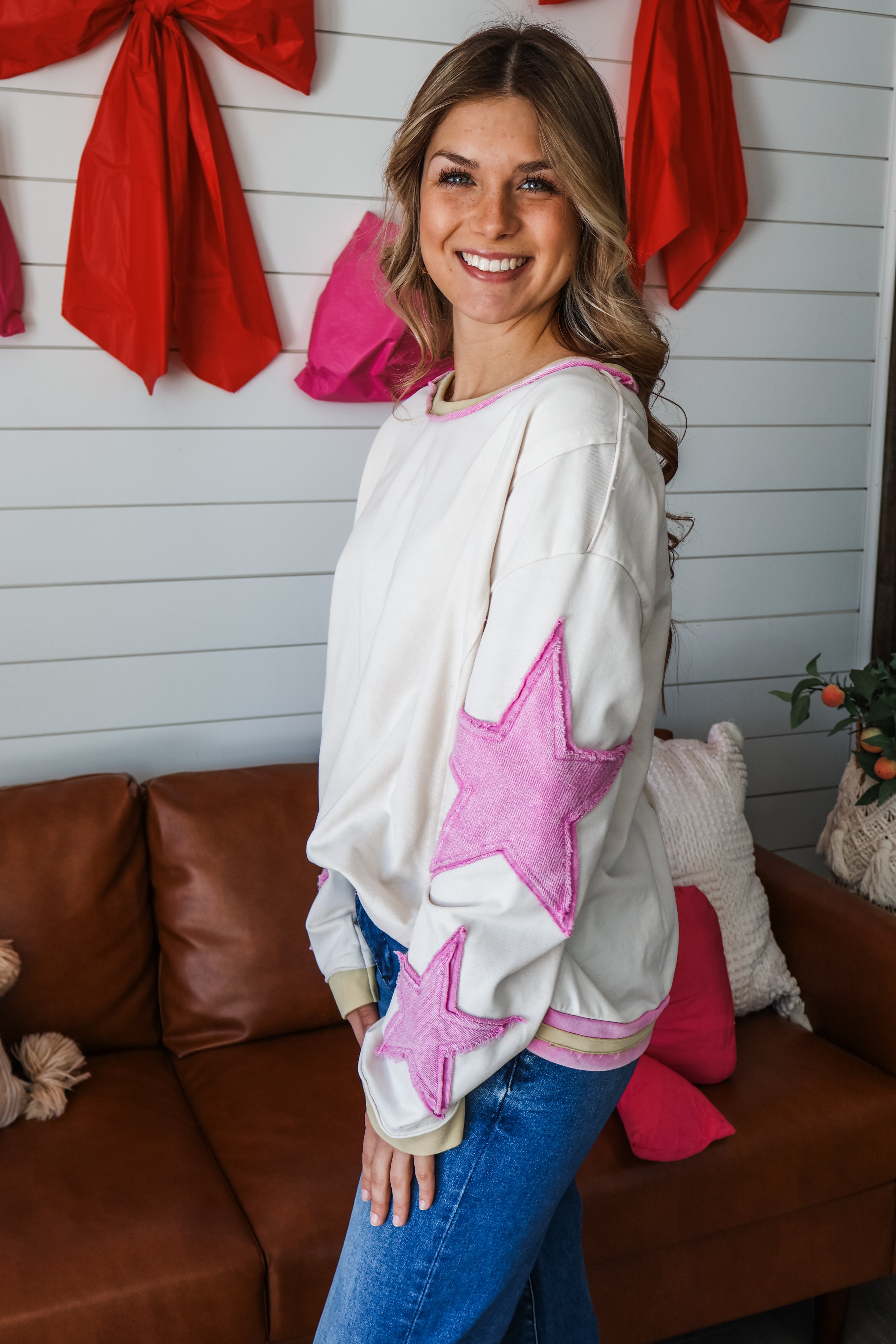 This patchwork top is a cute and playful look for everyday adventurers and spring outings! The star patch design and colorful striped trim are such eye-catching details, and the super soft cotton knit gives it a breezy and comfortable feel. Featuring a crew neckline, drop shoulder sleeves, raw edge seaming and an oversized silhouette.
