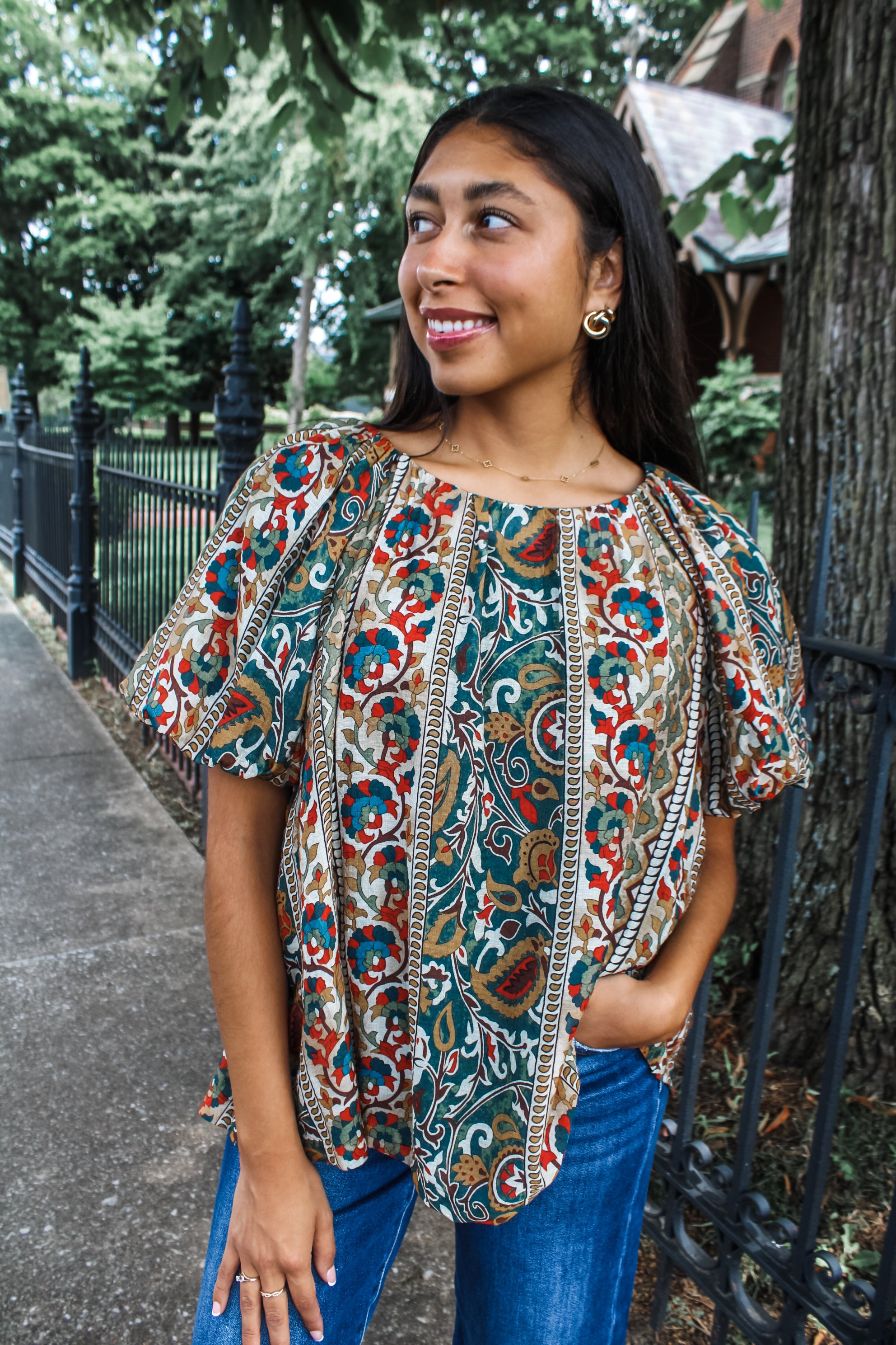 Take your fall style to the next level with elevated florals and rich tones. This sophisticated top is featured in a lightweight woven with a pleated neckline, puff sleeves and a flowy silhouette.