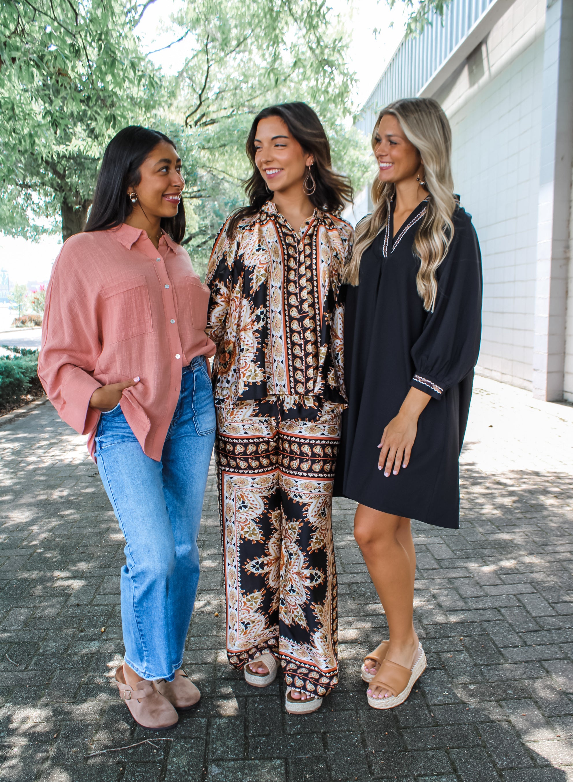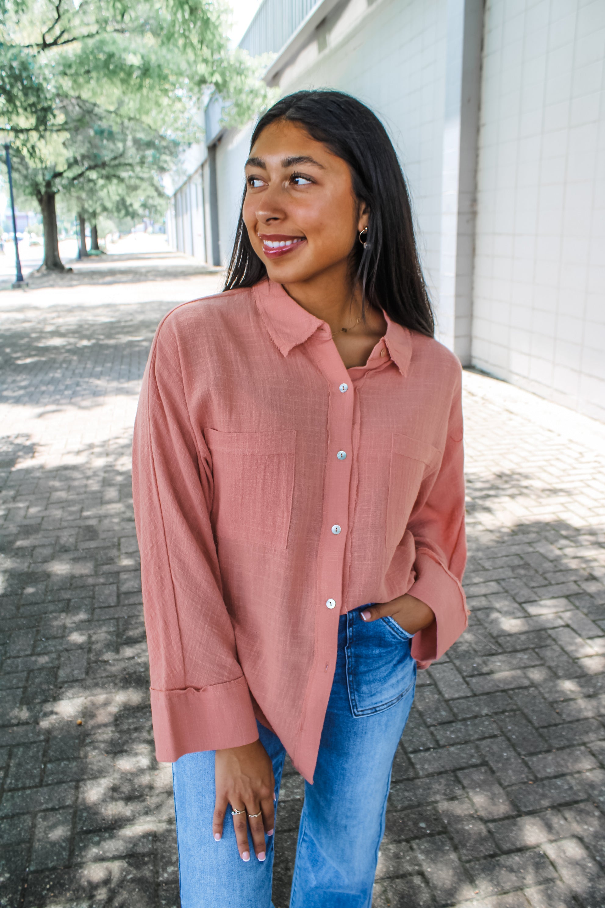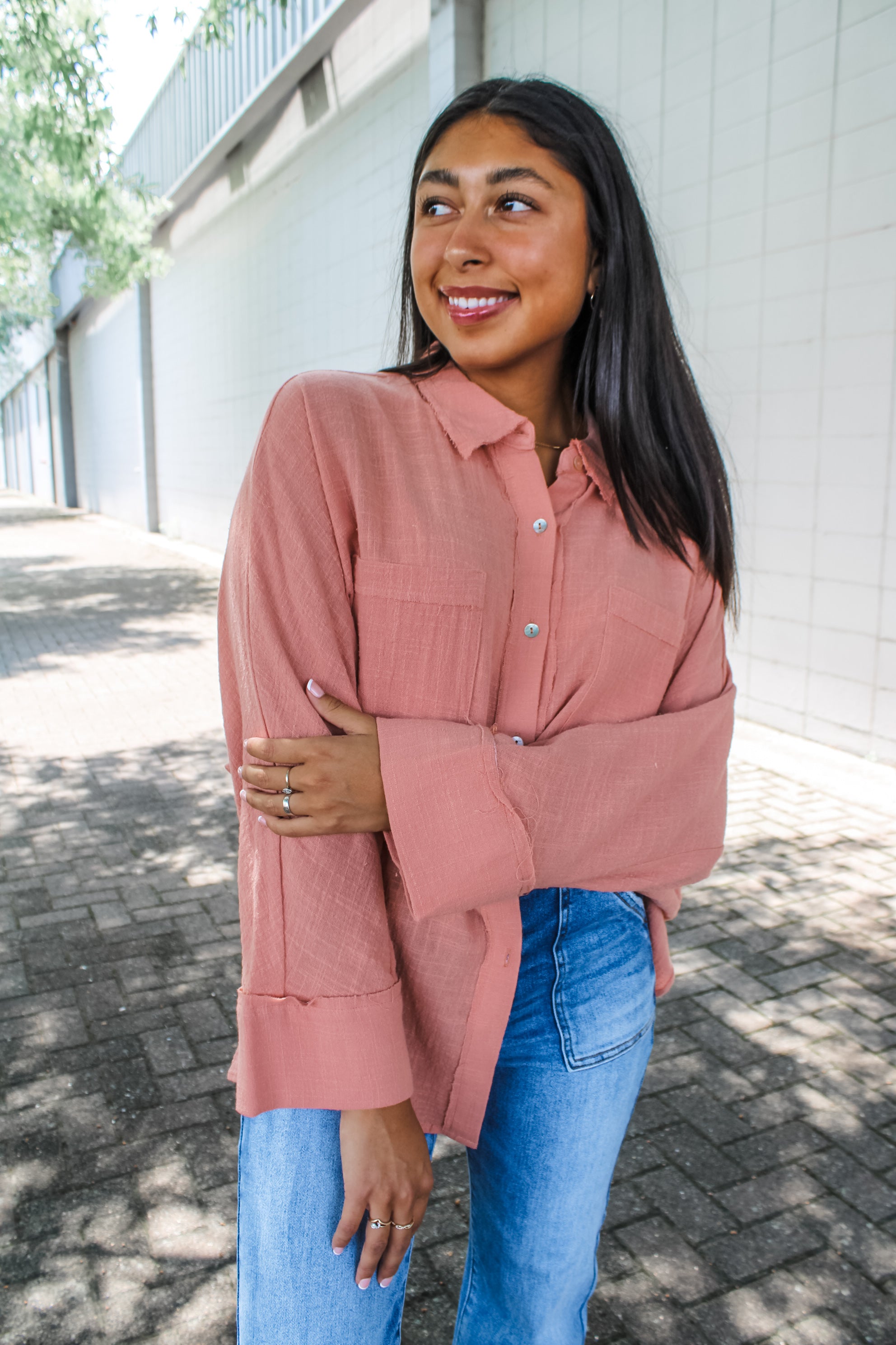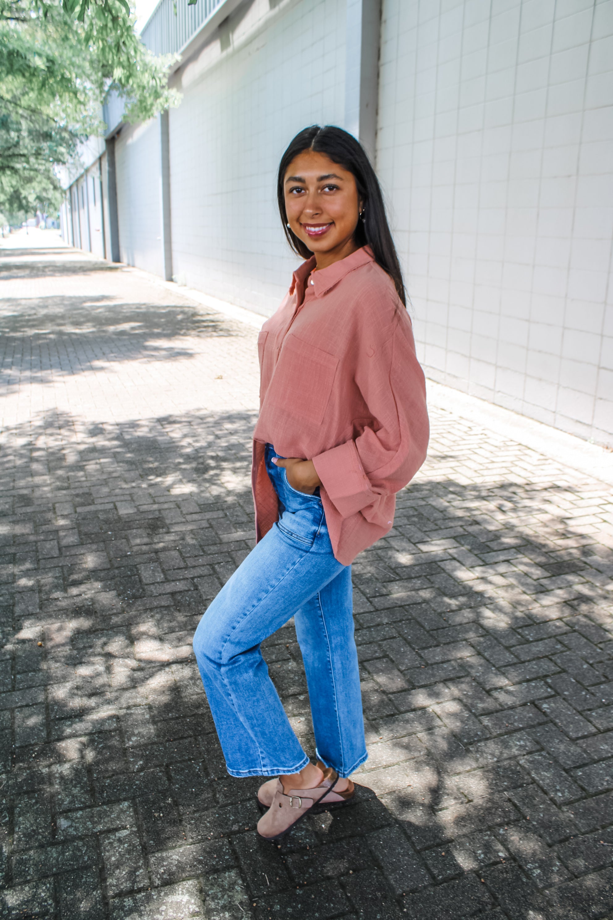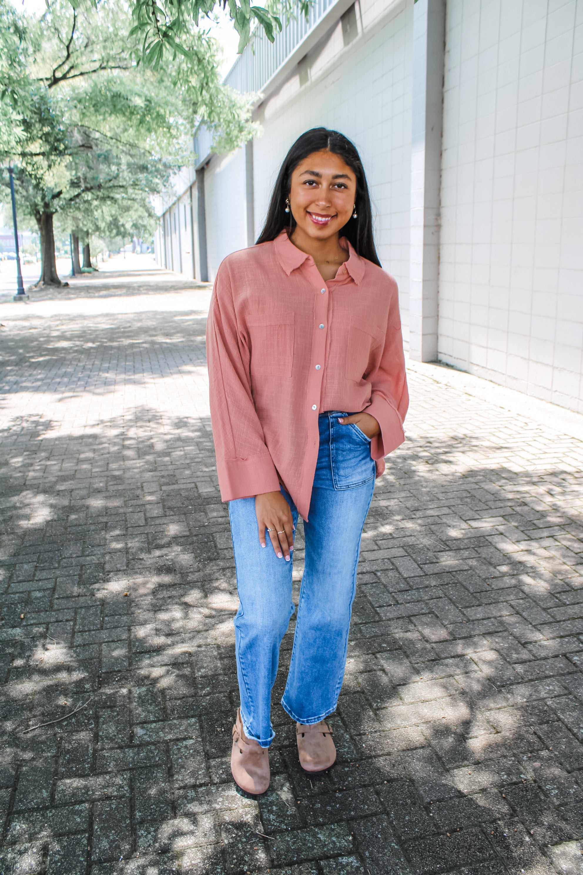 Lightweight gauzy button down top. Yes please! The perfect transition top for fall. Look at the large cuff details on the sleeve. Adorable! Runs loose throughout. The model is wearing the small and is 5”5. Small 0-6 medium 6-10 large 10-4.