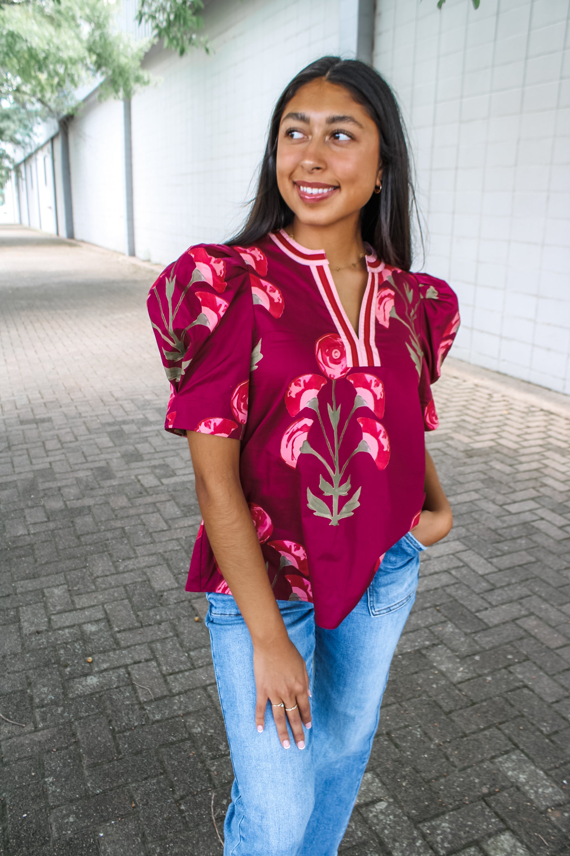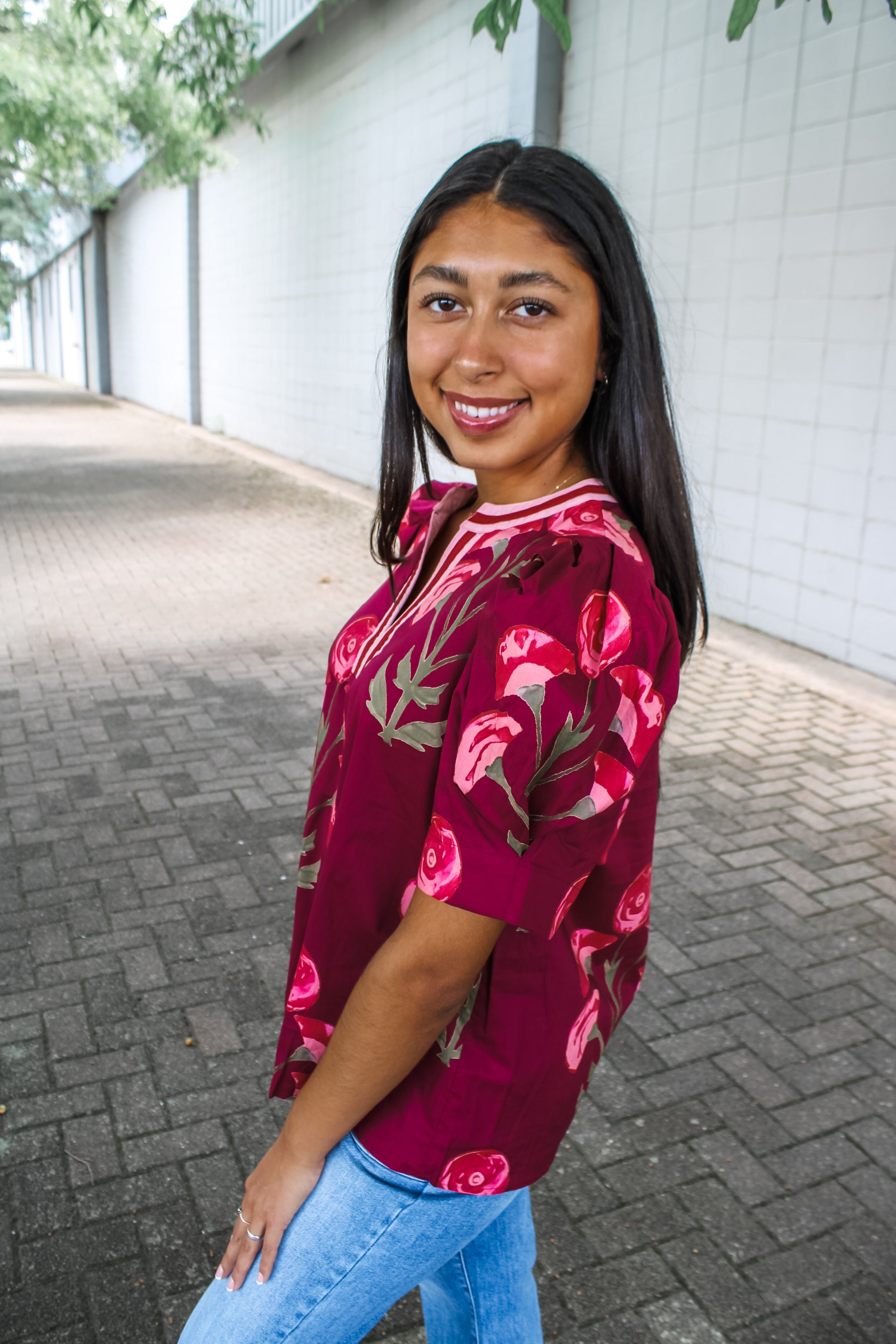 Easy to wear and oh so cute! This new top is a beautiful color for fall. Runs tts. Model is wearing a small and is 5”.5 small 0-4 medium 6-8 large 10-12. 100 cotton