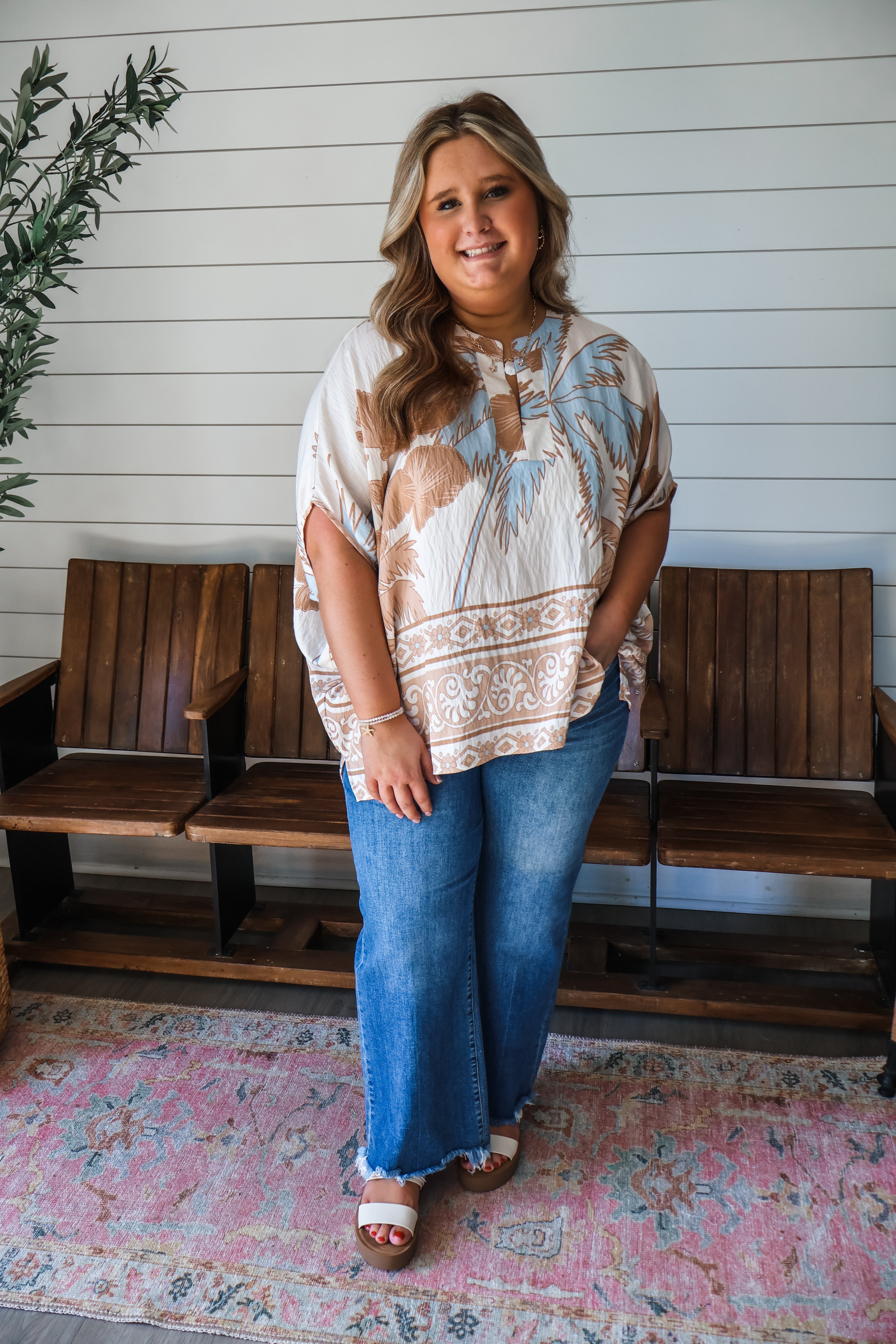 Featuring a lovely island-inspired print, this top will elevate your spring style! The lightweight textured fabrication and loose dolman silhouette provides a flowy fit that hangs over the body beautifully. With a notched v-neckline, stitching details and side split hem.