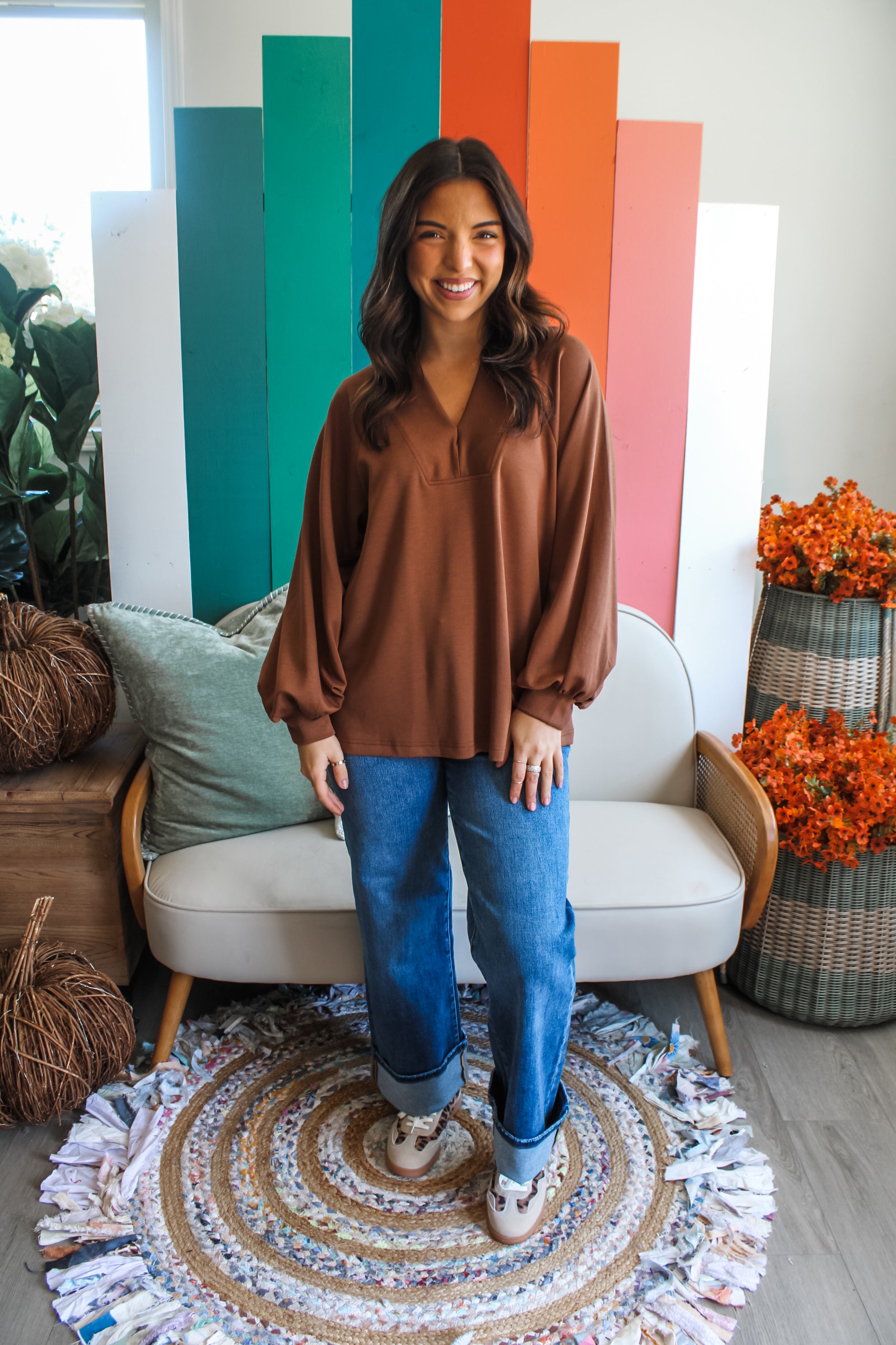 Laid-back and luxe in a smooth scuba knit fabrication, this top will be your new fall favorite! It’s a modern essential featuring a retro-inspired v-neckline, raglan lantern sleeves and a loose overall fit. An easy and effortless staple you can dress up or down for any day of the week.