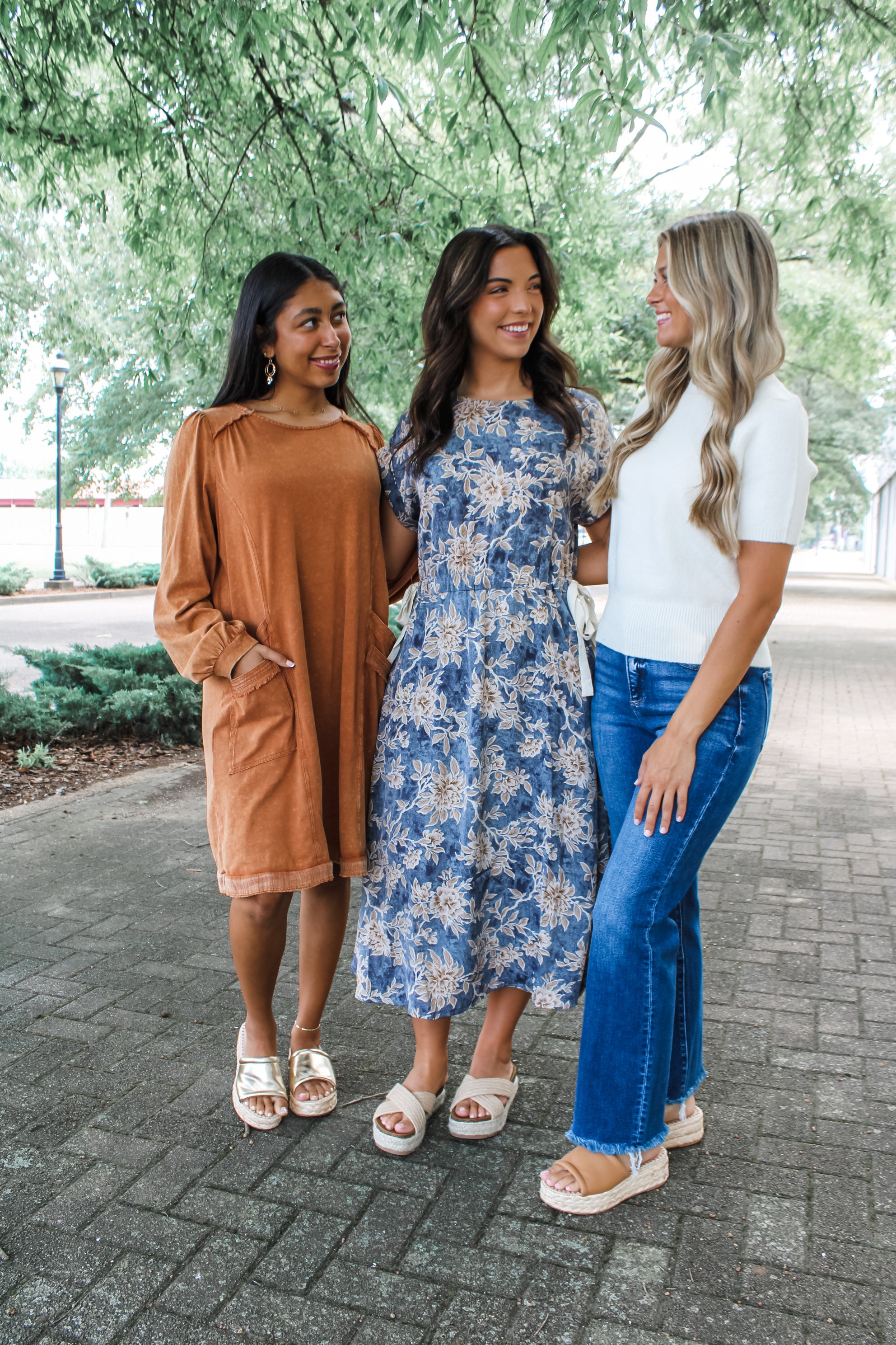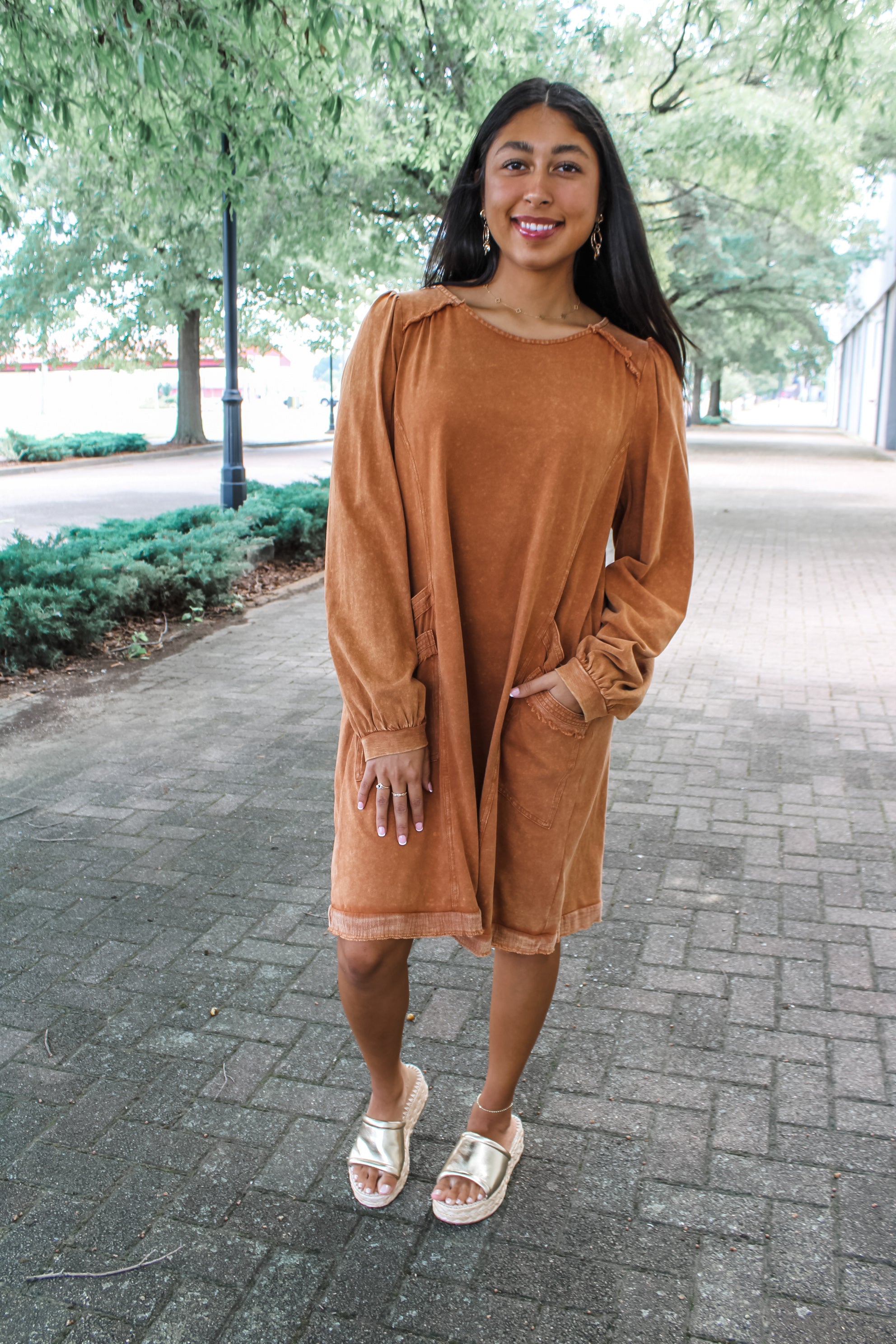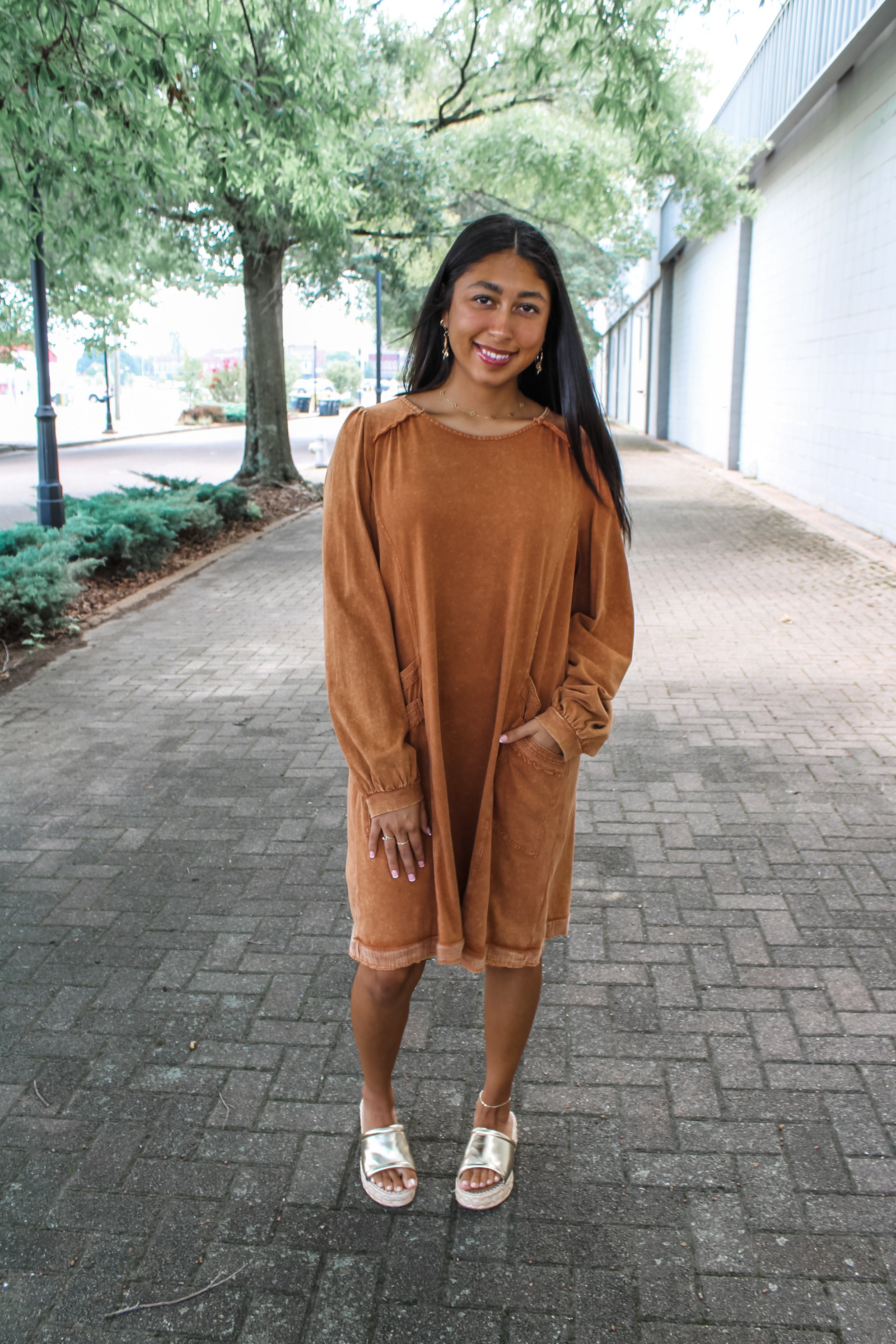 Looking ahead to fall with this new camel dress. Mineral washed. Lightweight 100 percent cotton. Great length and pockets. Runs oversized, could size down. Small 0-6 medium 6-10 large 10-14. Model is wearing the small and is 5”5.