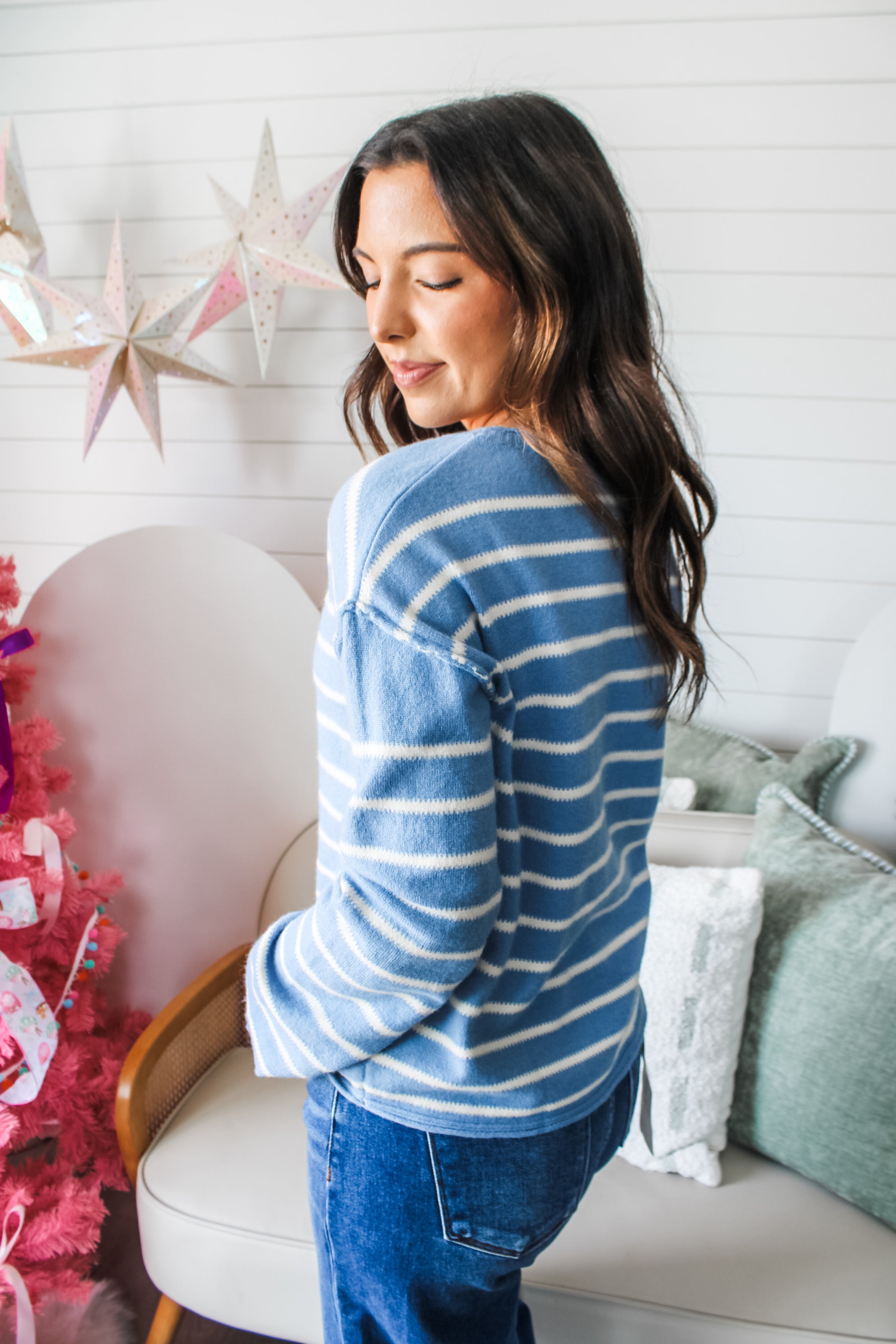 Refined essentials for a chic and cozy holiday. This striped sweater is fabricated in a soft brushed knit with exposed seaming, drop shoulder sleeves and rolled edge rib finishing. With a relaxed silhouette for an effortless and comfortable fit.