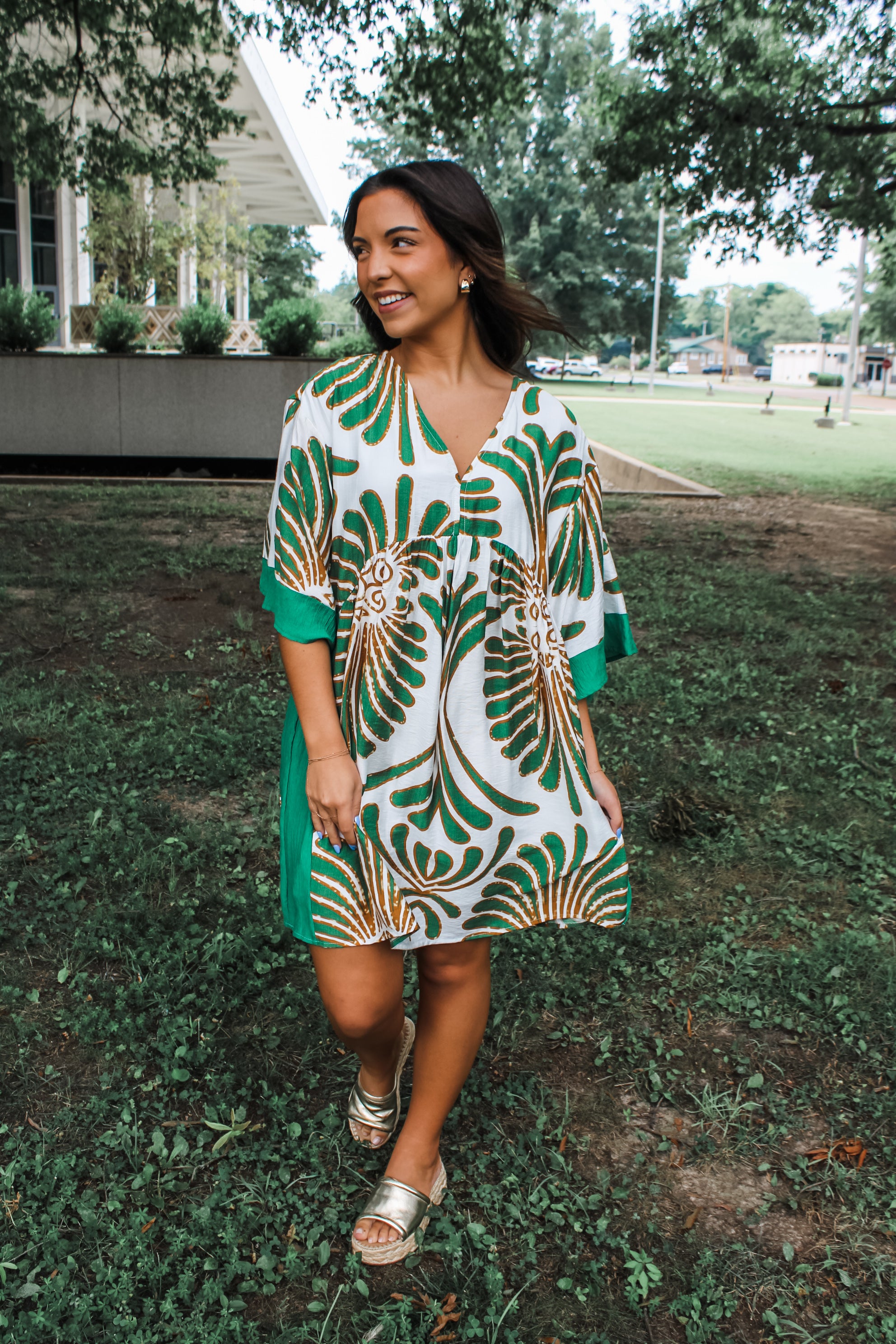 Dress to impress in this bold printed mini! You can style this effortlessly versatile look for daytime events, family gatherings and weekend getaways! Featuring a v neckline, elbow length sleeves, contrast panel design and a flowy silhouette.