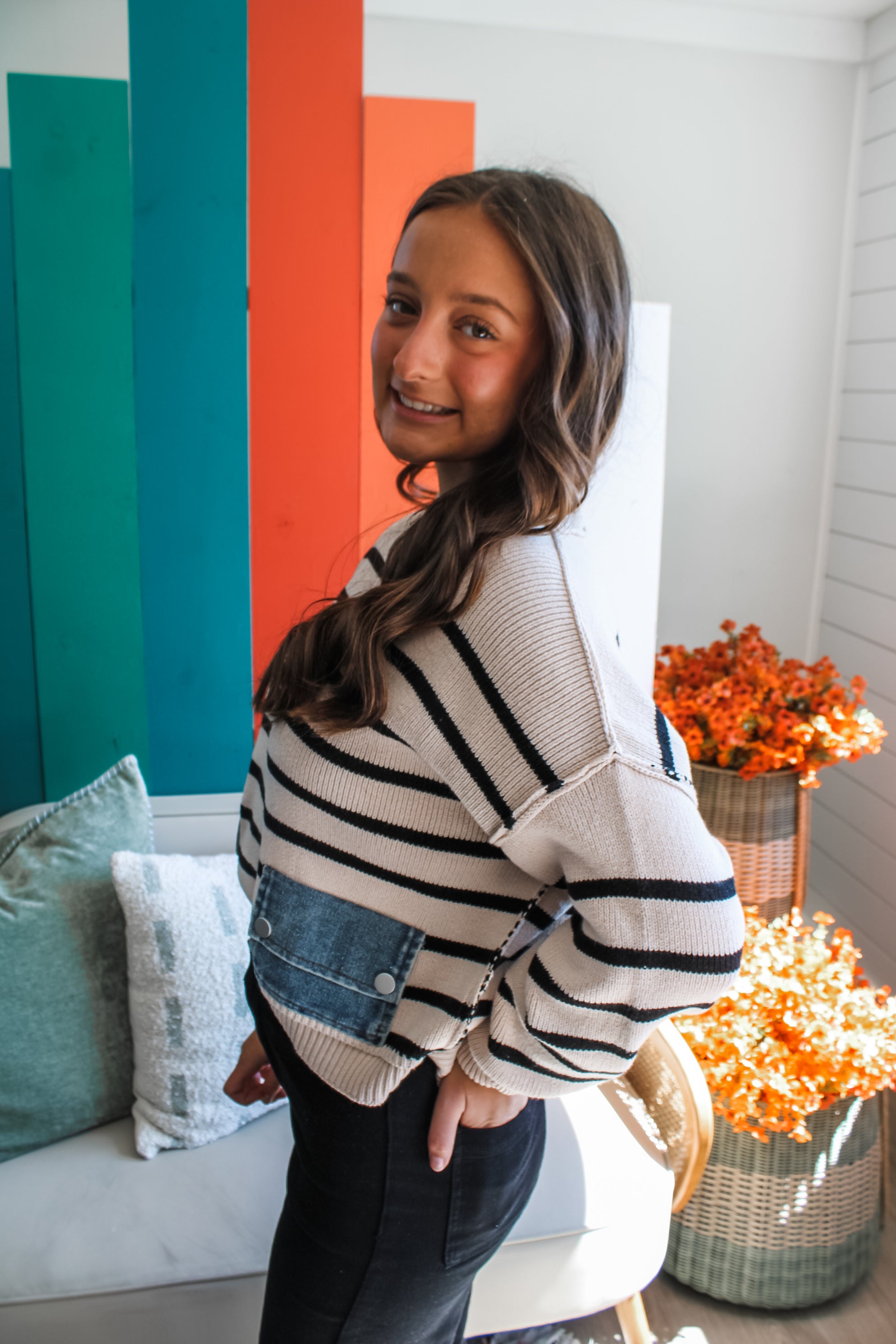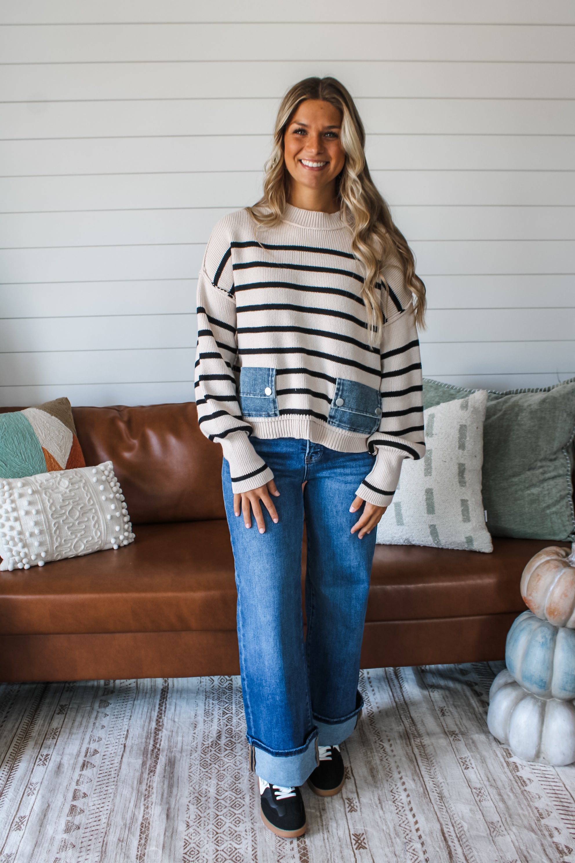 The classic striped sweater gets a modern edge with unexpected details. The double pocket design with snap button closure and light wash denim fabrication gives the timeless knit an eye-catching contrast and stylish twist. Featured in a rib knit with a crew neckline, drop shoulder sleeves and a slouchy fit.