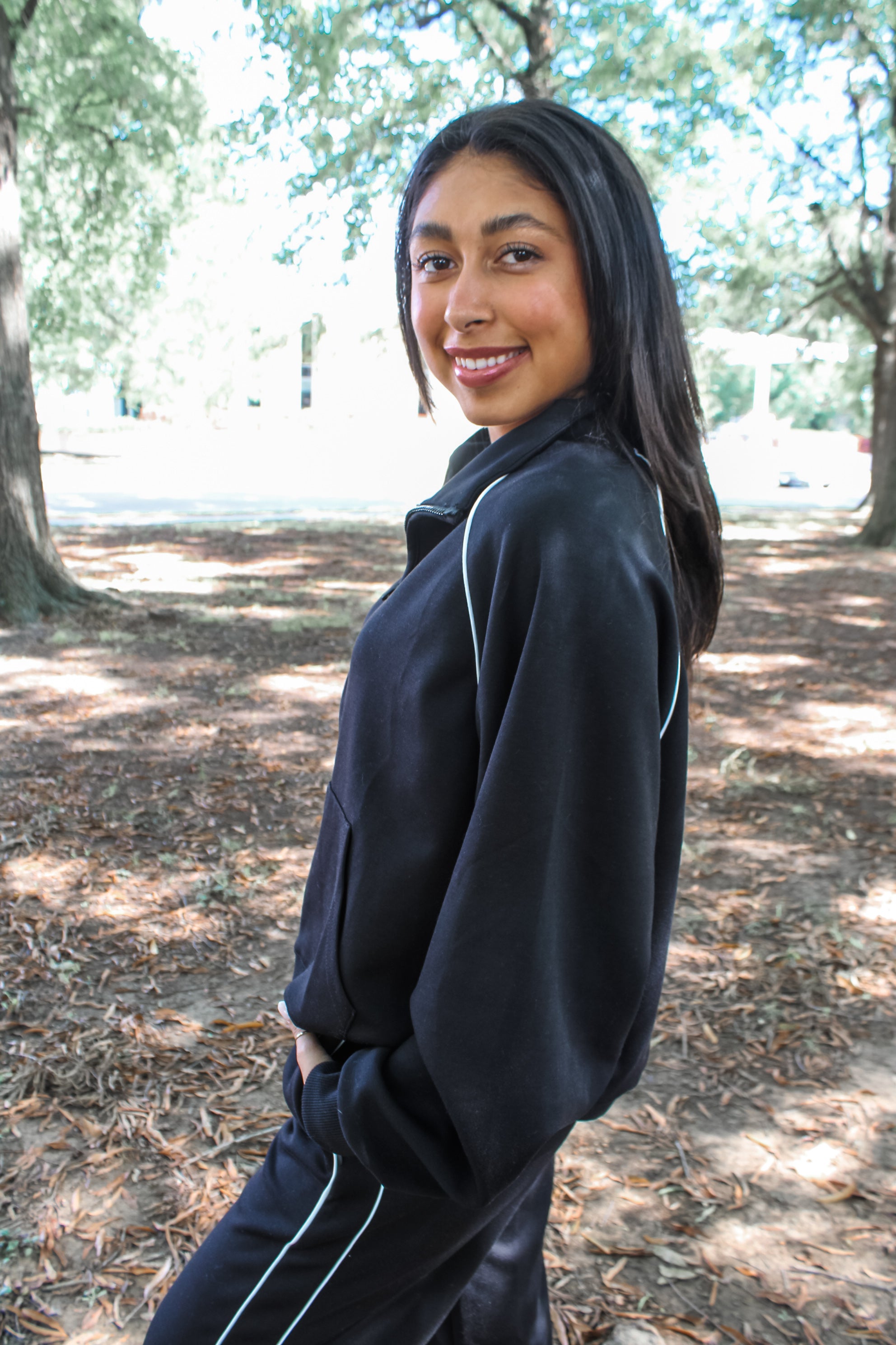 Size + fit: Runs slightly loose. S 0-6, M 6-10, L 10-12. 79% Polyester, 15% Rayon, 6% Spandex; 75% Polyester, 20% Cotton, 5% Spandex (Contrast). Model is 5’3” and wears a Small.