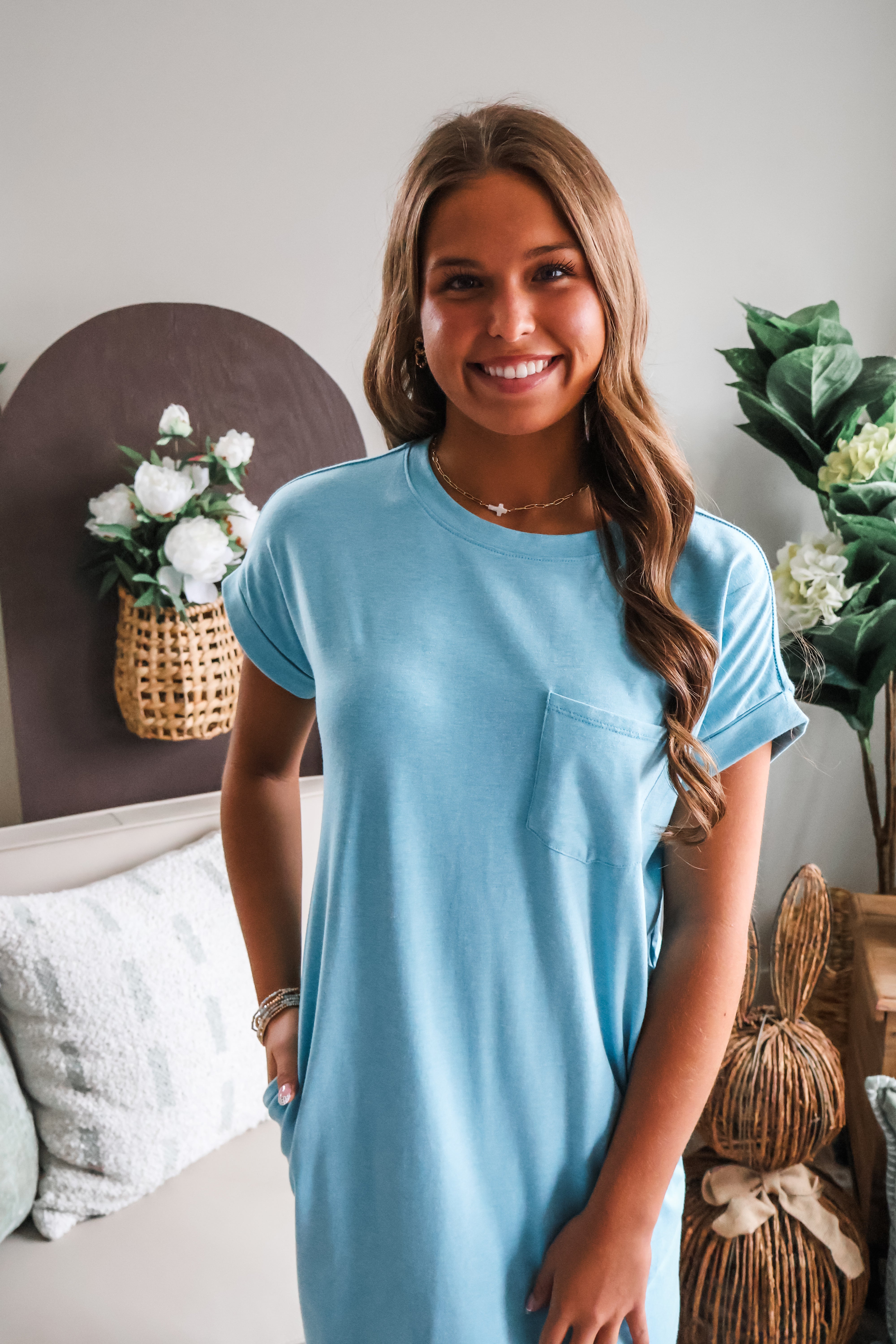 This t-shirt dress makes an effortless style statement that’s perfect for sunny days! Crafted from a heathered cotton knit for that soft and comfortable feel, with an easy and flattering straight silhouette. Featuring a crew neckline, drop shoulder sleeves, chest pocket detail, side pockets and side slit hem.