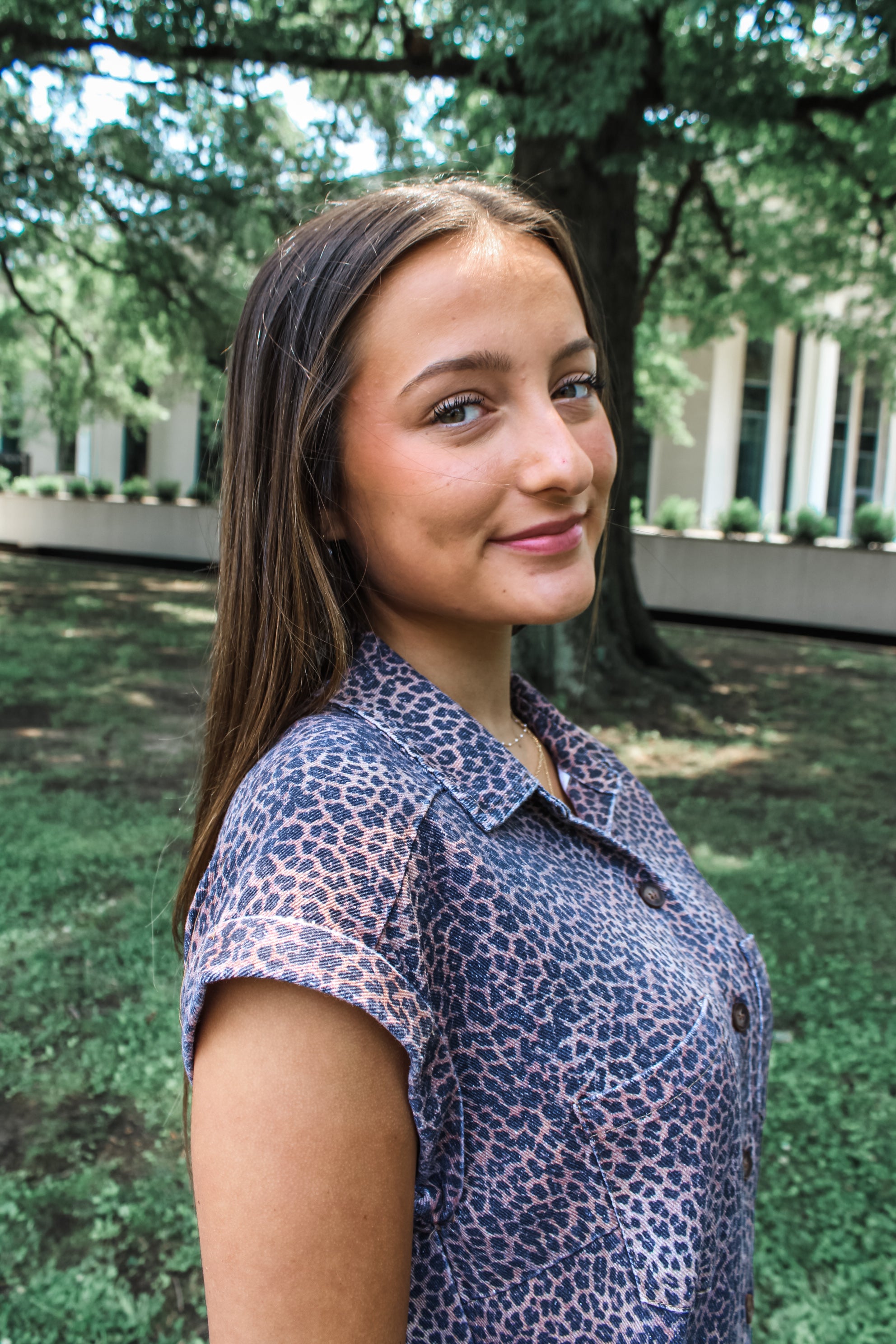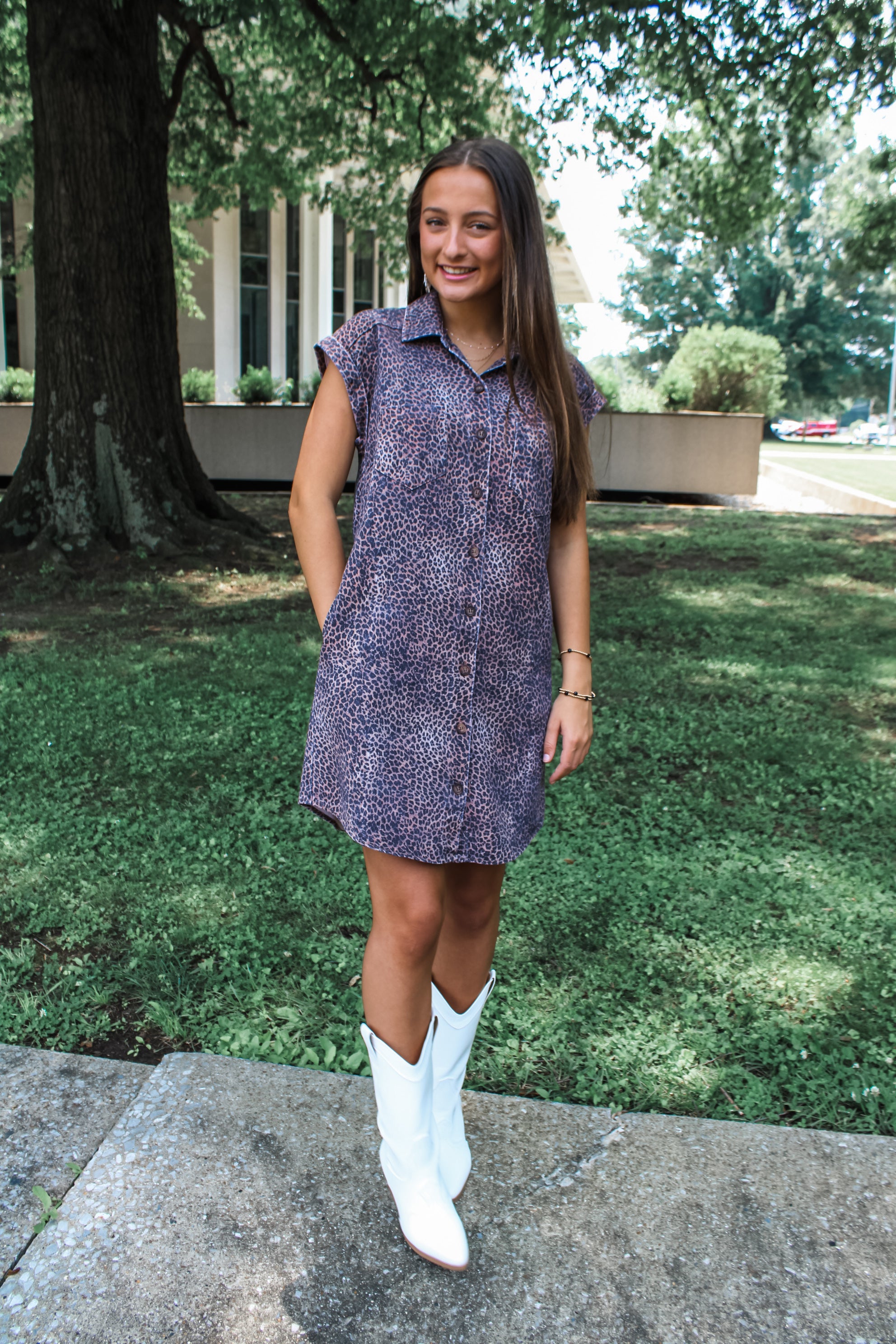 Have a leopard moment! A statement-making style without the effort, this dress will turn heads with every wear. Featuring a button up front with a collared neckline, cuffed sleeves, double chest pockets and side pockets, in a relaxed straight silhouette.