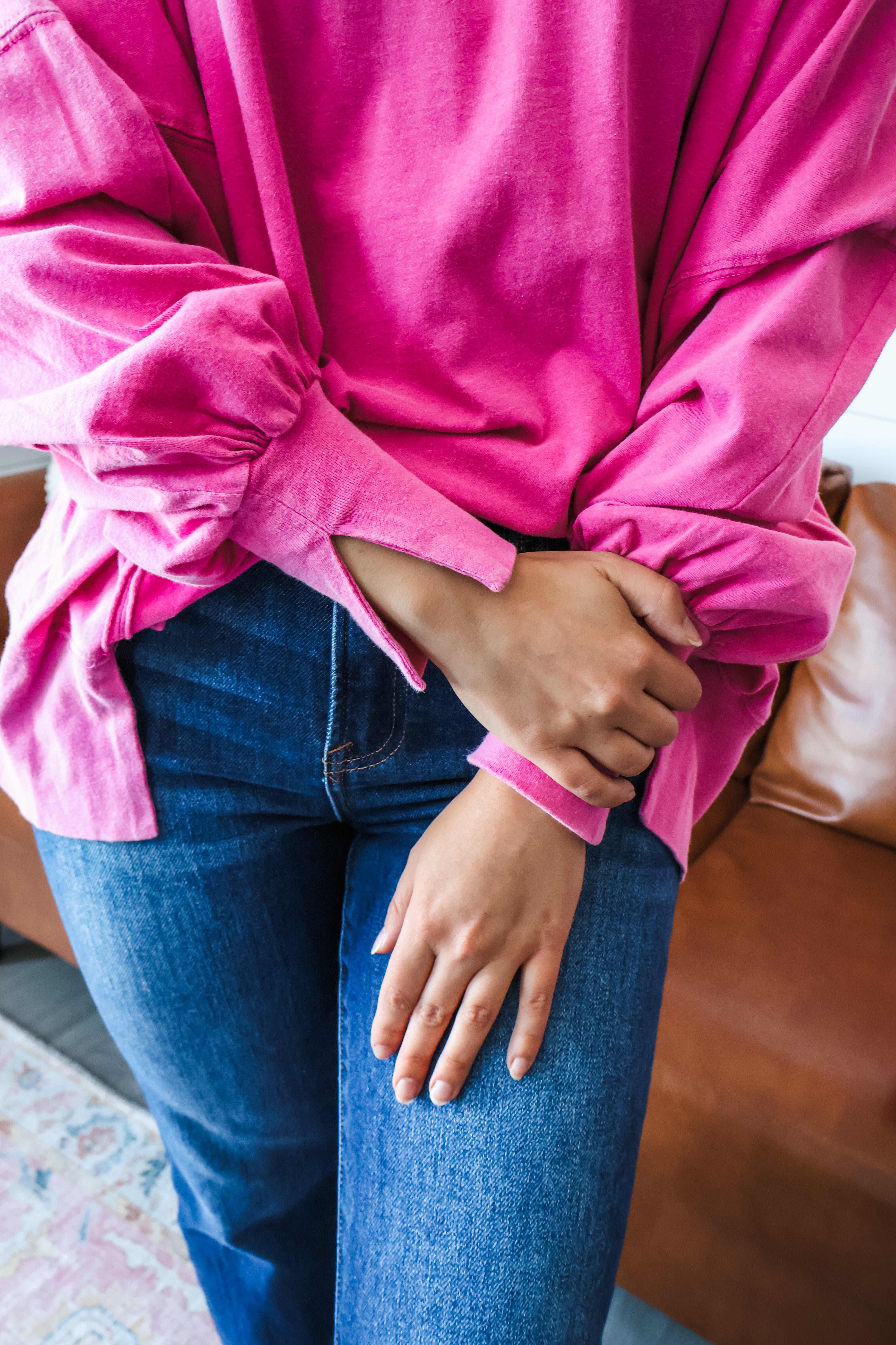 Size + fit: Oversized fit for style. S 0-8, M 8-12, L 12-16. 100% Cotton. Model is 5’3” and wears a Small.