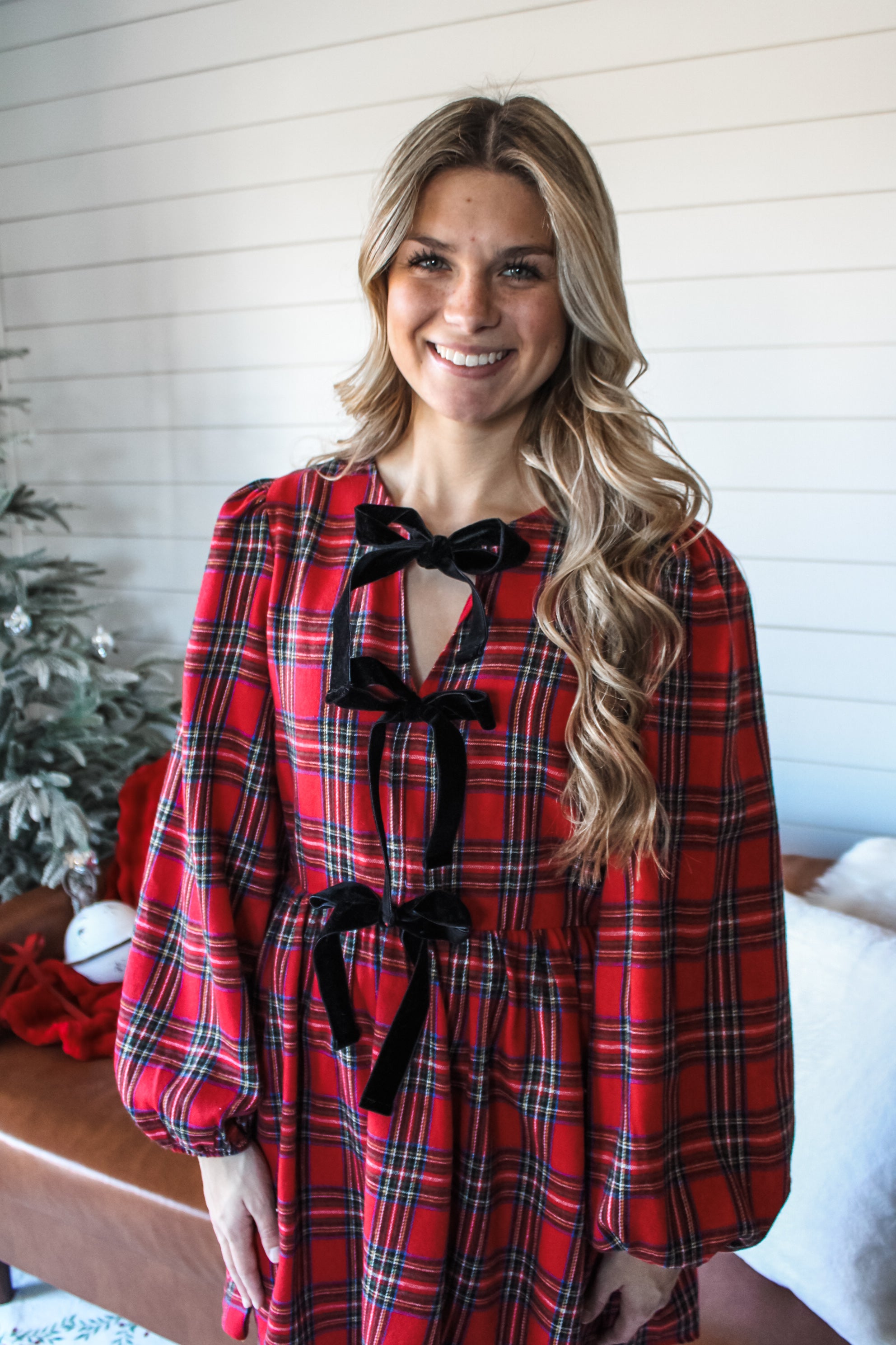 Make a sophisticated holiday statement! This red dress is a festive look that evokes elegance and charm with its velvet bow detailing and classic plaid print. Crafted from a brushed woven with a keyhole neckline, puff sleeves and a flowy hem.