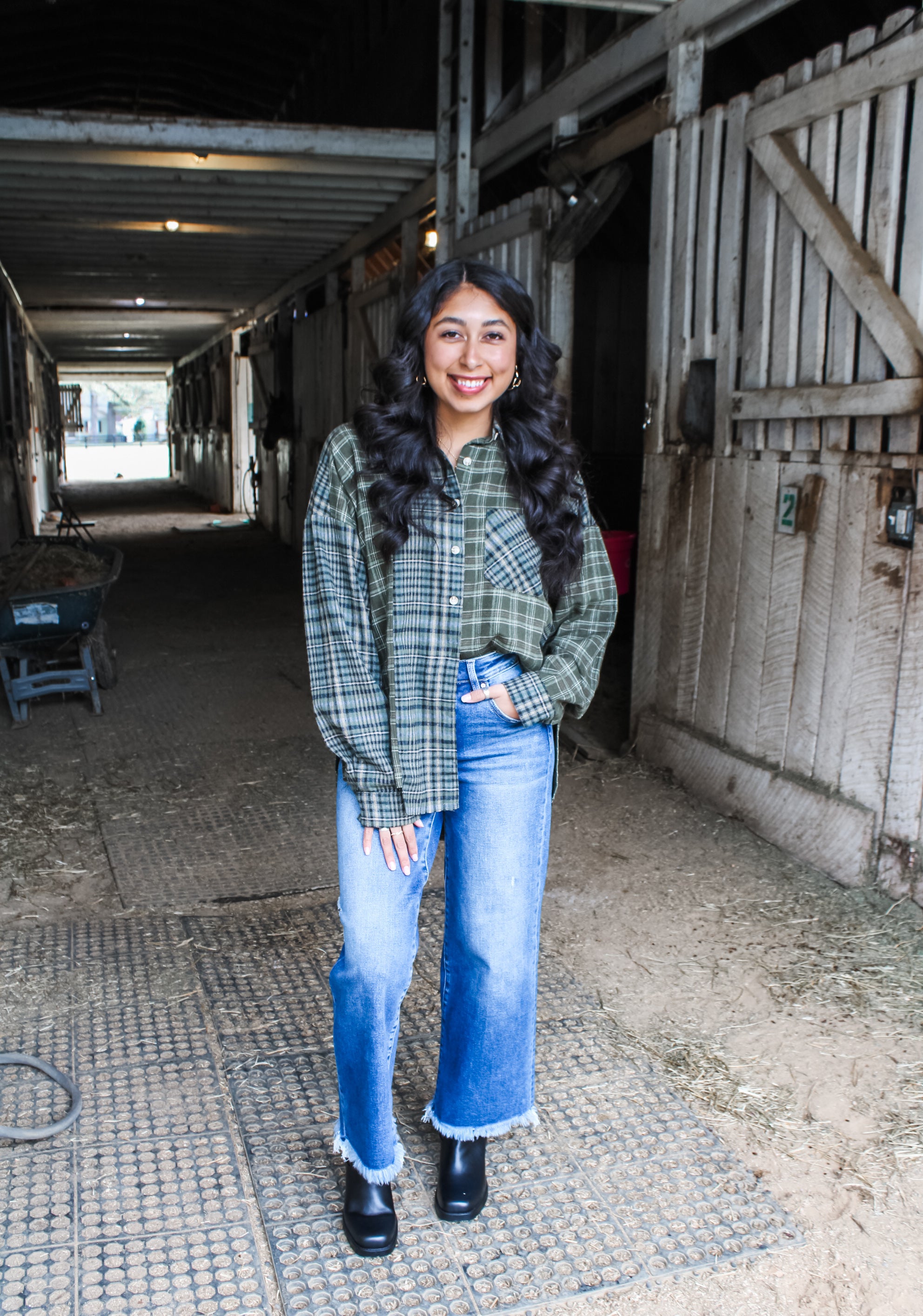 Reimagined plaid for the holidays and beyond. This flannel shirt is such a cool refresh on the quintessential style with its contrast print design and oversized silhouette. Fabricated in a soft brushed woven, it features a collared neckline, chest pocket detail, billowy sleeves and a stepped high low hem. The trendy fit gives off that cool relaxed feel and makes layering so easy. Wear on its own, or toss over basic knits, chunky sweaters and graphic tees.