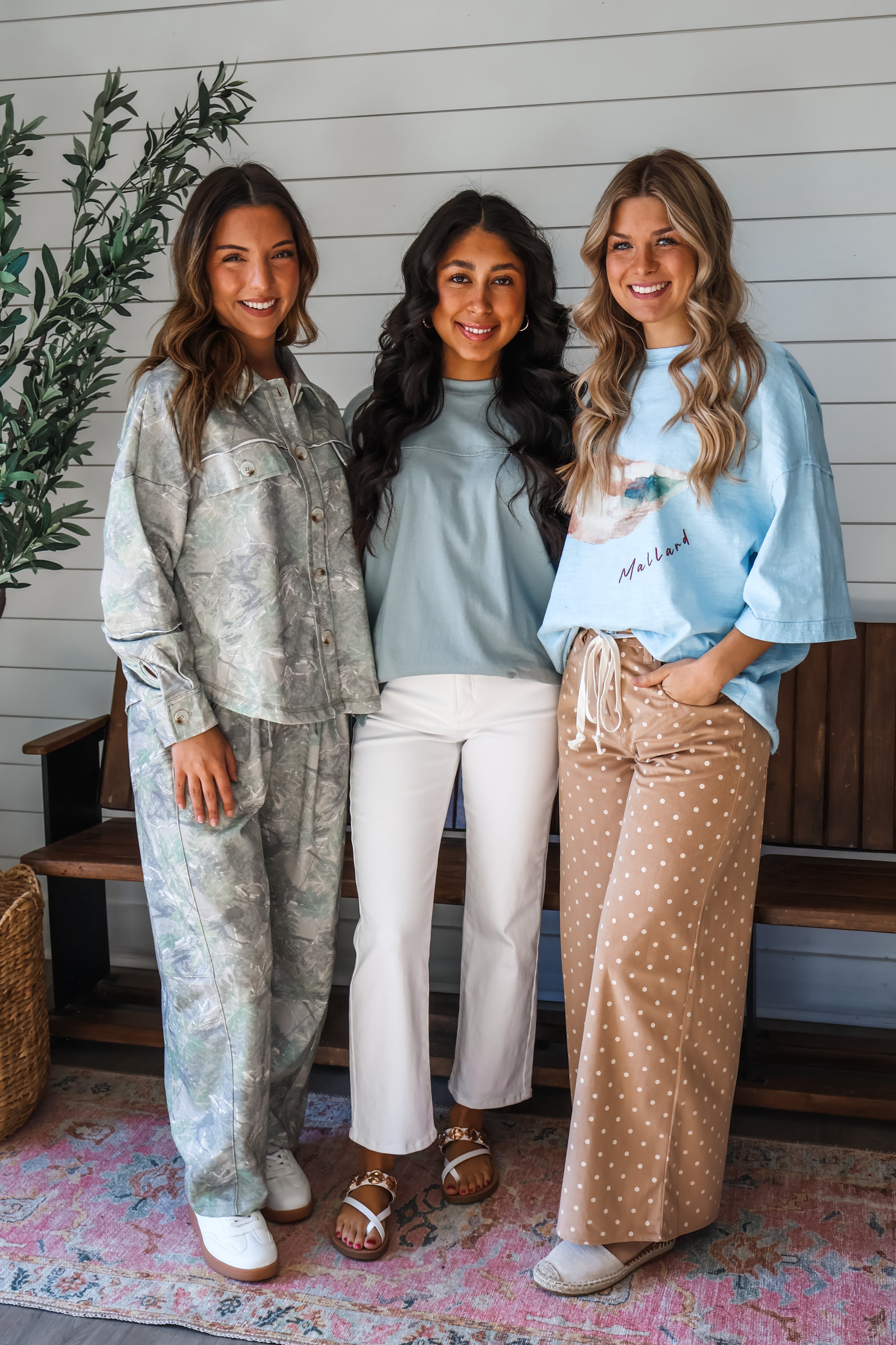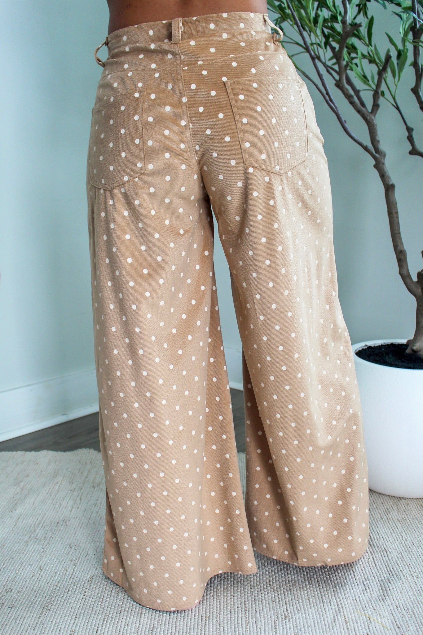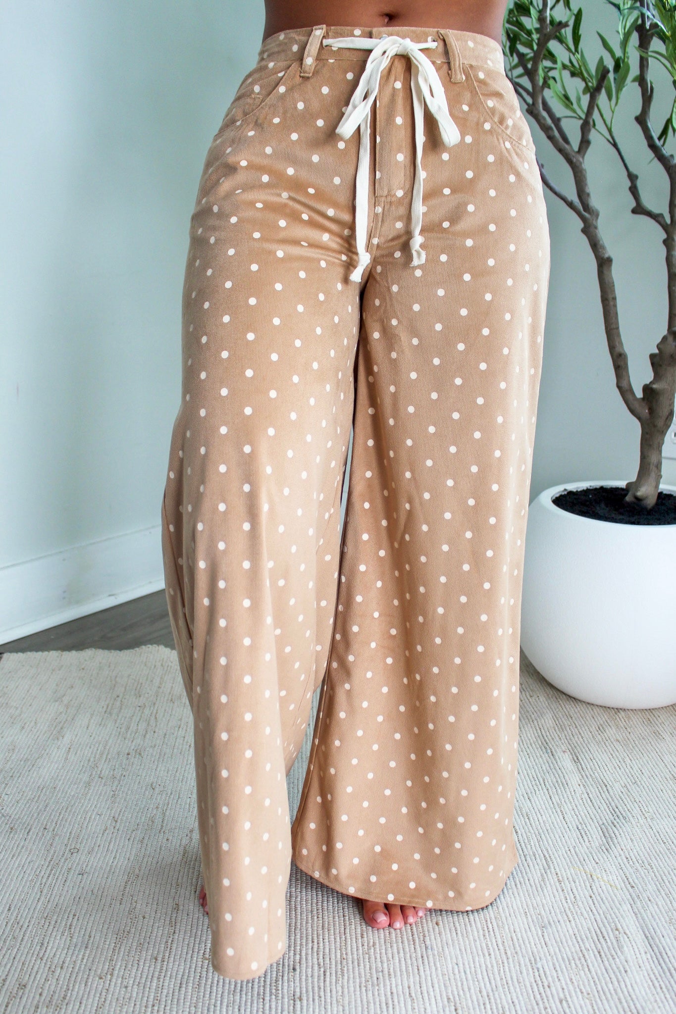 Add a pop of polka dot to your spring style! This playful and trendy pair features an adjustable drawstring waist and wide leg silhouette for a chic and comfortable fit. The lightweight fabrication gives these pants a beautiful sheen and lightweight feel, for a style that looks and feels good. With a high rise fit, 5-pocket design, single button front and zip fly closure.