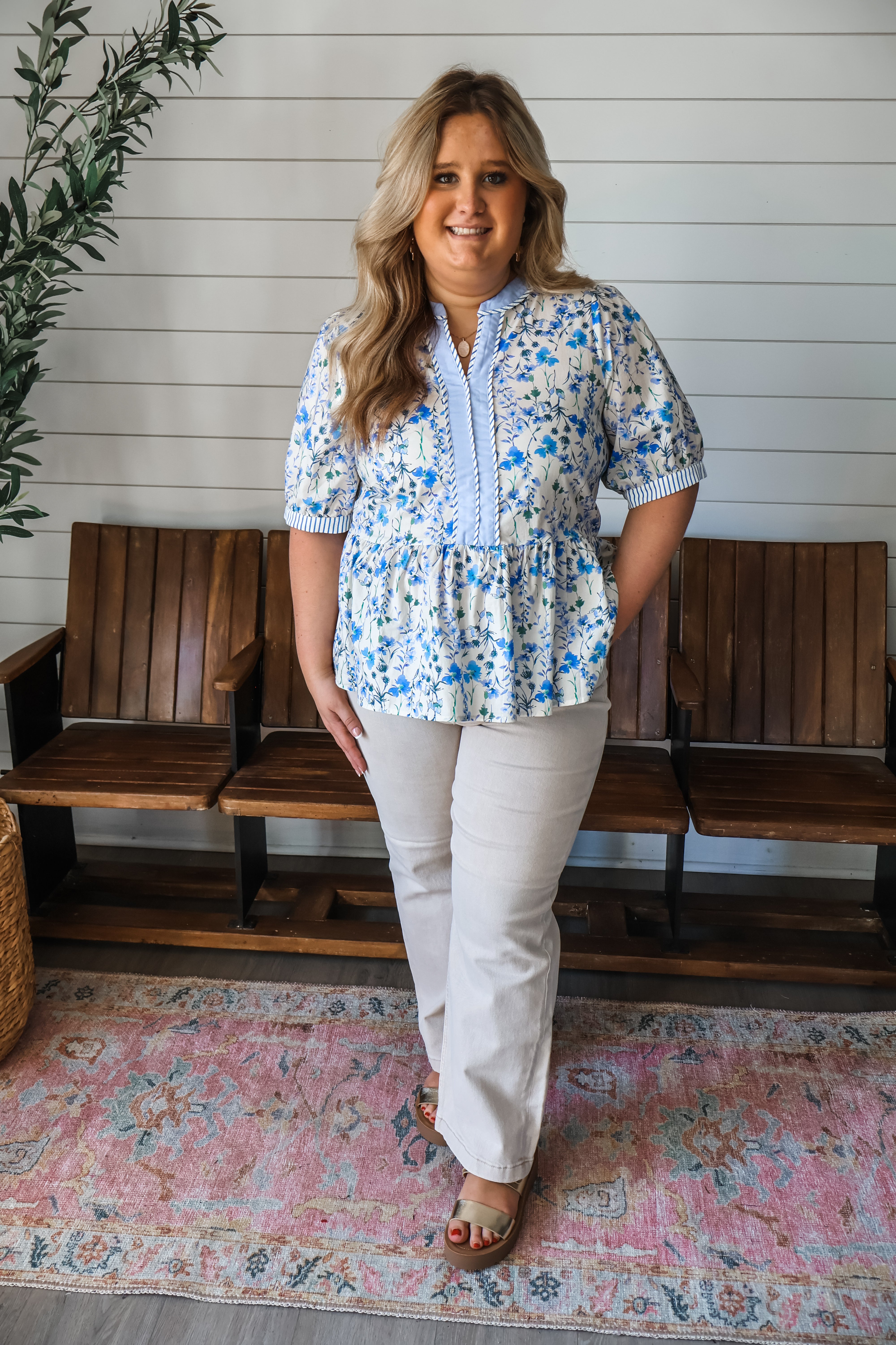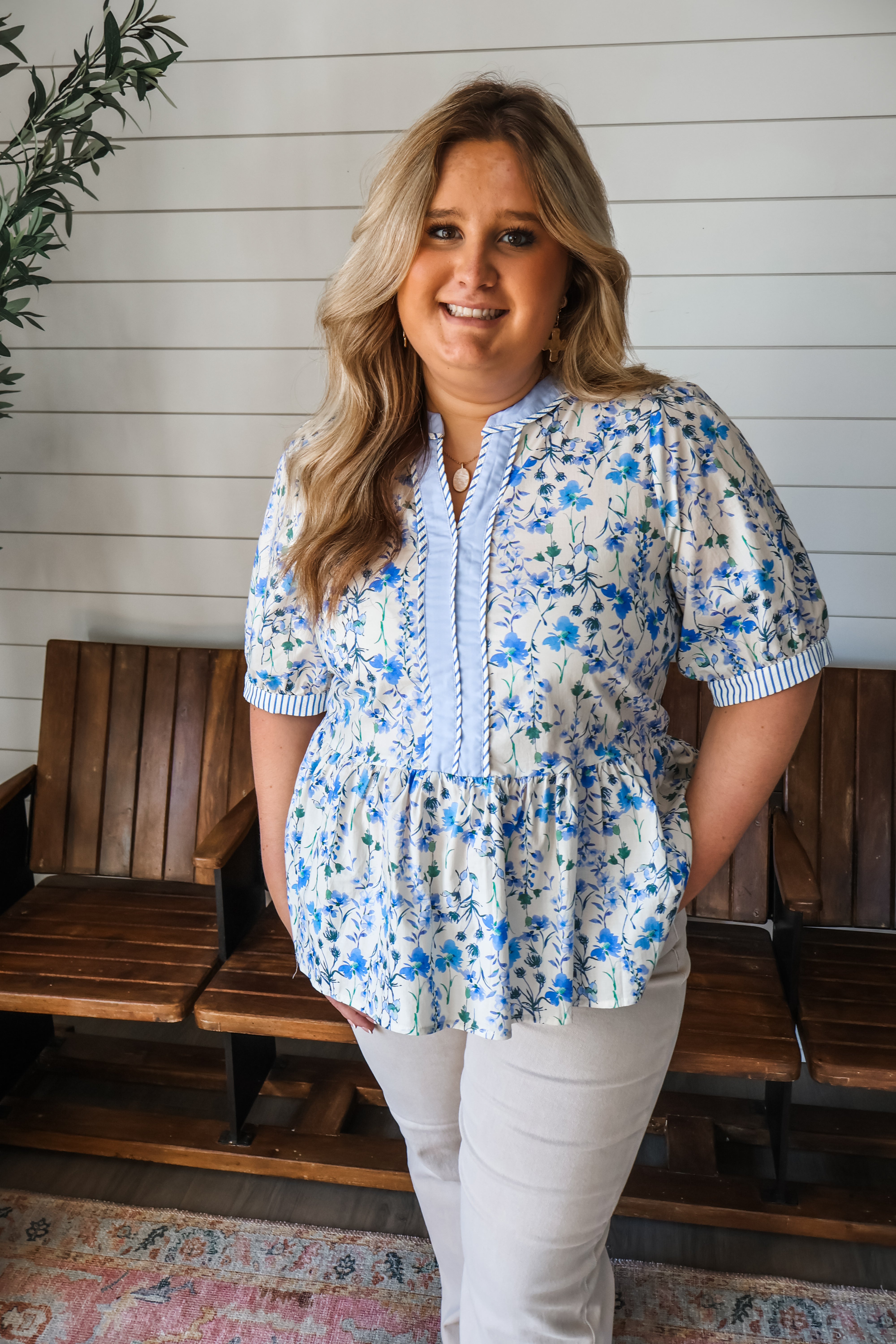 Pretty florals and feminine silhouettes to refresh your wardrobe. This blouse features a contrast trim neckline and striped piping details for a sophisticated look that stands out! The puff sleeves give it a charming flair, while the flowy silhouette provides an effortless fit. Crafted from a lightweight cotton woven with a ruffle peplum hem.