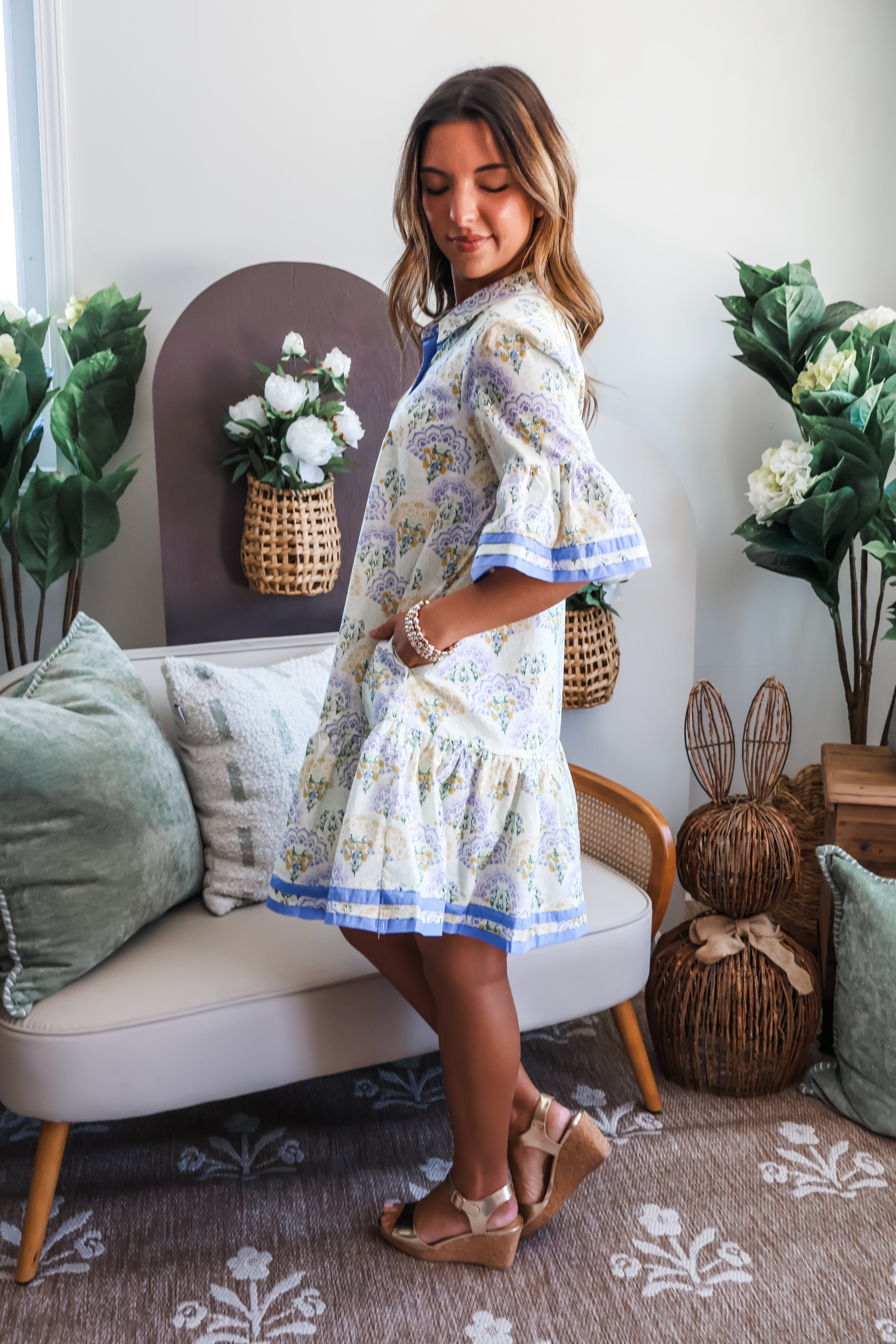Step into spring with statement-making florals! This shirtdress perfectly encapsulates spring with its dreamy print and flowy silhouette. Crafted from a lightweight cotton woven, it features a collared neckline, full button front, hidden side pockets, contrast trim details, bell sleeves and a ruffle trim hem