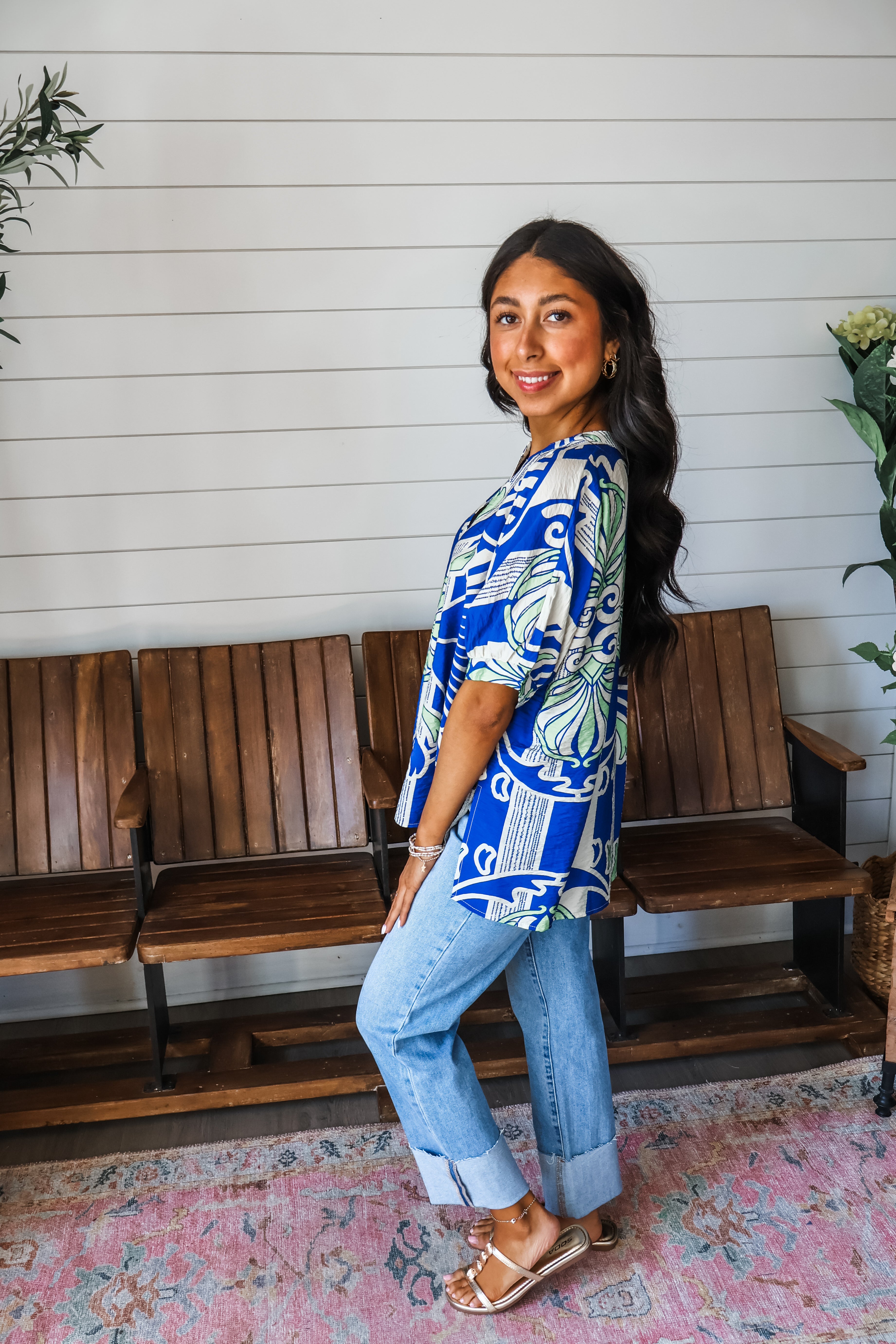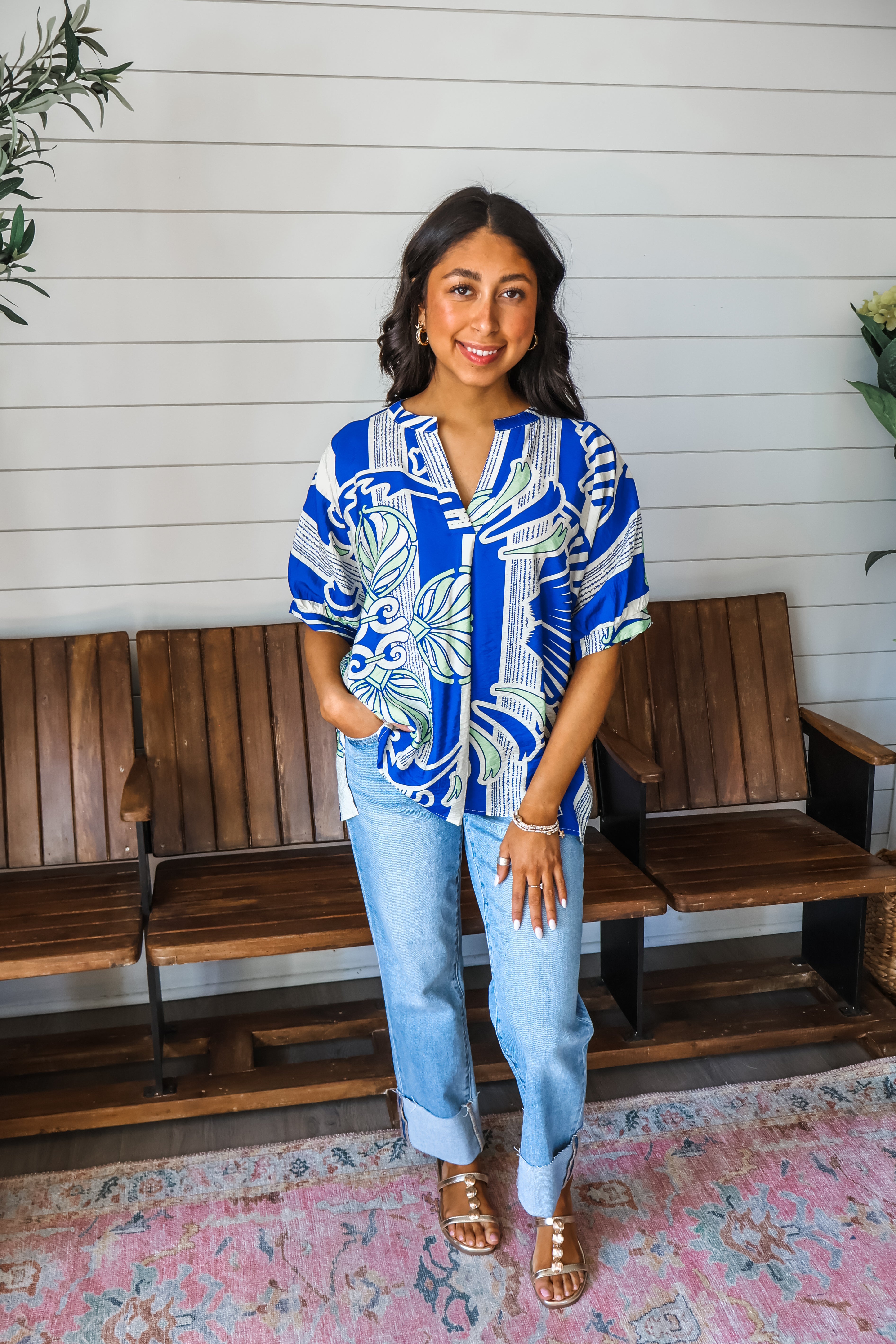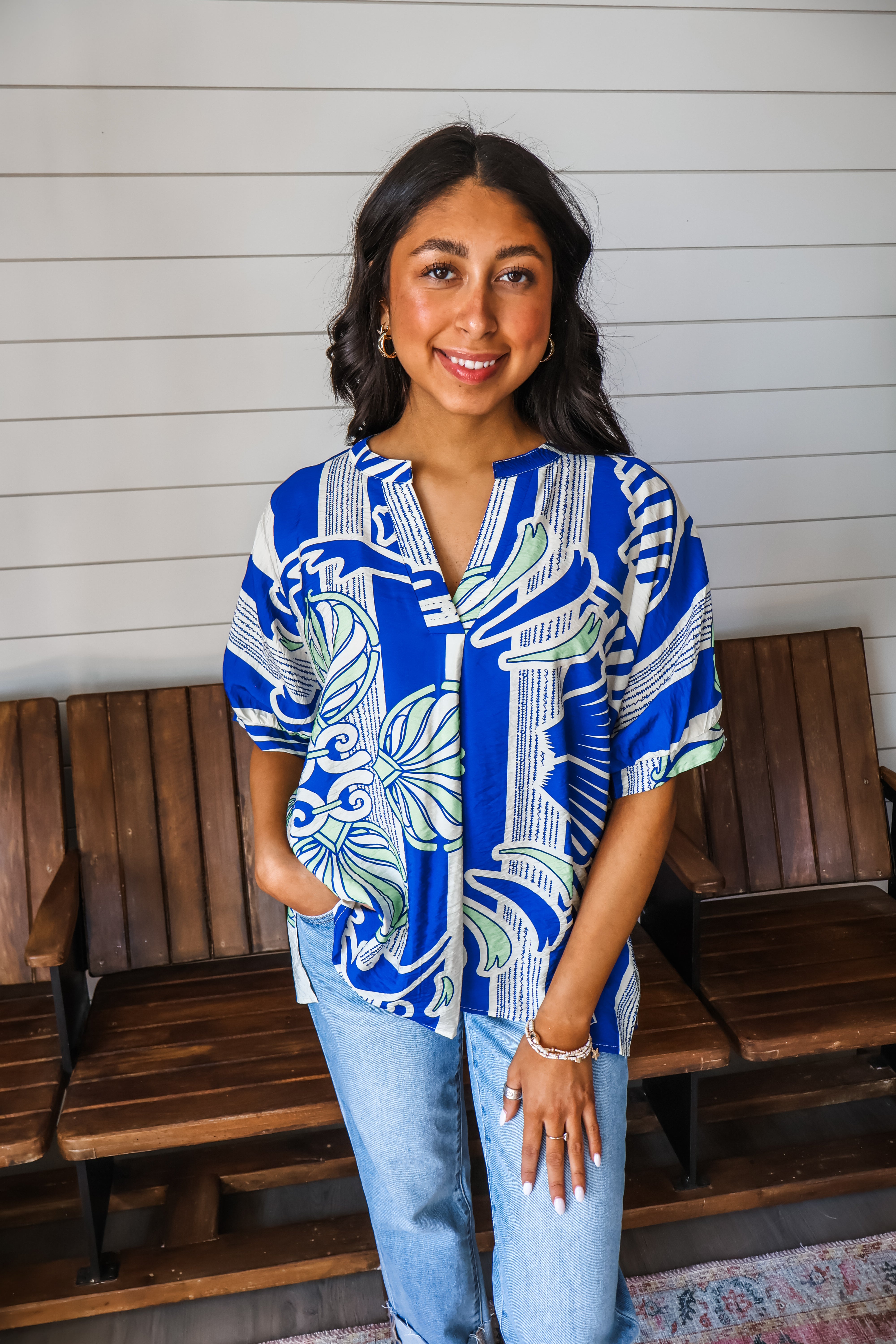 Refresh your spring style with striking prints! This top is a standout look whether you dress it up or down! Crafted from a lightweight textured fabrication, it features a notched v-neckline with a front pleat detail and side slit hem. The breezy dolman silhouette provides a flowy and comfortable fit that flatters all.