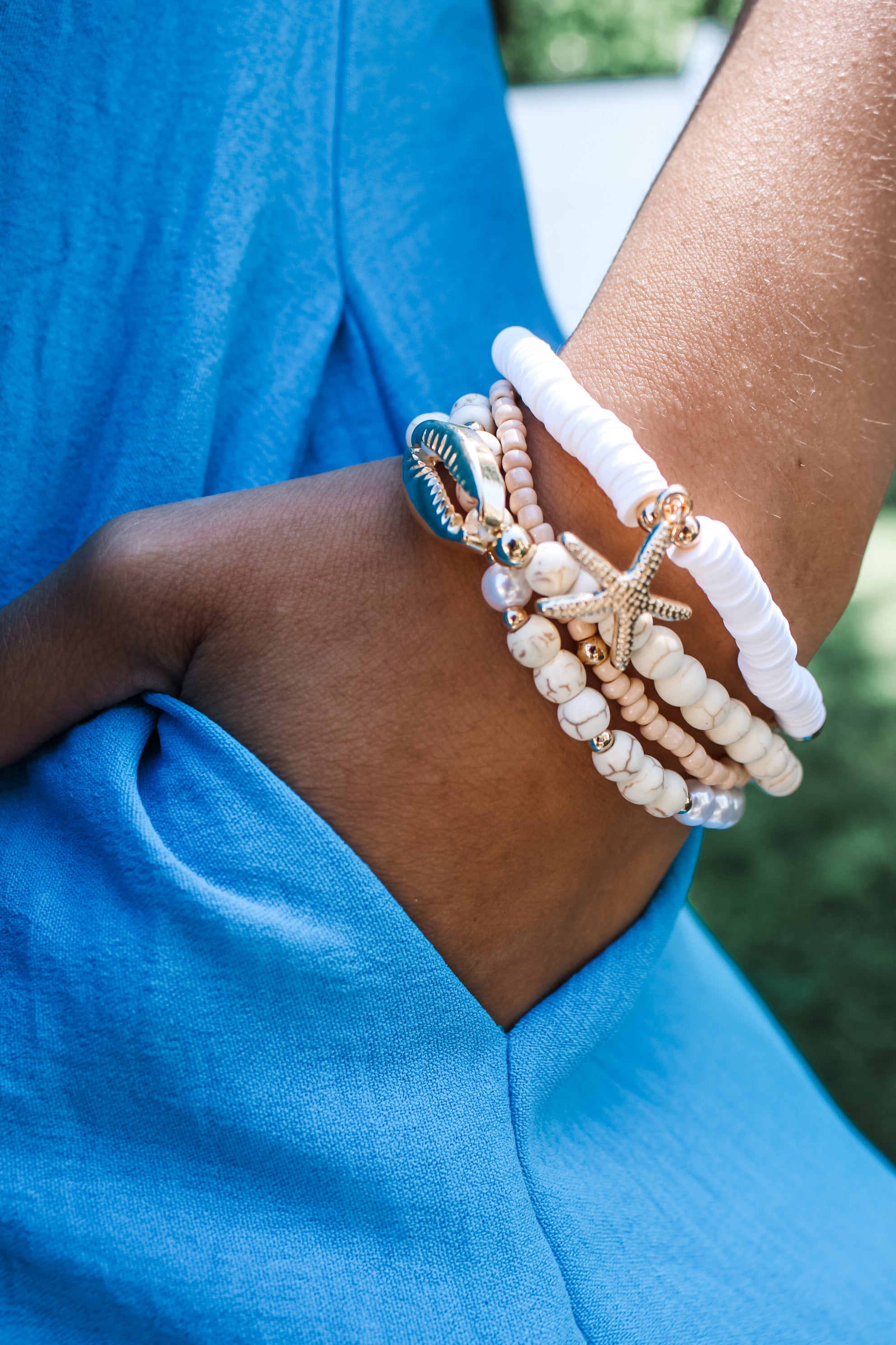 Add a coastal chic touch to your summer looks! This stretch bracelet set features mixed beads and gold charms for a seaside-inspired style that’s both trendy and timeless. Materials may have natural variations. Colors may vary from different viewing devices and lighting. Final sale item.