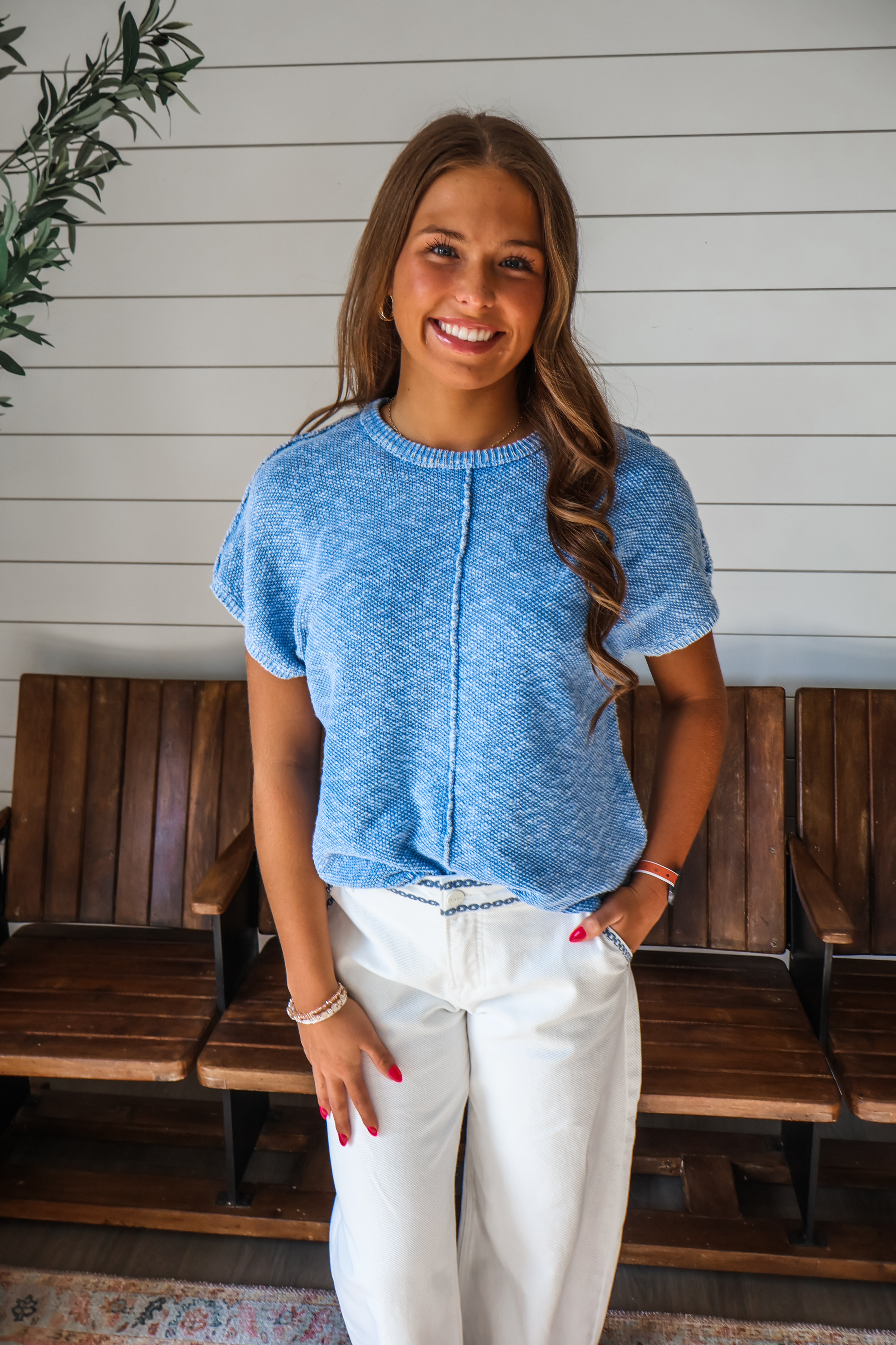 Soak up the sun with this eye-catching top! The mineral-washed textured knit and relaxed silhouette lend it a breezy feel that’s perfect for sunny days and coastal getaways! Featuring exposed seaming details for added interest and texture, a classic crewneck and rolled edge hem.
