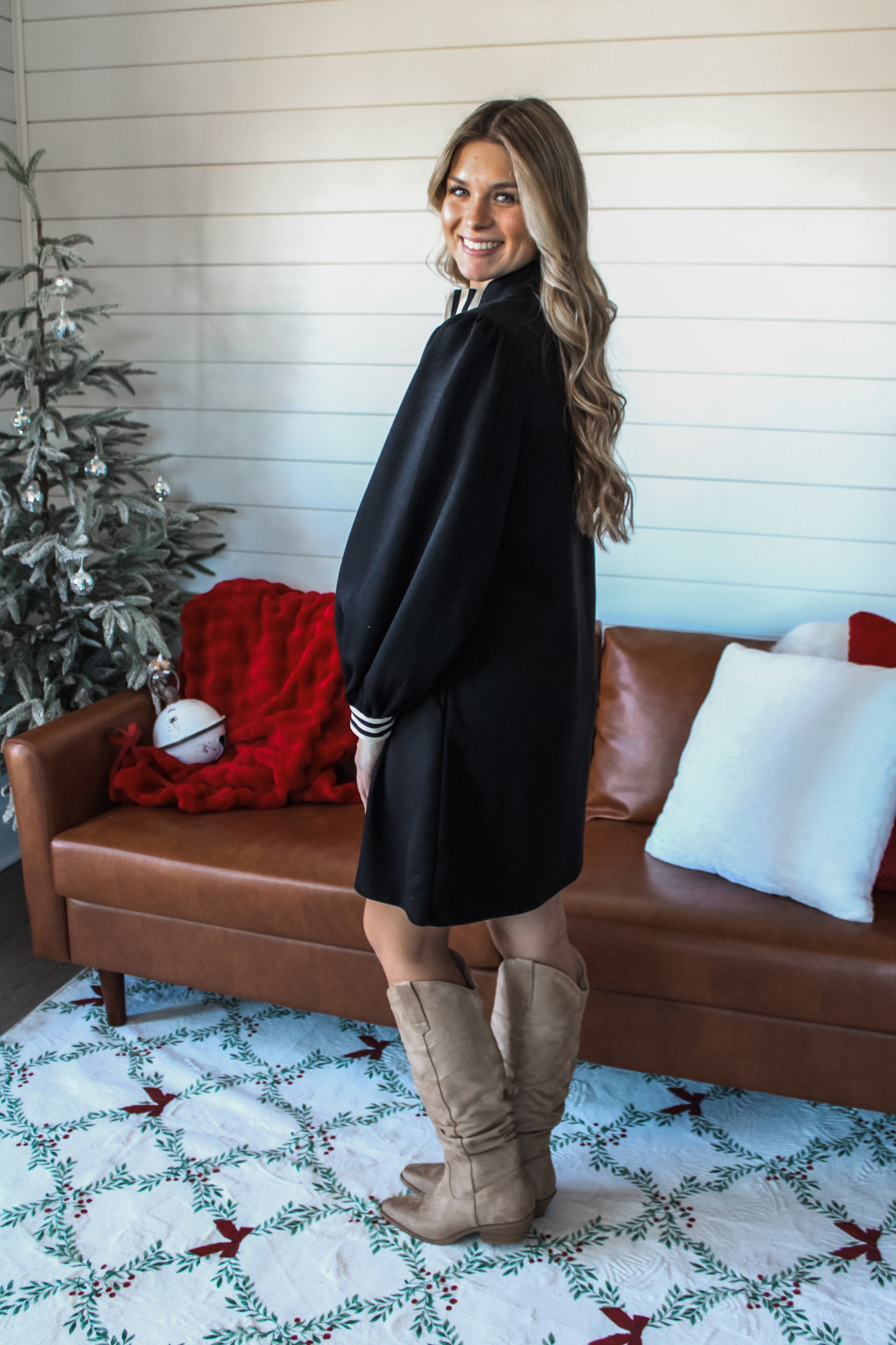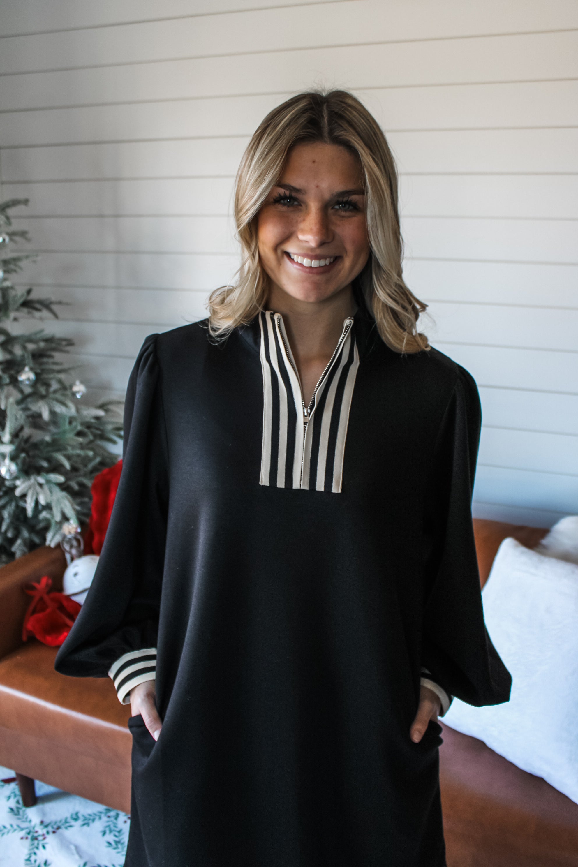 Equal parts current and classic, you can style this pocket dress for the office, family gatherings and special occasions. Fabricated in a smooth knit that flows over the body beautifully, with a striped trim design for contrast and character. Featuring a standing collar with a zip neckline, puff lantern sleeves and an a-line silhouette that flatters all. It’s a polished staple you’ll keep reaching for season after season.