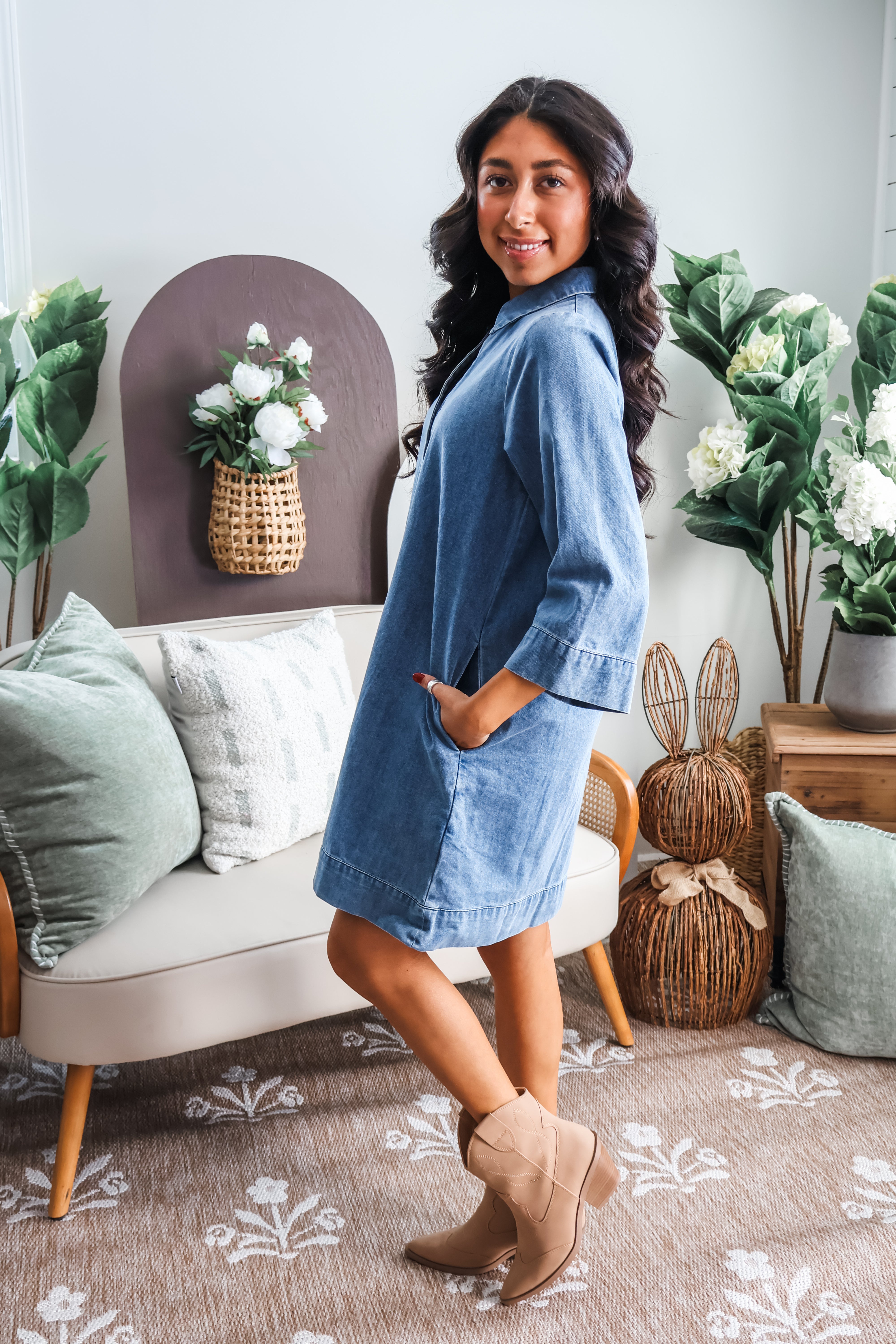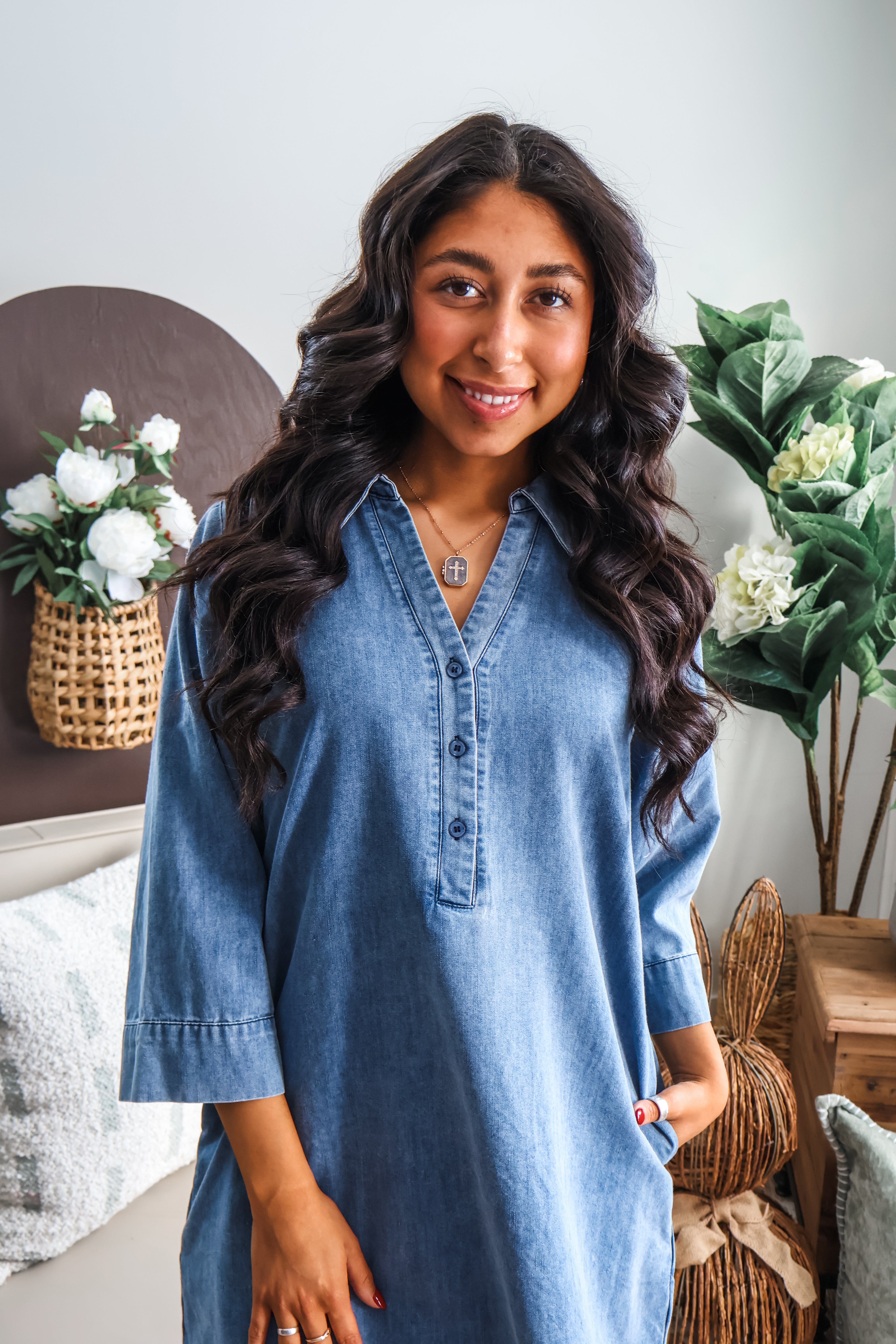 Step into spring in effortless denim. Featured a perfectly faded fabrication for that vintage-inspired edge, this dress is a timeless staple with endless styling possibilities. Featuring a collared neckline with a partial button up front, 3/4 length sleeves, oh-so-essential side pockets and a relaxed straight silhouette flatters all.