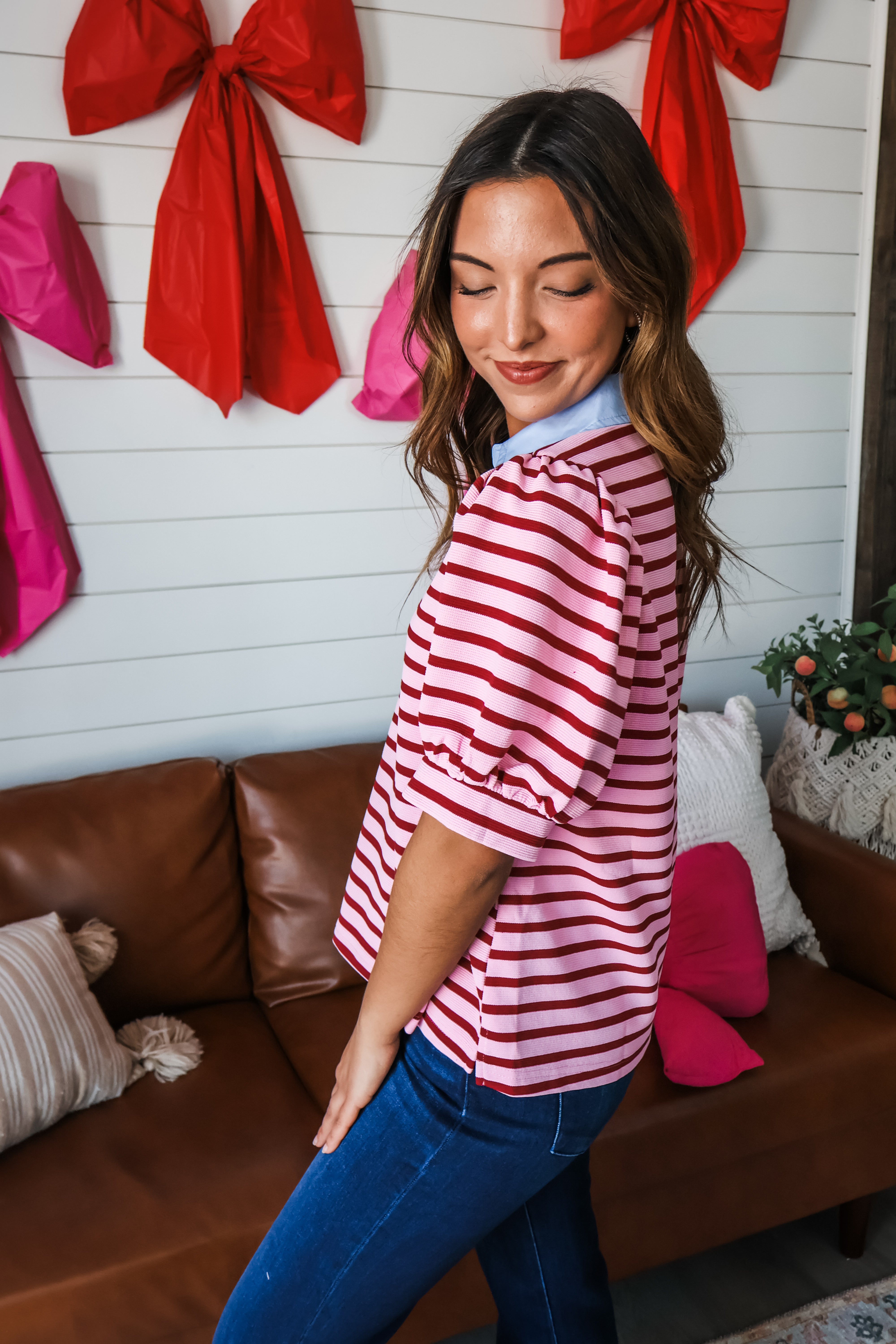So effortless and chic, this striped top is a standout look for work or play! The woven contrast design and puff sleeves give it a polished flair, while flowy silhouette provides an easy flattering fit. Crafted from a soft rib knit with a collared neckline and side slit hem.