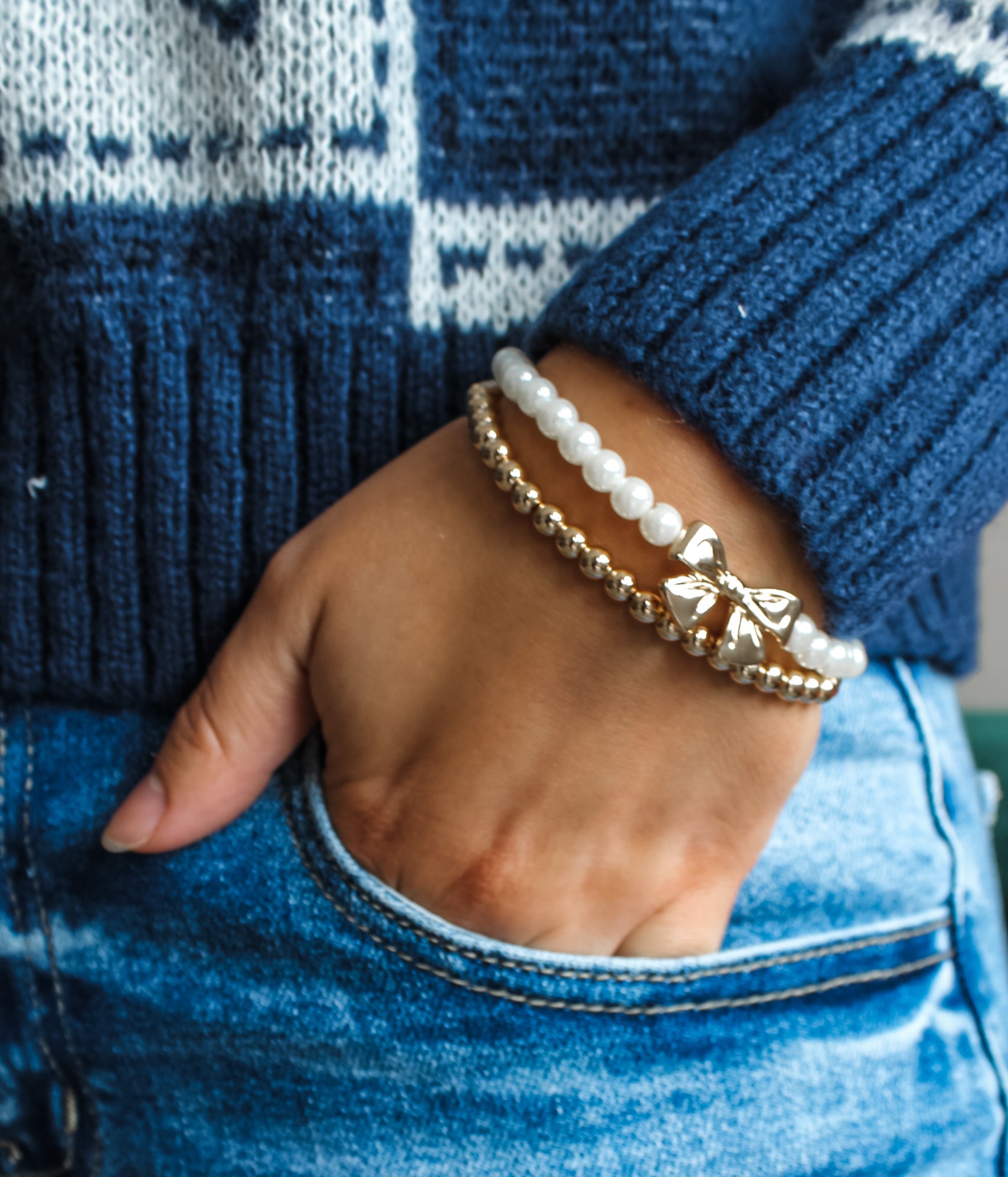 Step up your holiday style with the cutest jewelry! This 2-piece stretch bracelet features a pearl and gold bauble strand with a bow charm. It’s a playful yet polished look that’s on-trend! Materials may have natural variations. Colors may vary from different viewing devices and lighting. Final sale item.