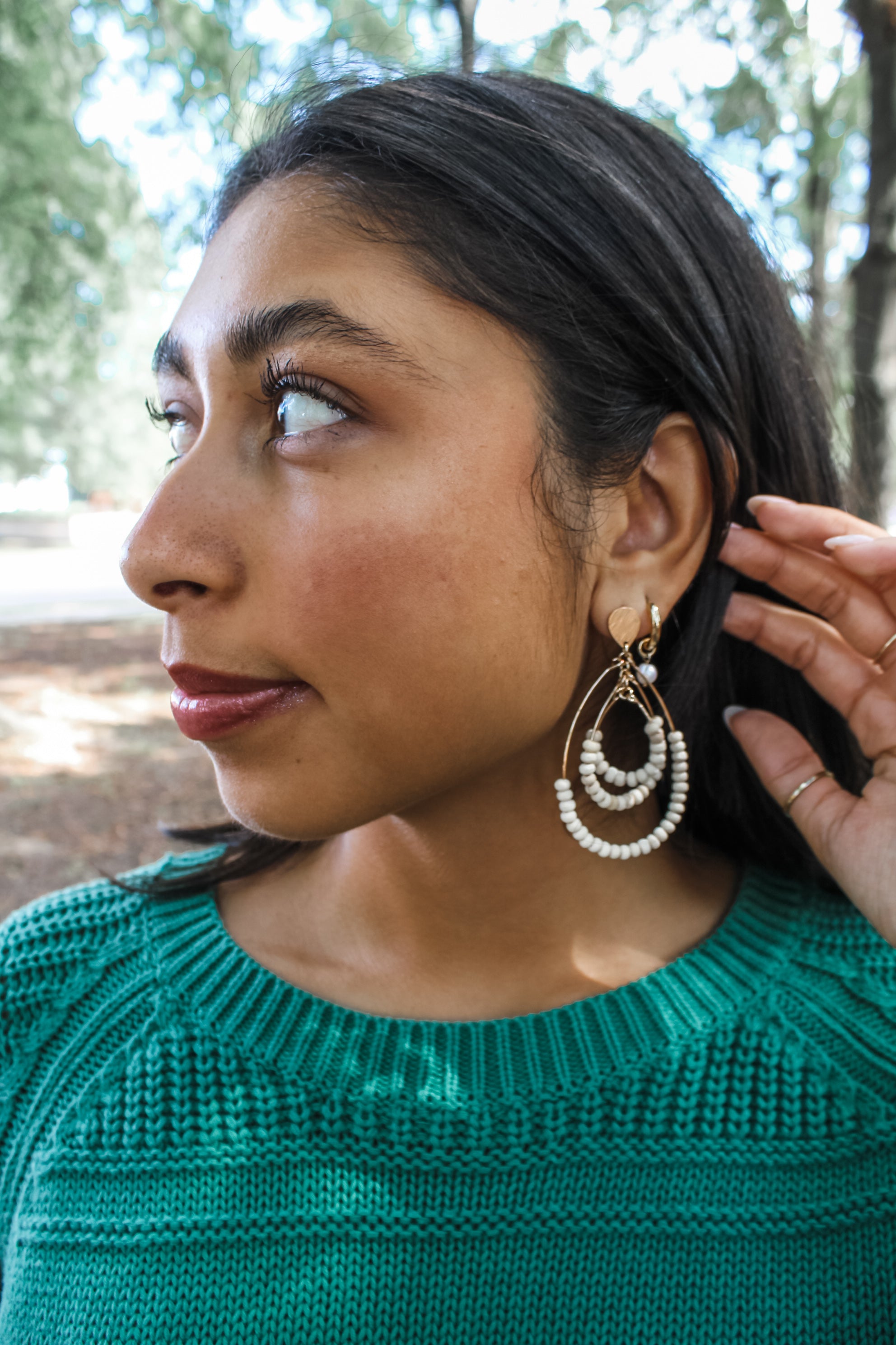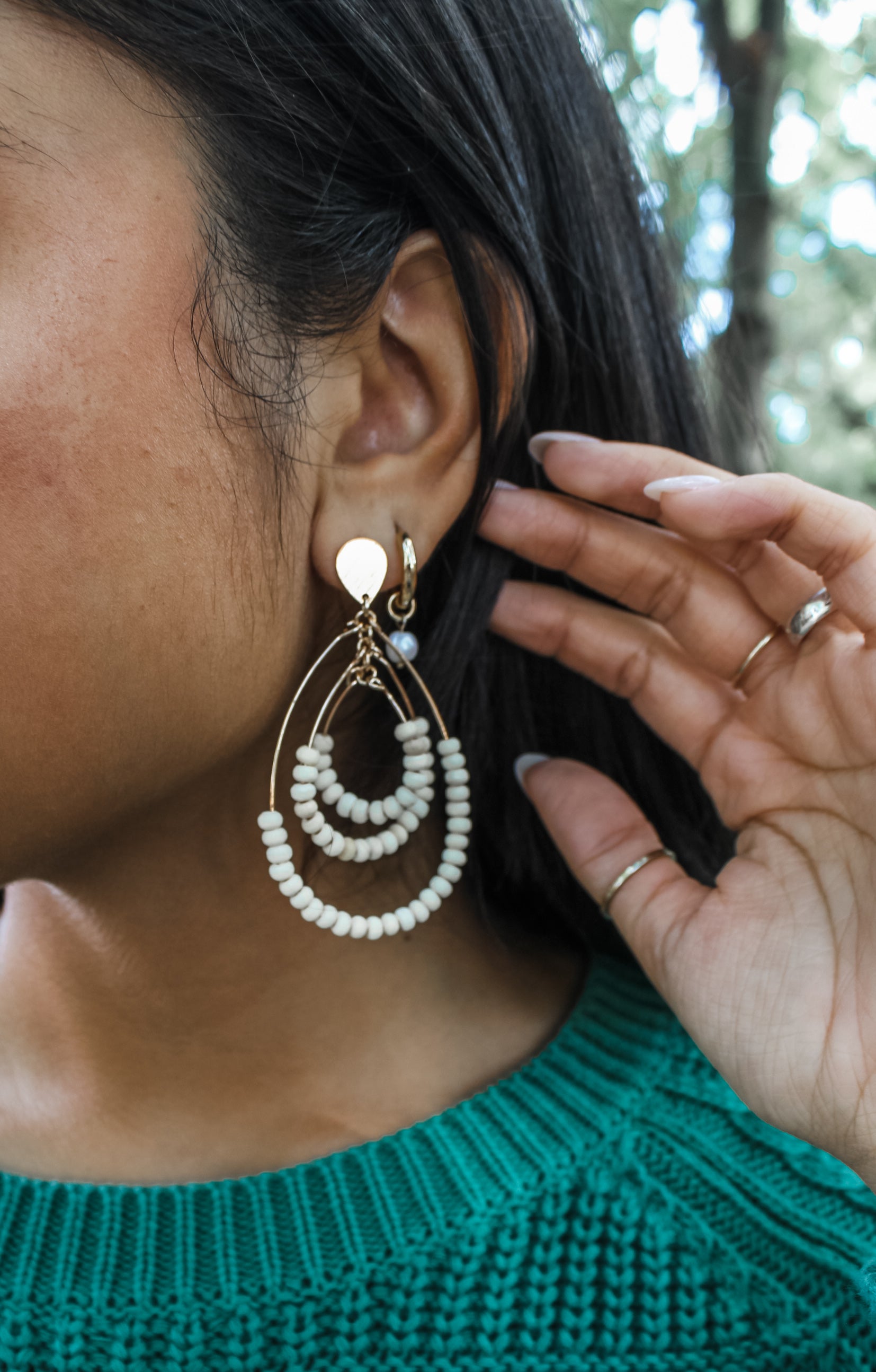 Elevate your everyday style with these chic teardrop earrings! Featuring natural wood beads and a 3-tiered hoop design with a post back closure.