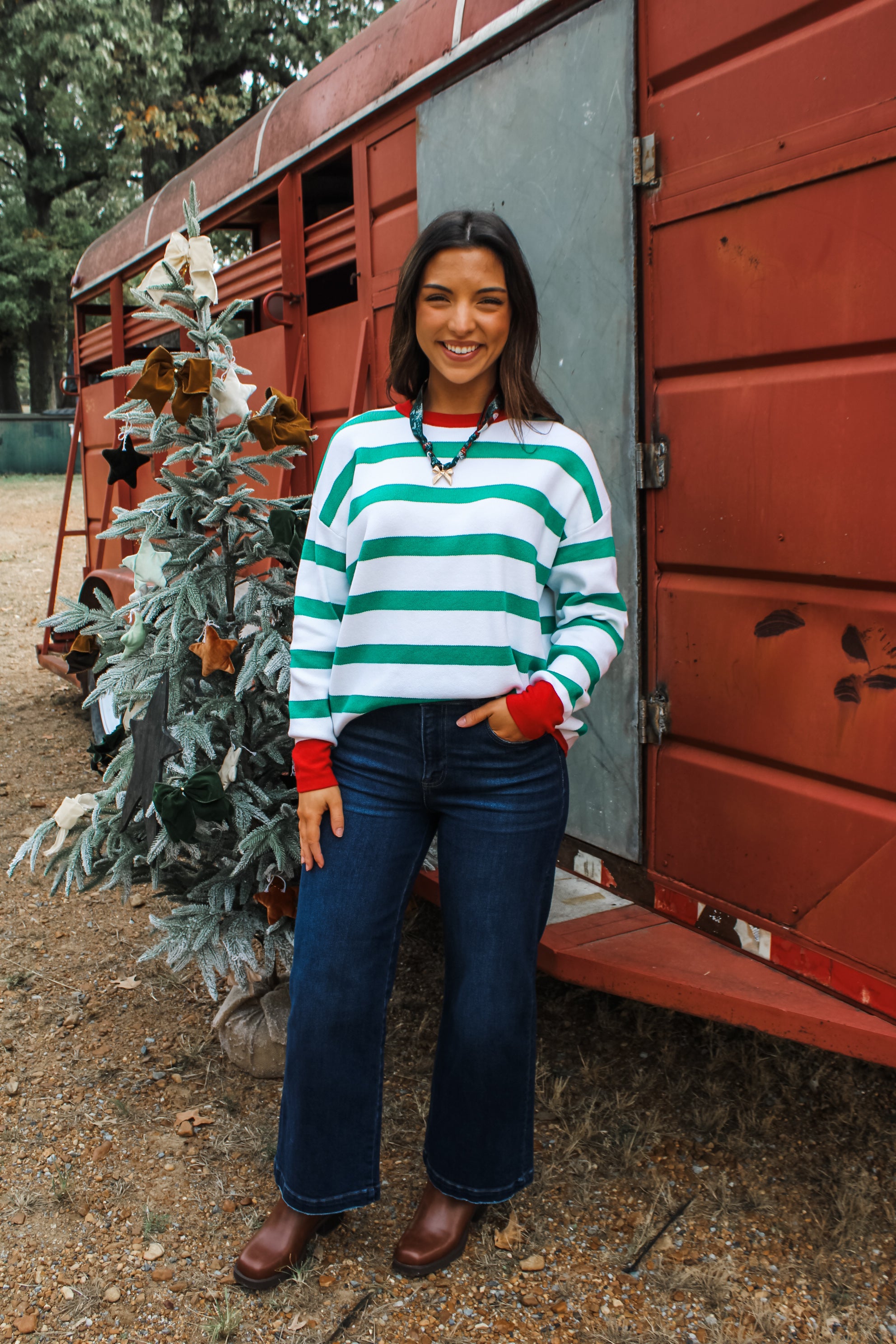 Cute and festive stripes for a cheerful holiday style! This timeless classic is fabricated in a soft luxe knit with a relaxed silhouette for an easy styling and an effortless fit. With a crew neckline, ringer contrast design and drop shoulder sleeves.