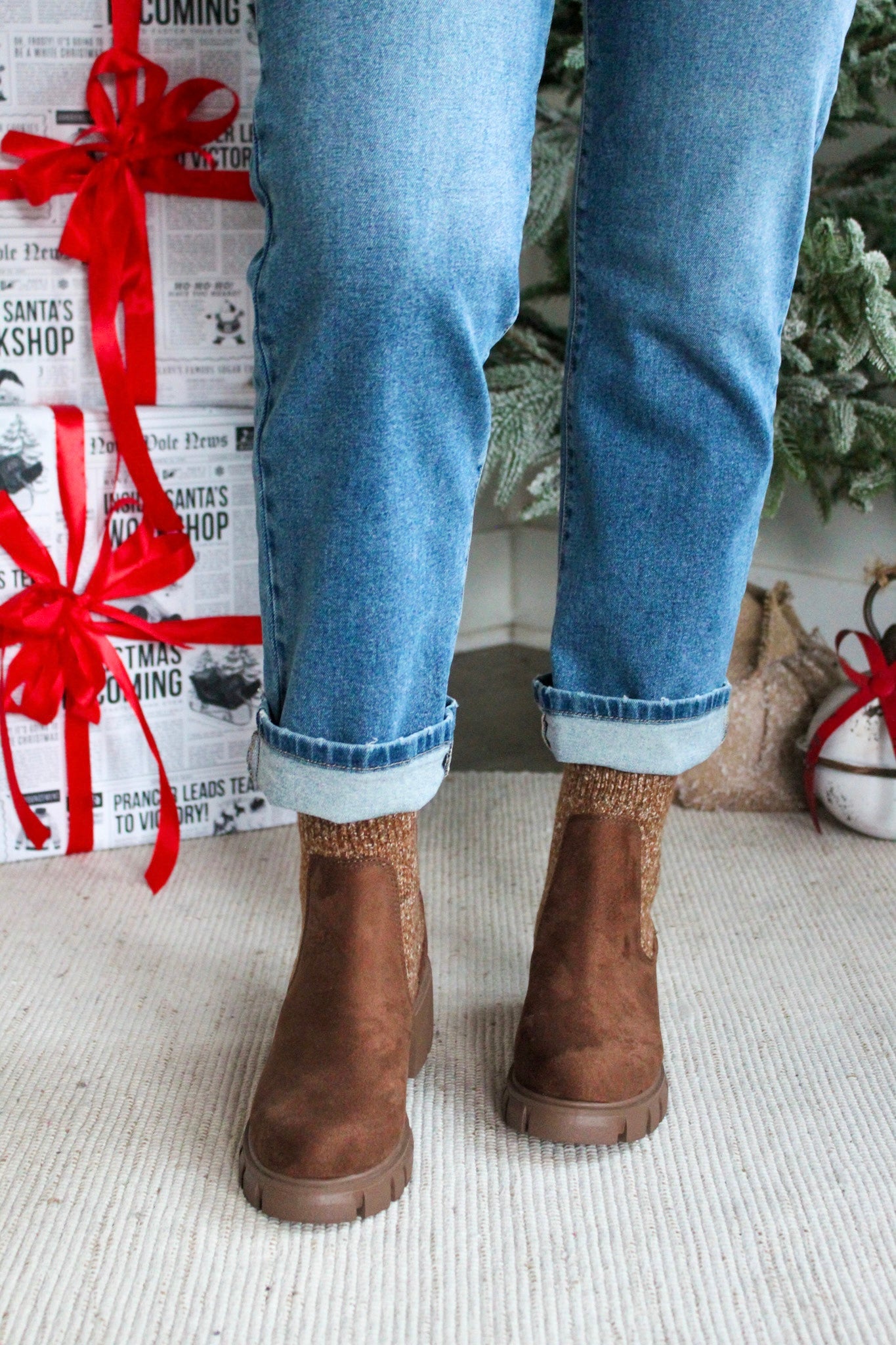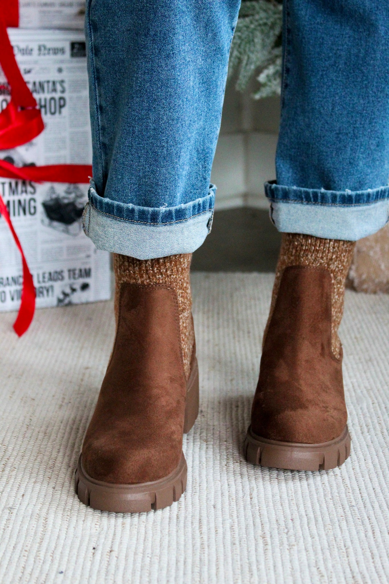 Meet the Aspen Chelsea Boot — a wardrobe staple that’s truly cozy and chic with its rib knit contrast design. Featuring a round toe silhouette and beautiful faux suede upper for a classic look with a chunky lug sole that’s trendy and comfortable. The stretch elastic gore and pull tab provides an easy on/off design. Wear it with denim, cargo pants, skirts or dresses… the styling options are endless.