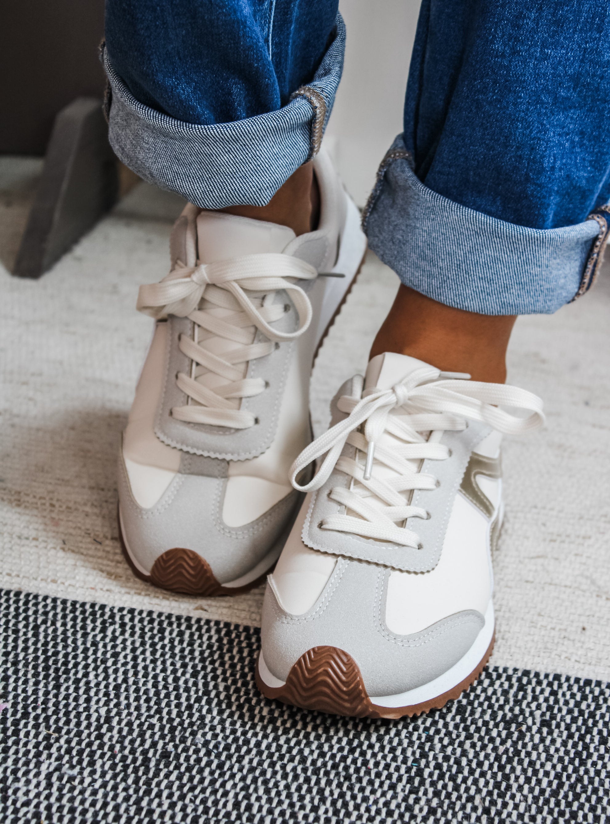 Designed for both style and function, our Winning Streak Sneaker add an eye-catching edge to any outfit! Featured in a sleek silhouette and neutral color block style with a rubber sole and gold accent design. Switch out with different colored laces for a one-of-a-kind style. This modern take on the low top sneaker is a trendy must-have for any closet!