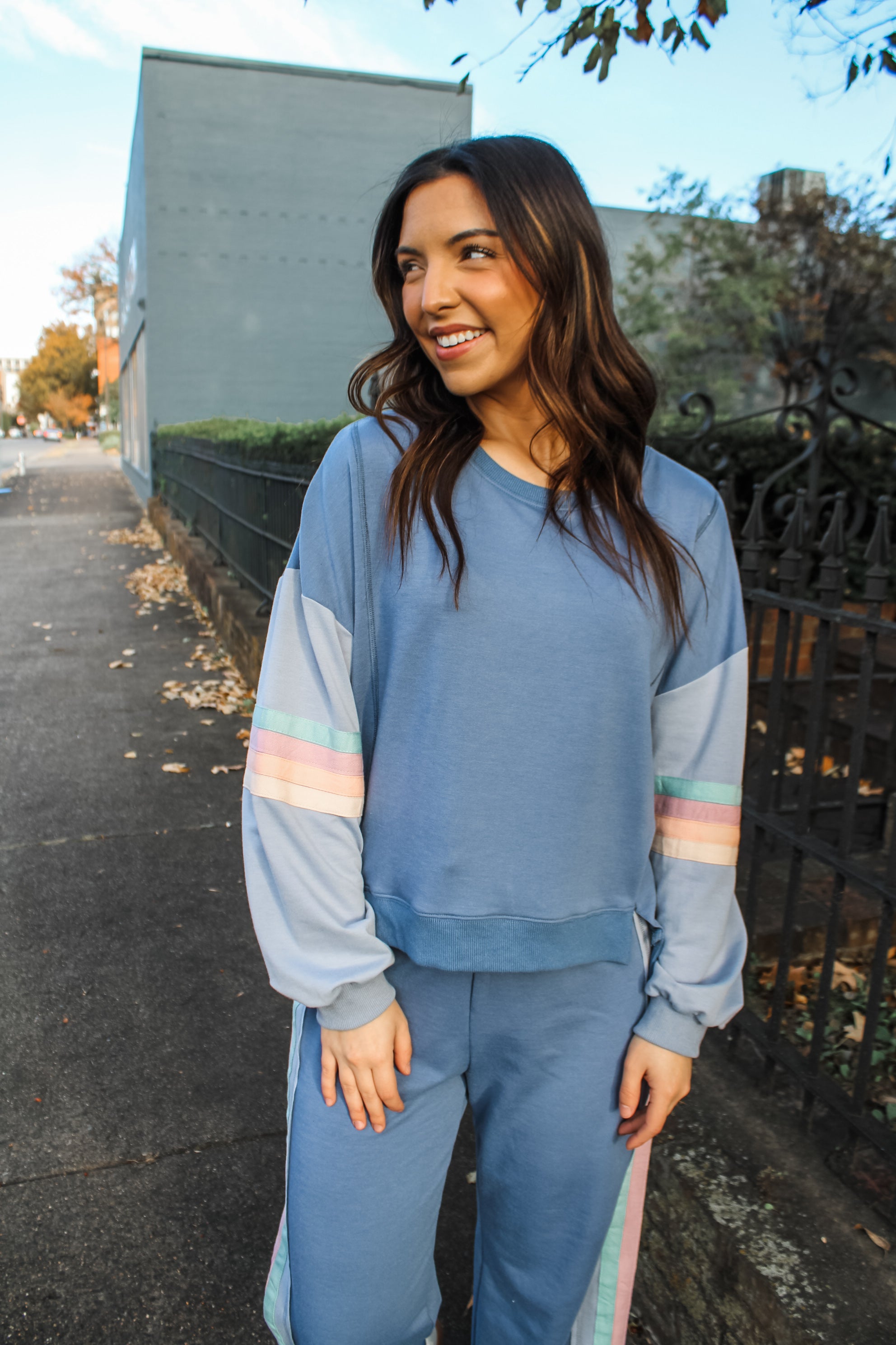 Paired to perfection, this pant set can be dressed up or kept sporty for the holidays and beyond! The soft cozy knit provides a light layer of warmth and the color tape detailing gives it that vintage sportswear vibe. The crewneck top comes in a loose dolman silhouette with rib finishing and a stepped hem, and the pants feature a stretch drawstring waist and relaxed straight leg silhouette. This cool and comfy look is an effortless staple for lounging at home, casual coffee dates, or weekends in the city.