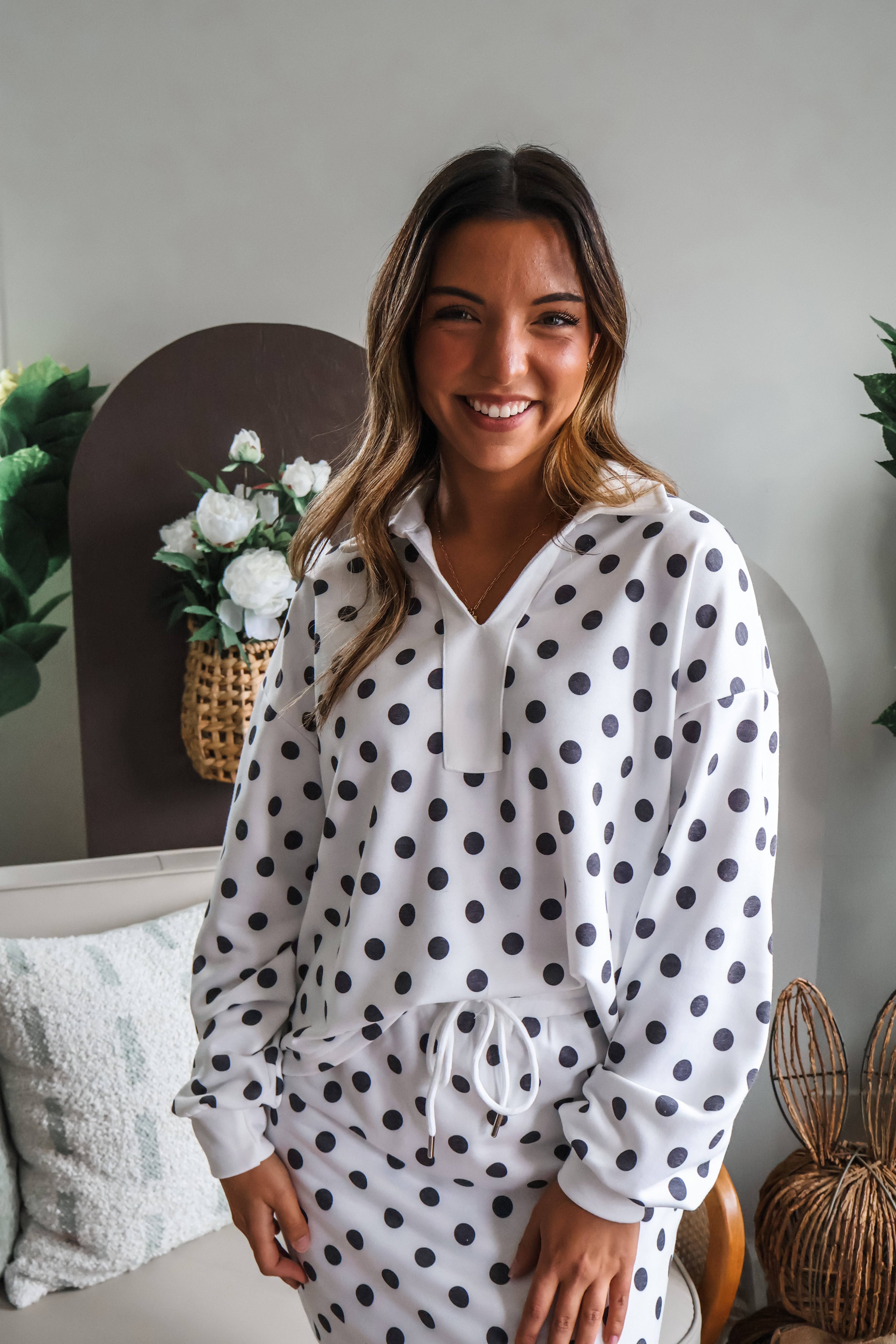 Add a pop of polka dot to your spring style! This playful and trendy set features a collared top with drop shoulder sleeves and a skirt with an elasticized drawstring waist and curved hem. The smooth terry knit fabrication and relaxed silhouette give it a comfortable fit and casual ease. In a timeless colorway, both pieces are so easy to mix and match with the rest of your wardrobe whether you want to dress up or down. Pair the look with sneakers for a sporty co-ord style.