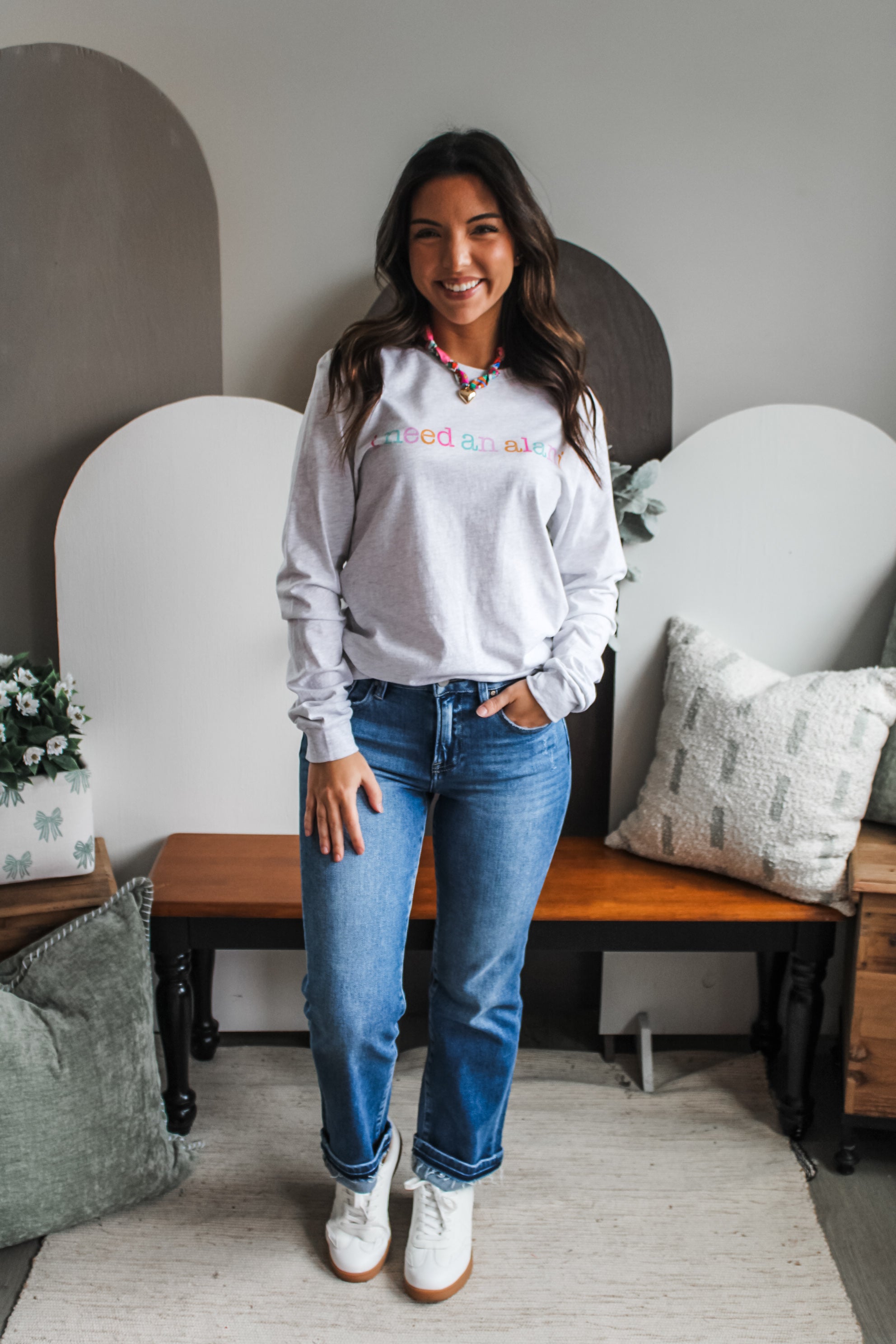 Our exclusive collection of the cutest graphic tees will add a playful edge to your spring wardrobe! Worn on its own or layered under vests and cardigans, it’s a cute look that adds print and personality to your everyday style. This long sleeve top features a classic crewneck and relaxed fit in a pre-shrunk, heathered cotton knit.
