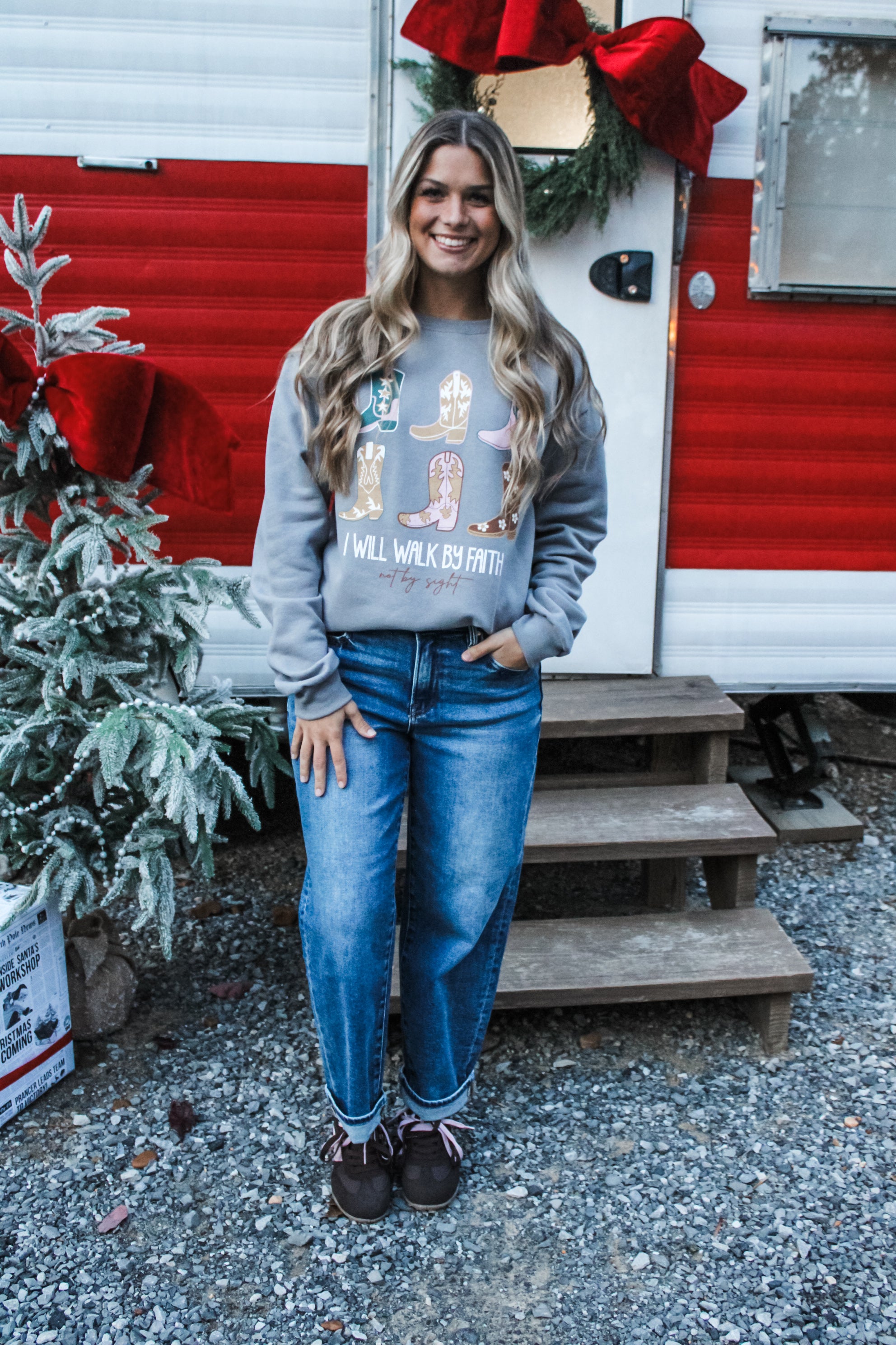 Celebrate the holidays with a dose of faith and style! Our exclusive collection of the cutest graphic sweatshirts will keep you cozy and comfy all season long! This crewneck pullover features a graphic print in soft pre-shrunk fleece, with drop shoulder sleeves and a relaxed fit. With ribbed cuffs, collar and waistband with spandex for stretch and recovery. Toss over leggings or wear with your favorite jeans. Unisex fit, S-2X. Gildan Heavy Blend, 60% Cotton, 40% Polyester. Model is 5’5” and wears Small.