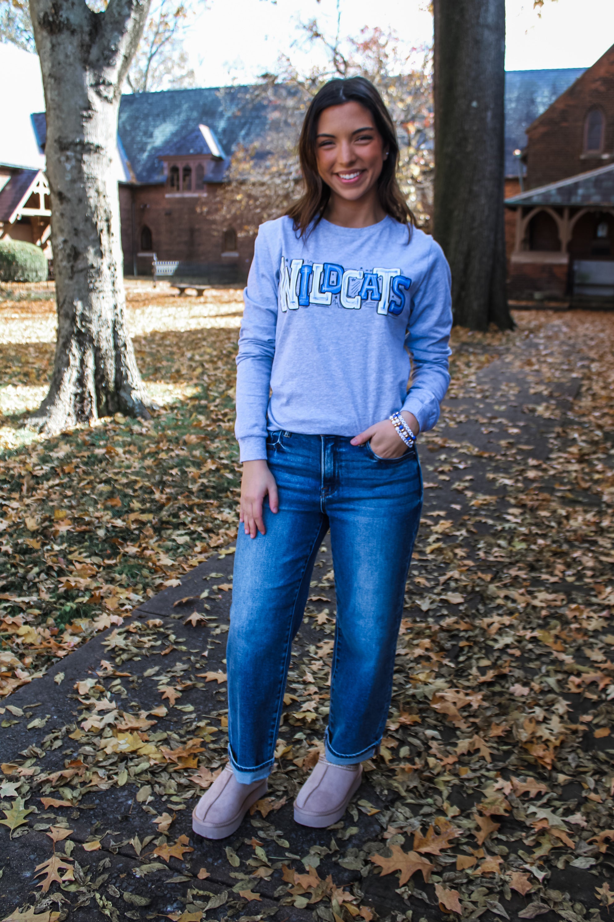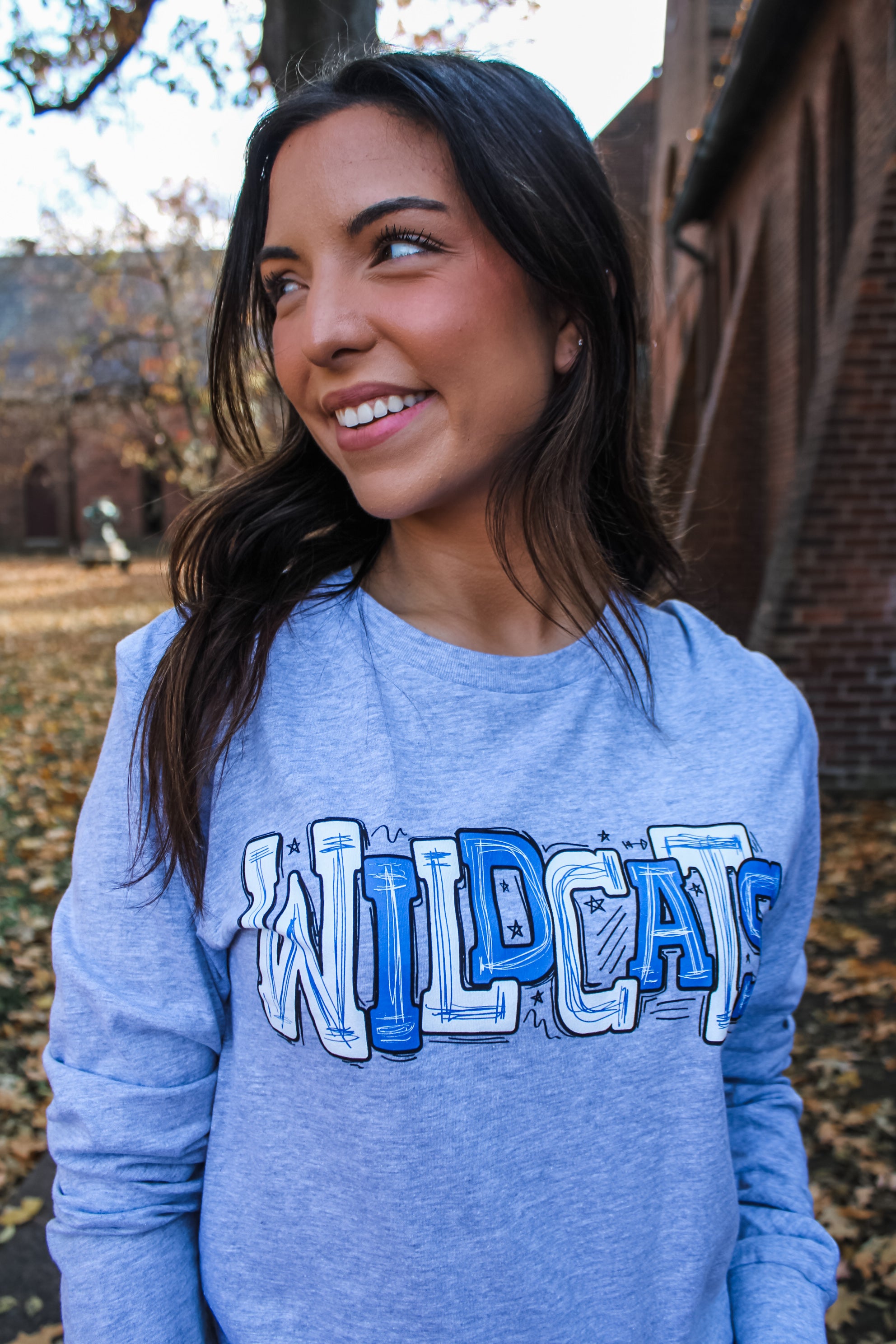 Have a Merry Wildcats Christmas! Celebrate the season in style with our exclusive collection of the cutest graphic tees! Worn on its own, layered under plaid shirts and chunky cardigans, it’s a playful look that adds print and personality to your holiday wardrobe. This long sleeve top features a classic crewneck and relaxed fit in a soft, pre-shrunk cotton knit.