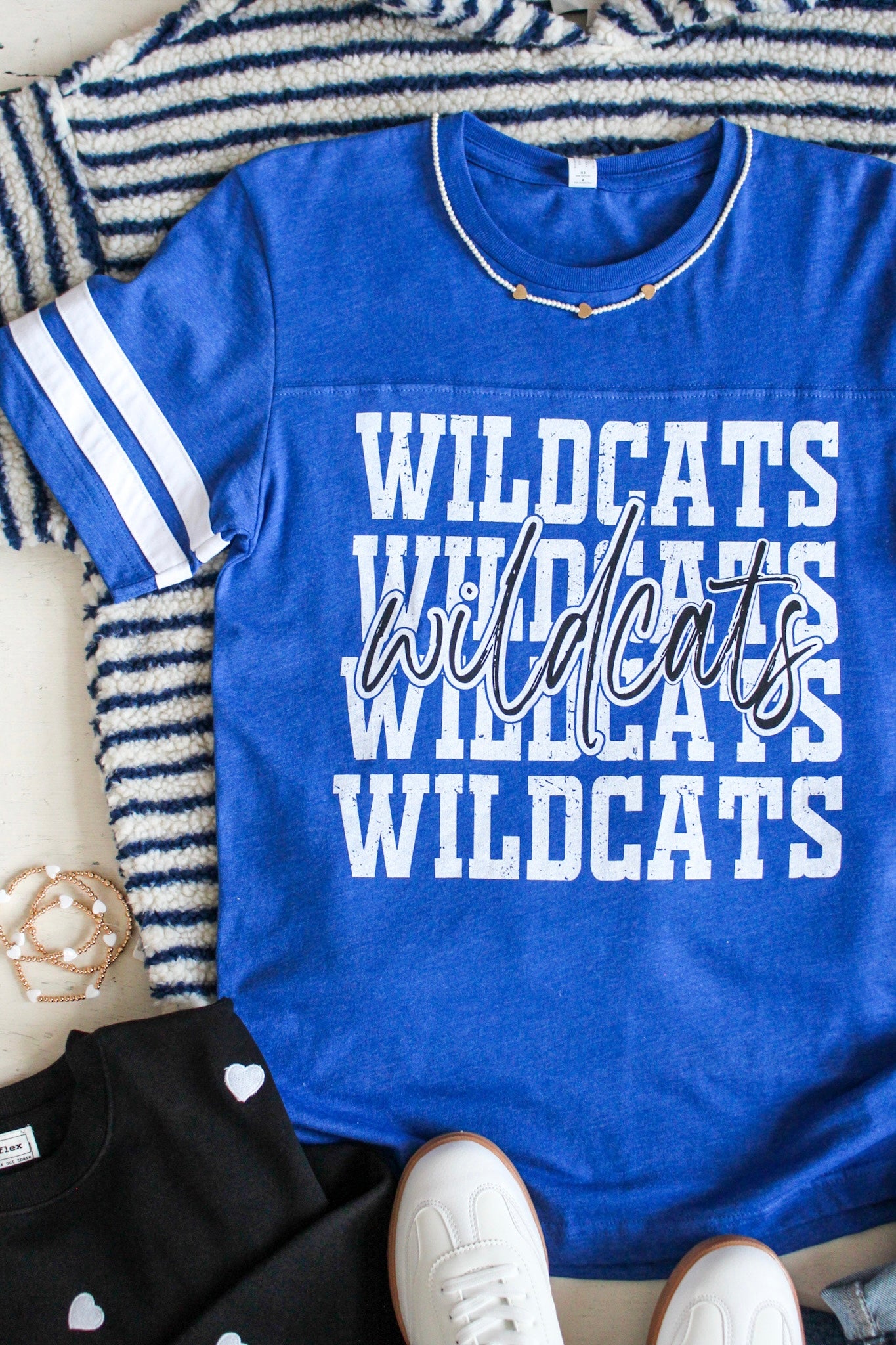 Go Wildcats! Worn on its own, or layered under woven shirts and zip up hoodies, this graphic tee is a cute look that adds print and personality to your everyday wardrobe. With a classic crewneck, varsity-inspired stripe detailing on the sleeves and relaxed fit in a soft, pre-shrunk cotton knit.
