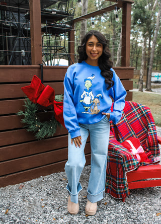 Grinchy Big Blue Christmas Graphic Sweatshirt • Heather Blue
