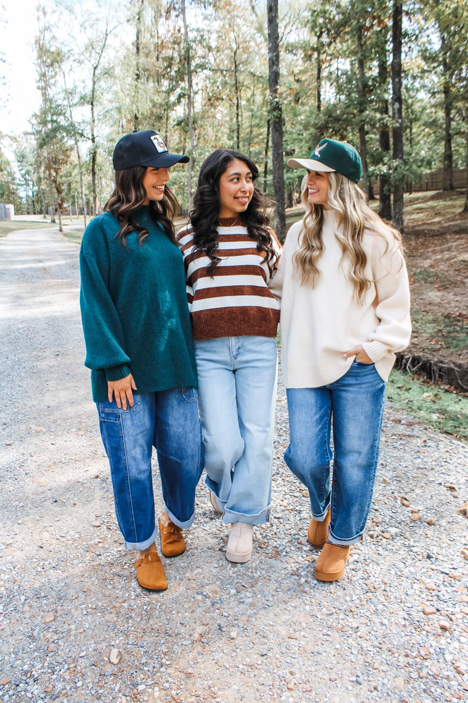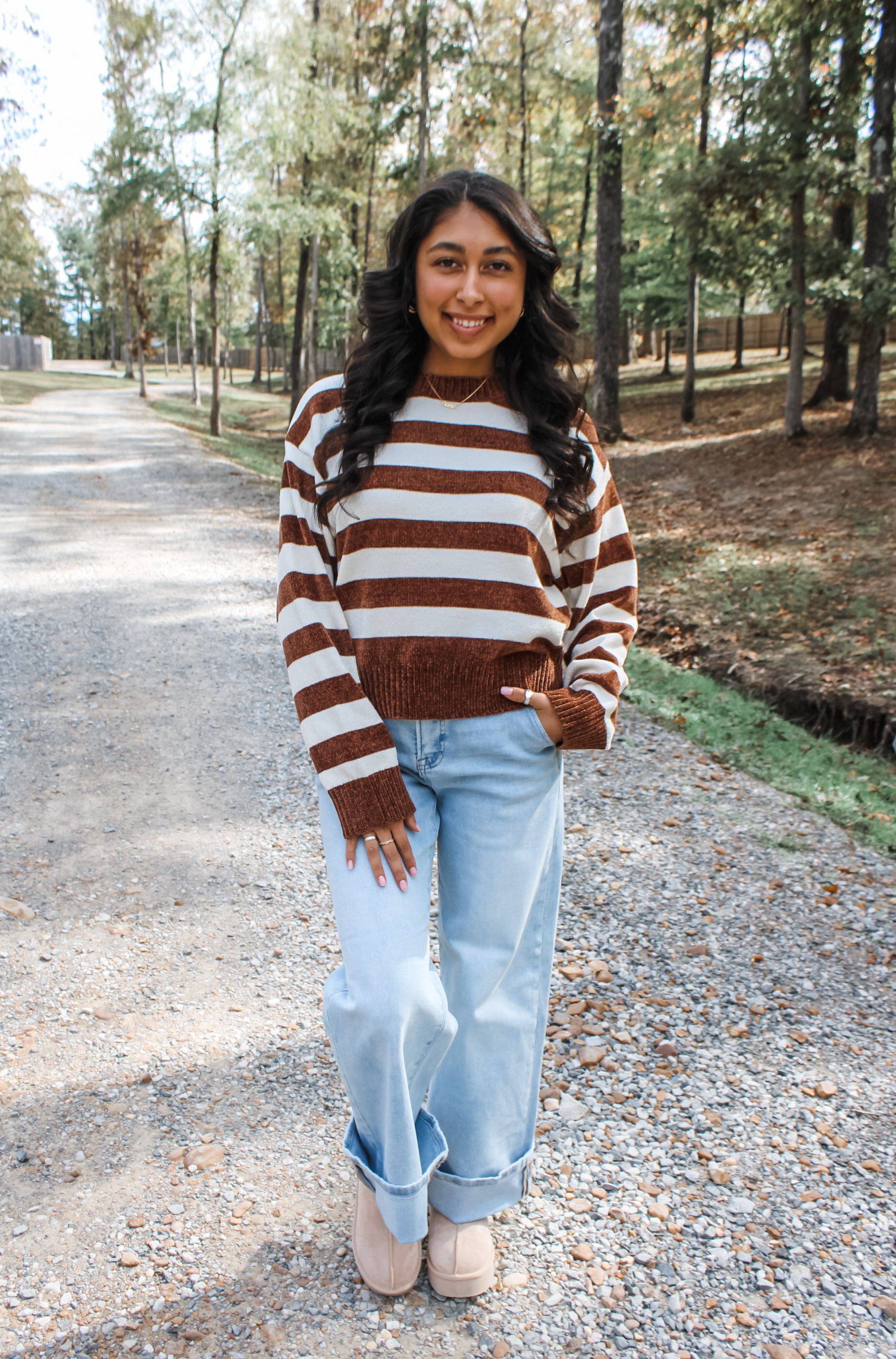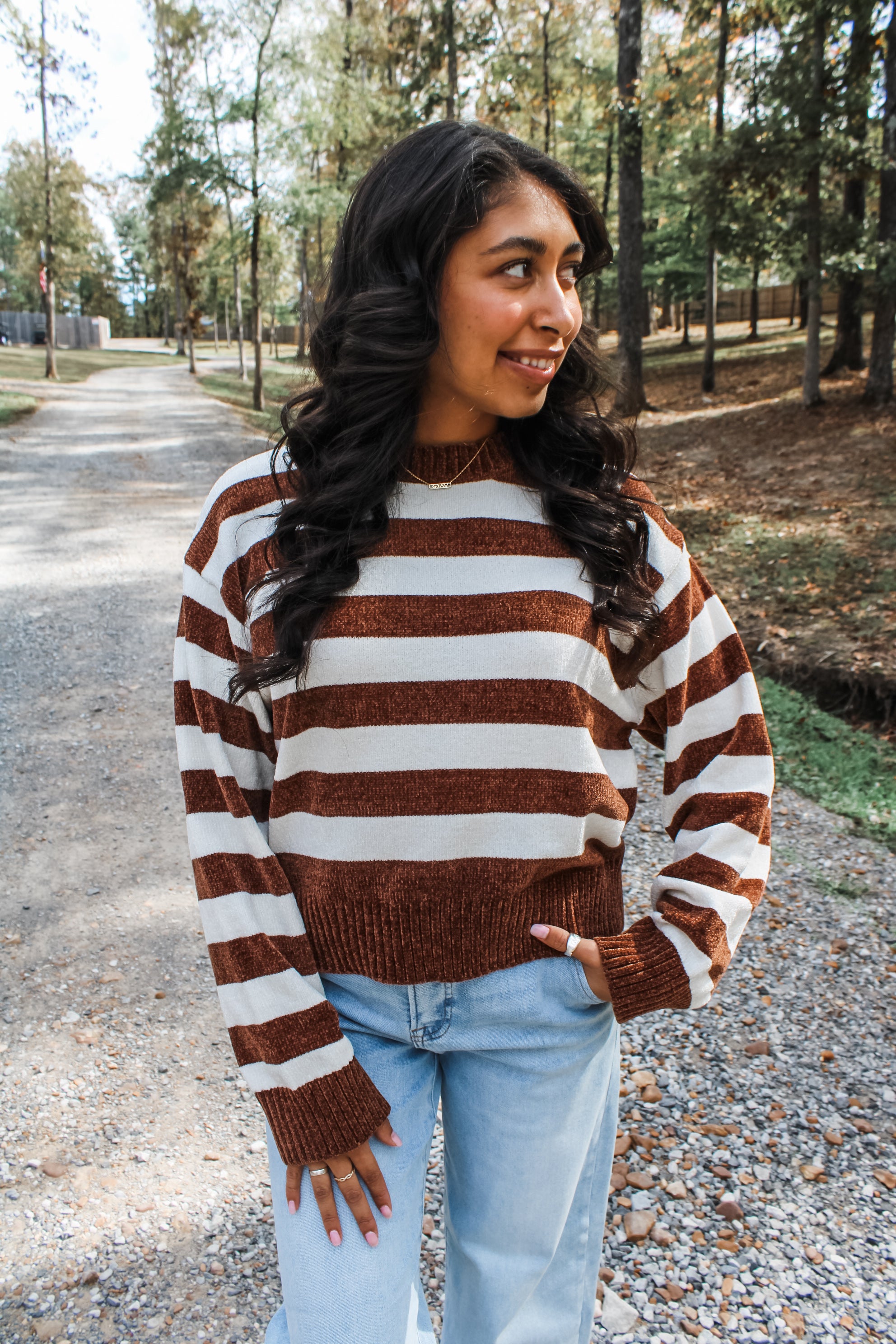 It’s sweater weather and this charming classic is a cozy staple you'll keep reaching for season after season! Crafted from a soft chenille knit with timeless stripes, it’s a versatile look you can dress up or down for any occasion. Featured in a relaxed silhouette with a crew neckline, drop shoulder sleeves and contrast rib hem.