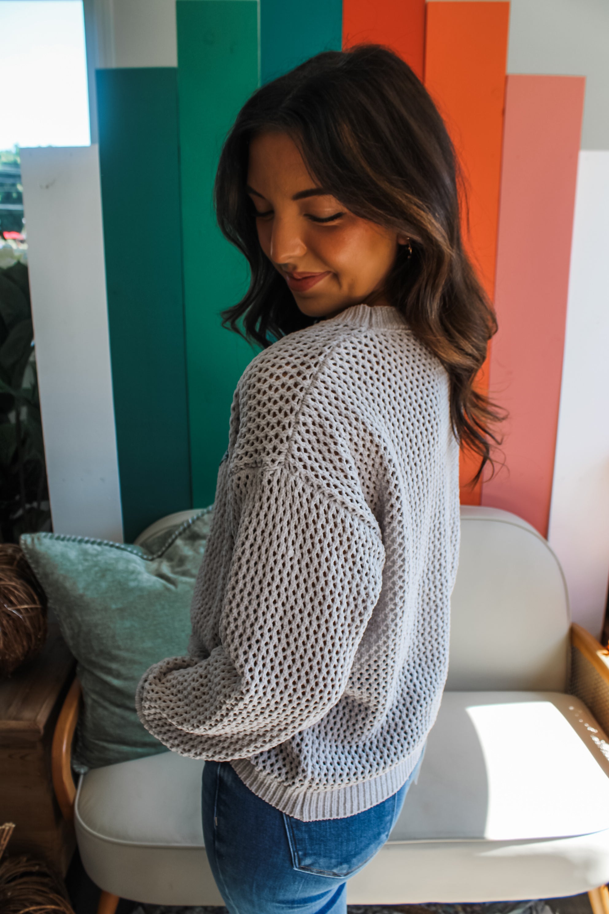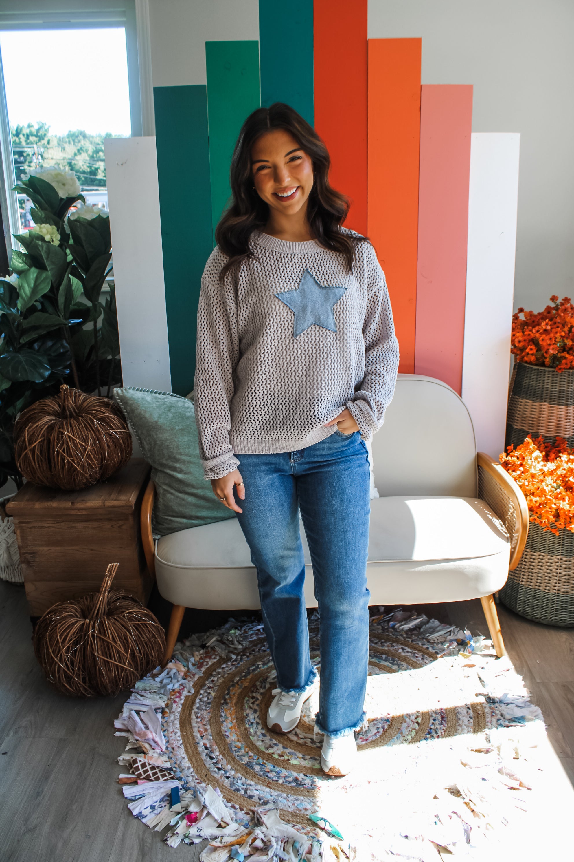 Think cozy textures and eye-catching details to elevate your wardrobe. Fabricated in a soft open knit chenille, this sweater is a playful look for everyday adventures and weekend outings! Featured in a slouchy crewneck silhouette with a denim star patch design.