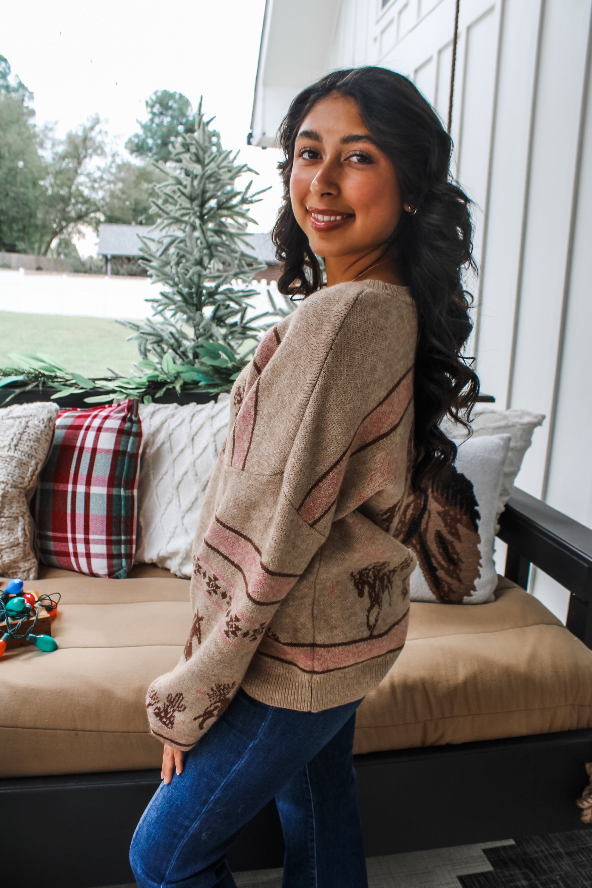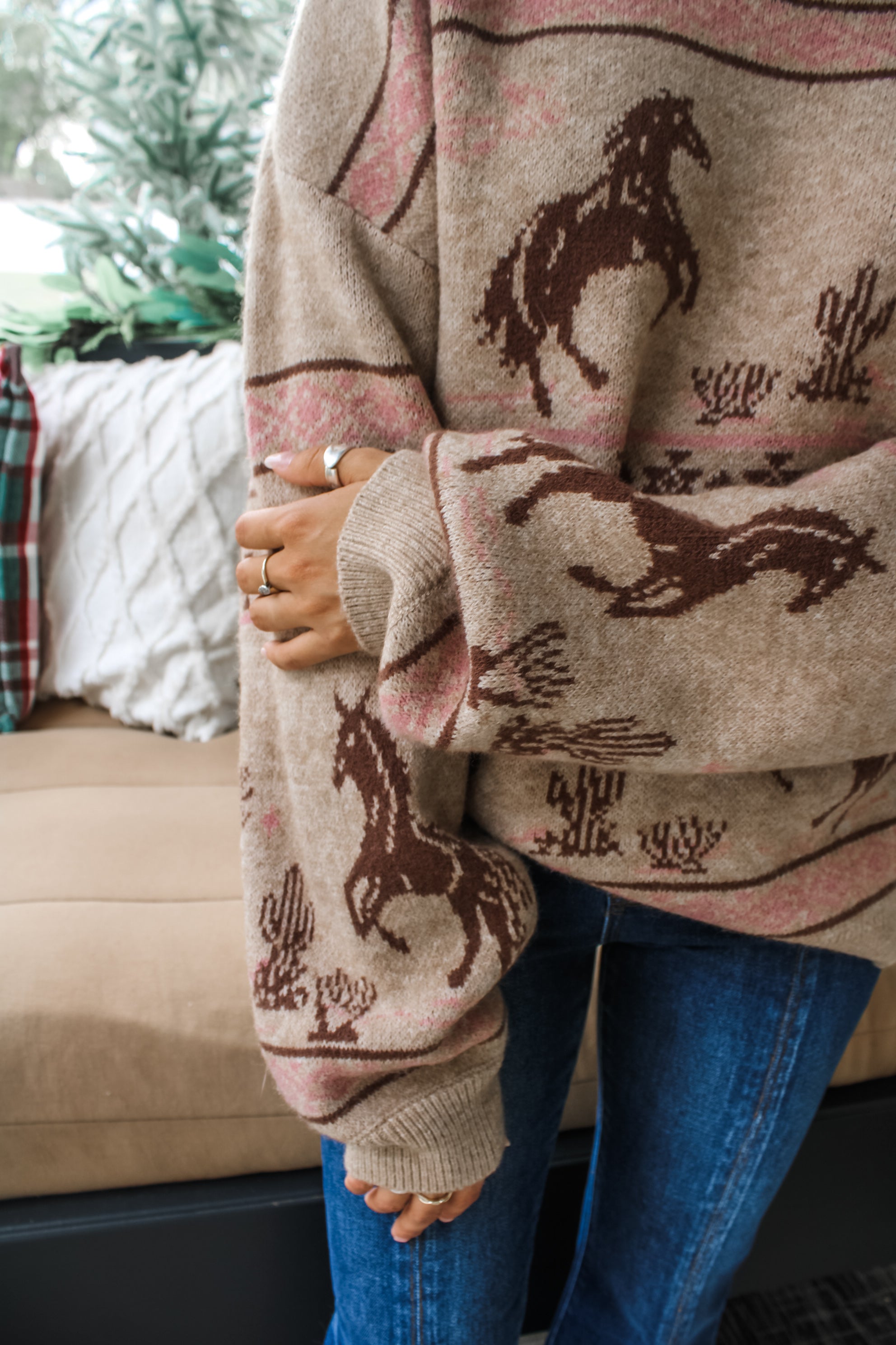 Add a country chic flair to your holiday style! This statement-making sweater features a trendy western-inspired design for that cozy cowgirl look. Fabricated in a soft brushed knit with a crew neckline, drop shoulder sleeves and a modern loose silhouette.