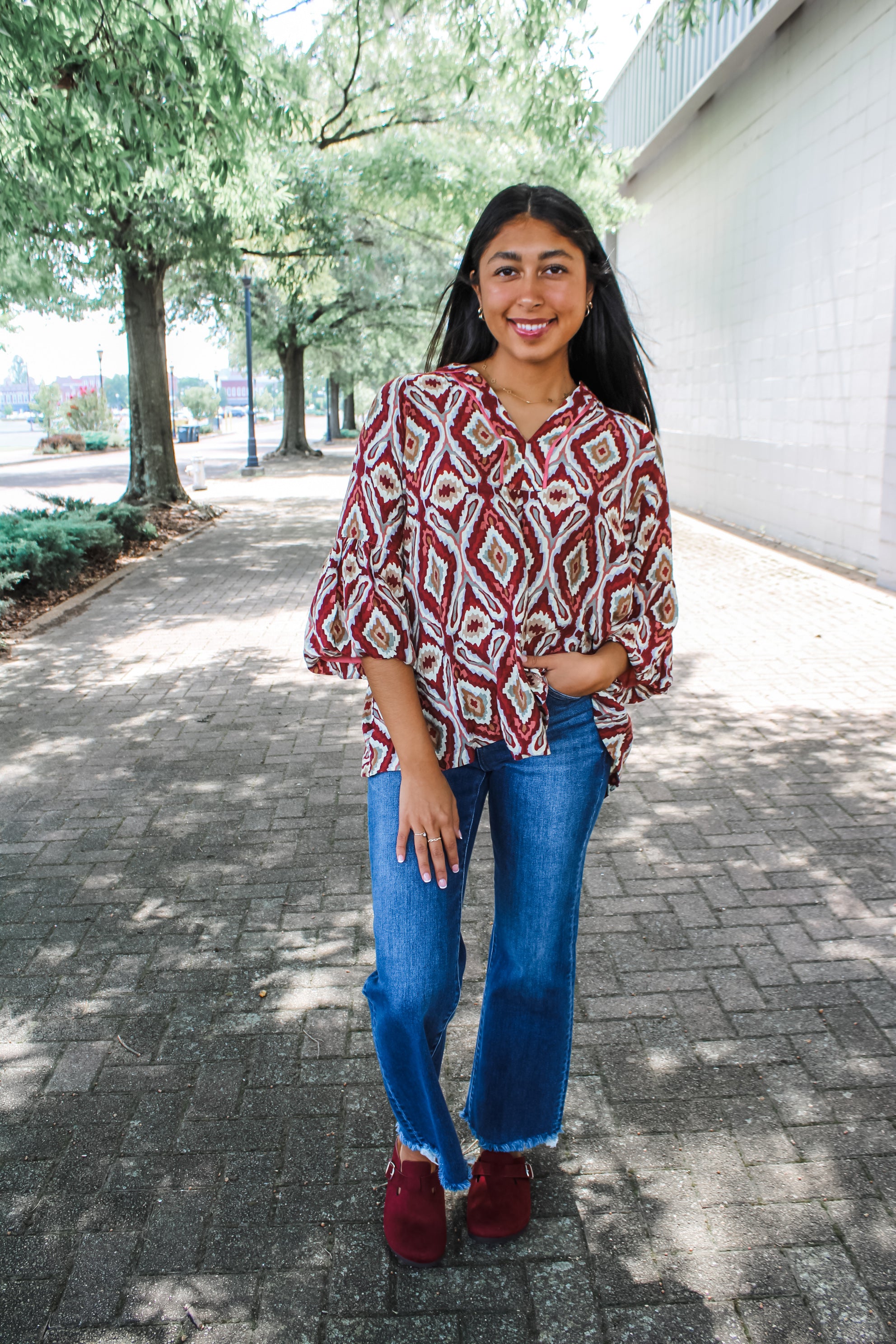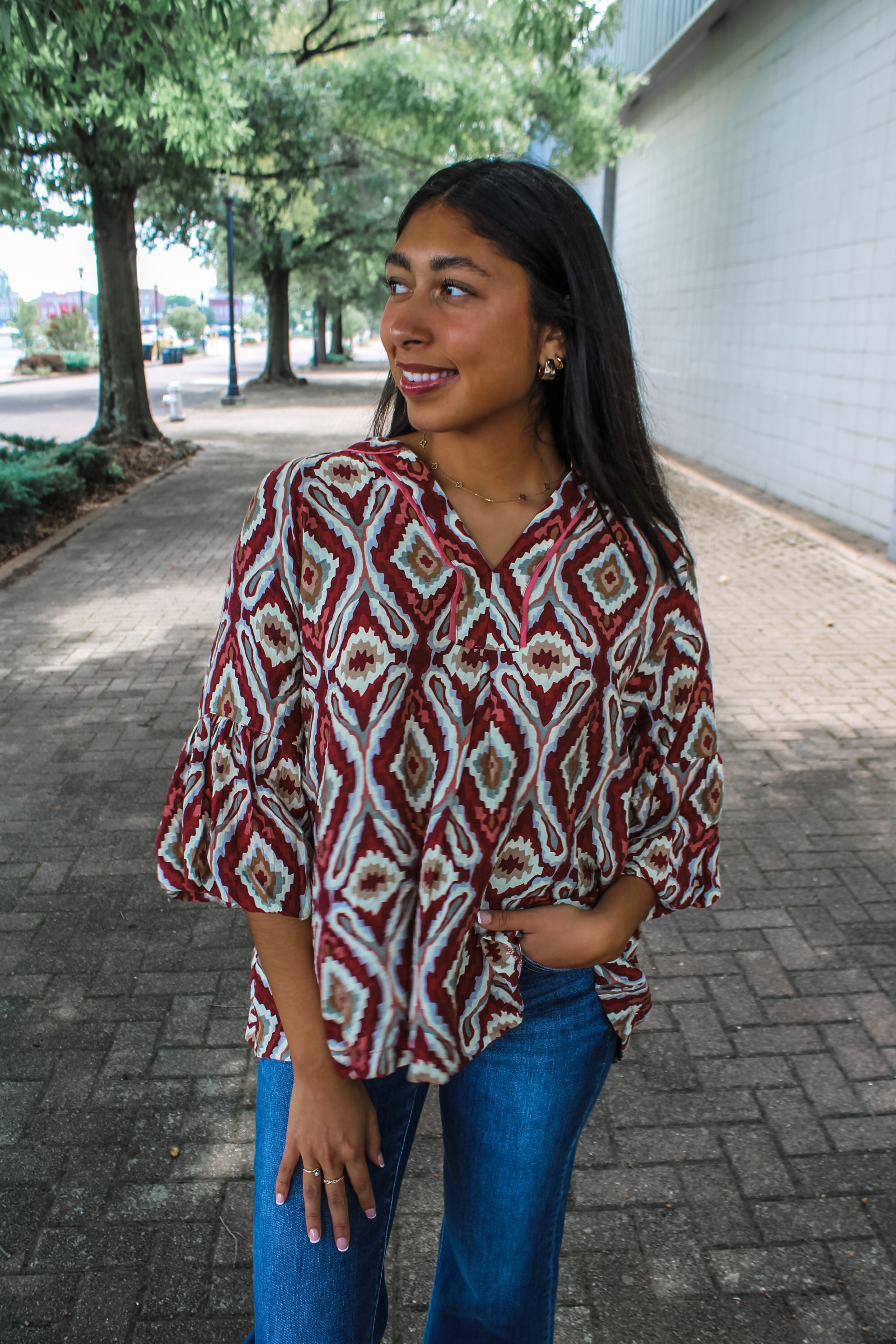 A fun new print as we head into fall. Beautiful colors of berry, tan and grey. 3/4 sleeve and runs oversized. Model is wearing the small and is 5”5. Small 0-6 medium 6-10 large 10-14. 100 polyester