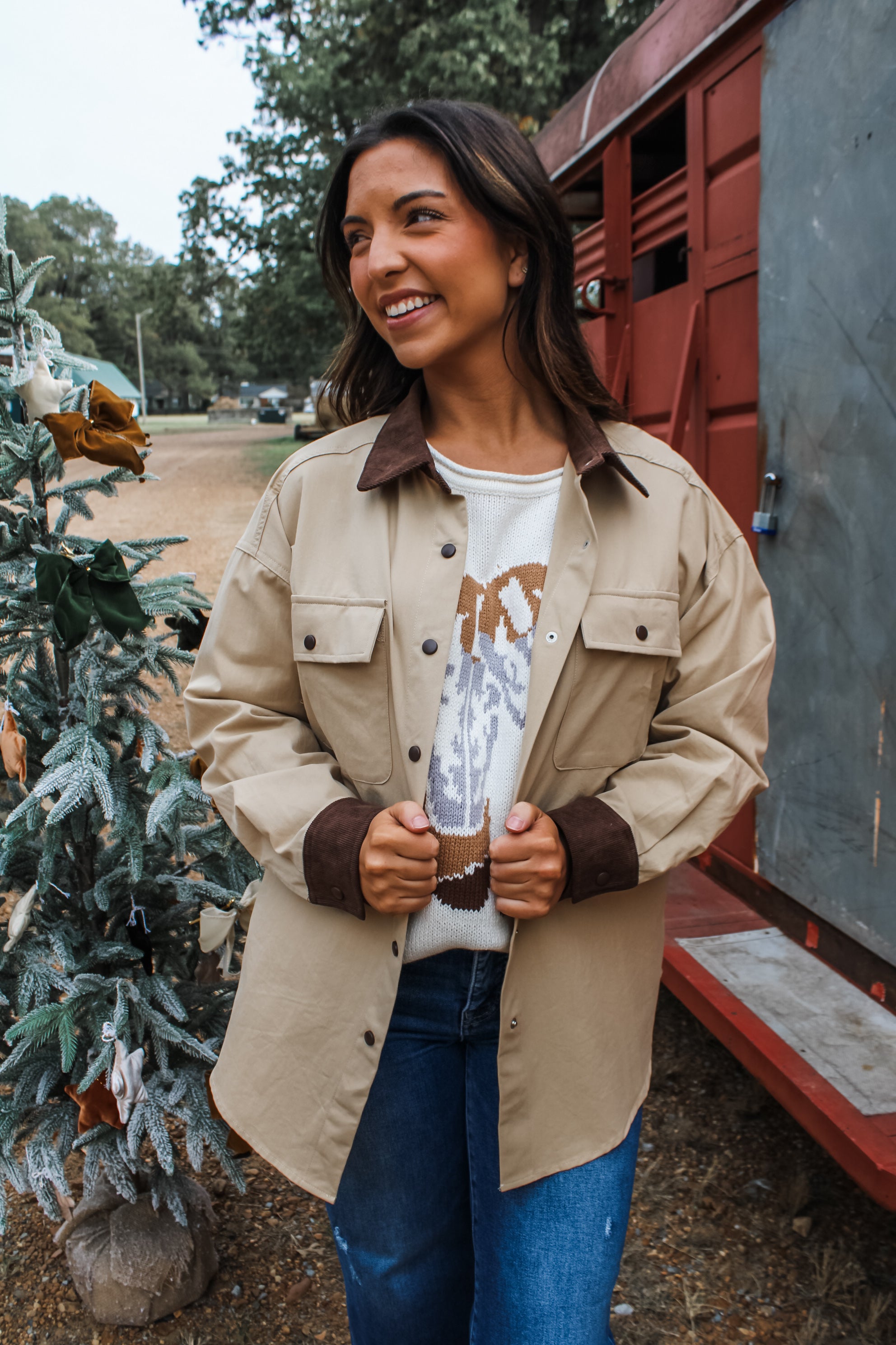 ‘Tis the season for style and layering. The perfect blend of classic details and a modern silhouette, this shacket is a versatile staple you can dress up or down season after season. Crafted from a cotton woven fabrication with corded contrast design, double chest pockets, snap button front and a curved hem.