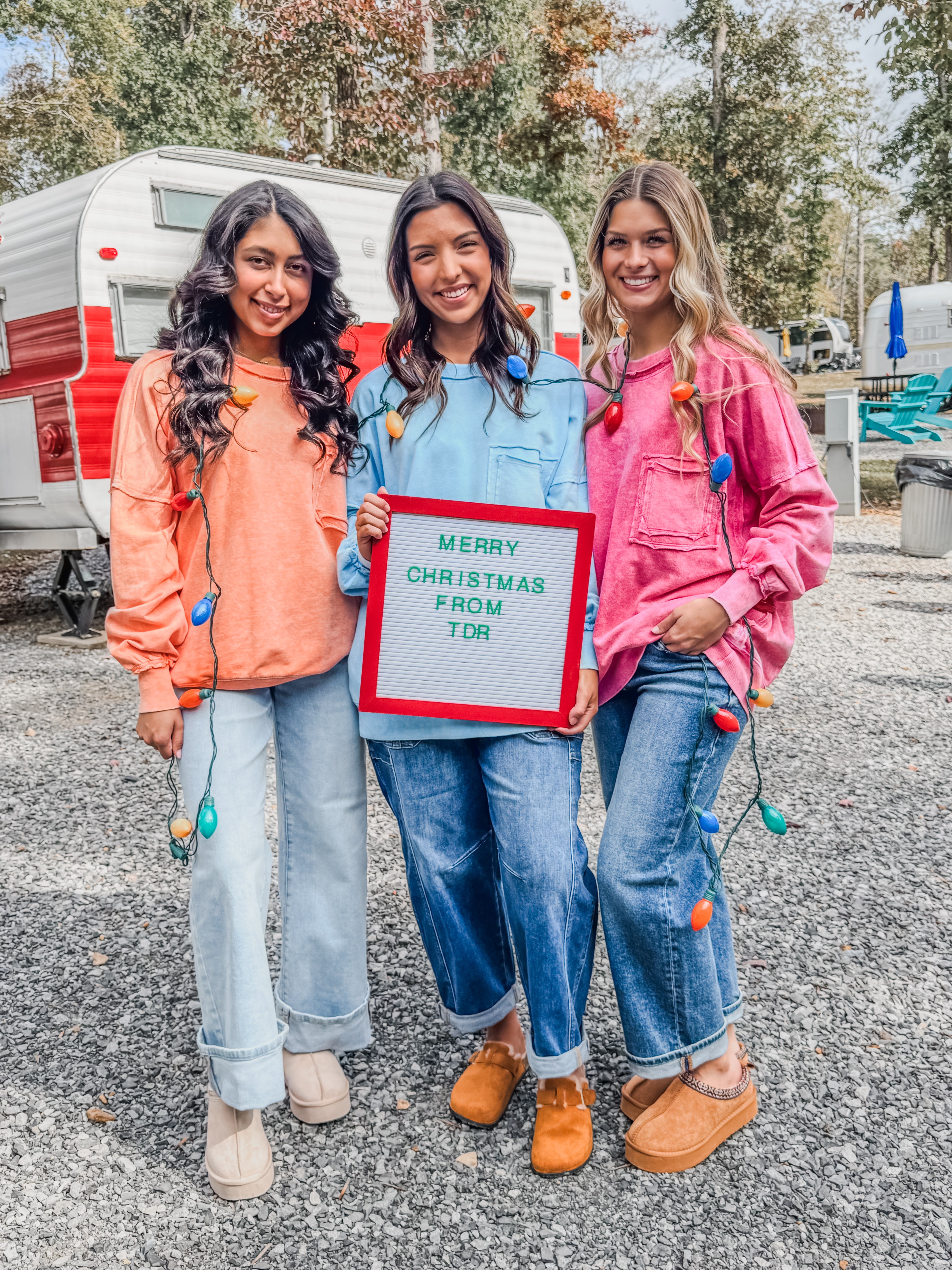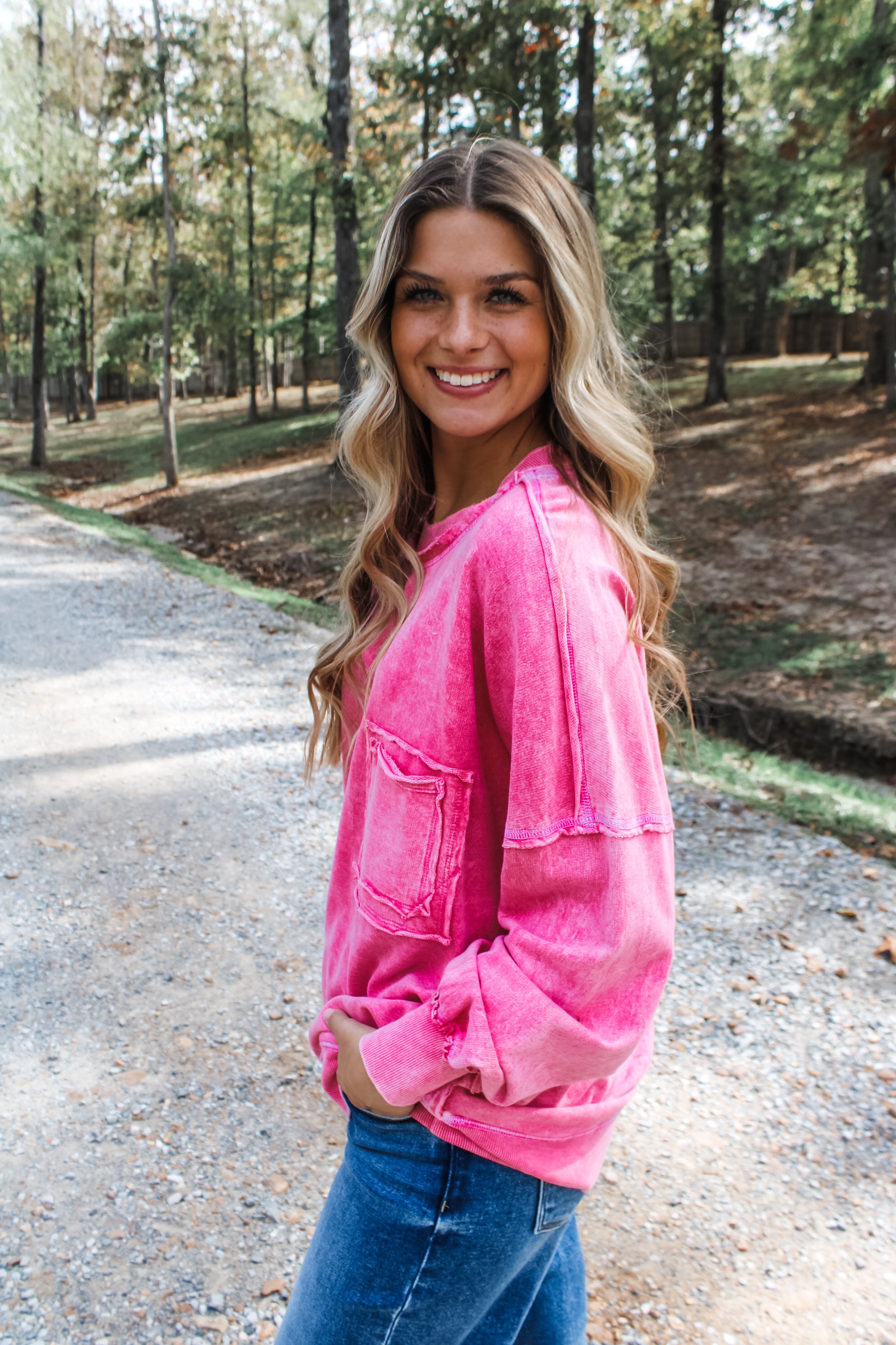 So cool and comfortable, our Double The Fun Pullover will be your new go-to for the holidays and beyond! The mineral washed cotton knit provides a soft lived-in feel, while the classic crewneck and rib band finishing make it a wardrobe staple you’ll keep wearing over and over. Featuring exposed seaming with raw edge details, a chest pocket, side pockets and a longer hem that’s perfect for tossing over leggings and jeans. With drop shoulder sleeves and a modern loose silhouette for that cozy slouchy fit.