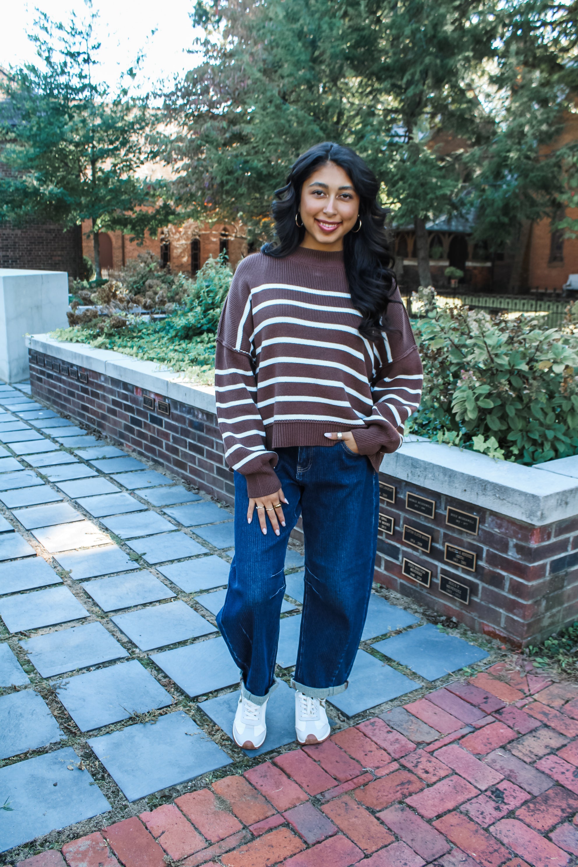 Refined essentials for a chic and cozy wardrobe. This striped sweater is fabricated in a braided rib knit with exposed seaming, balloon sleeves, rib contrast finishing and a high low hem. With a slouchy dolman silhouette for a relaxed and comfortable fit.