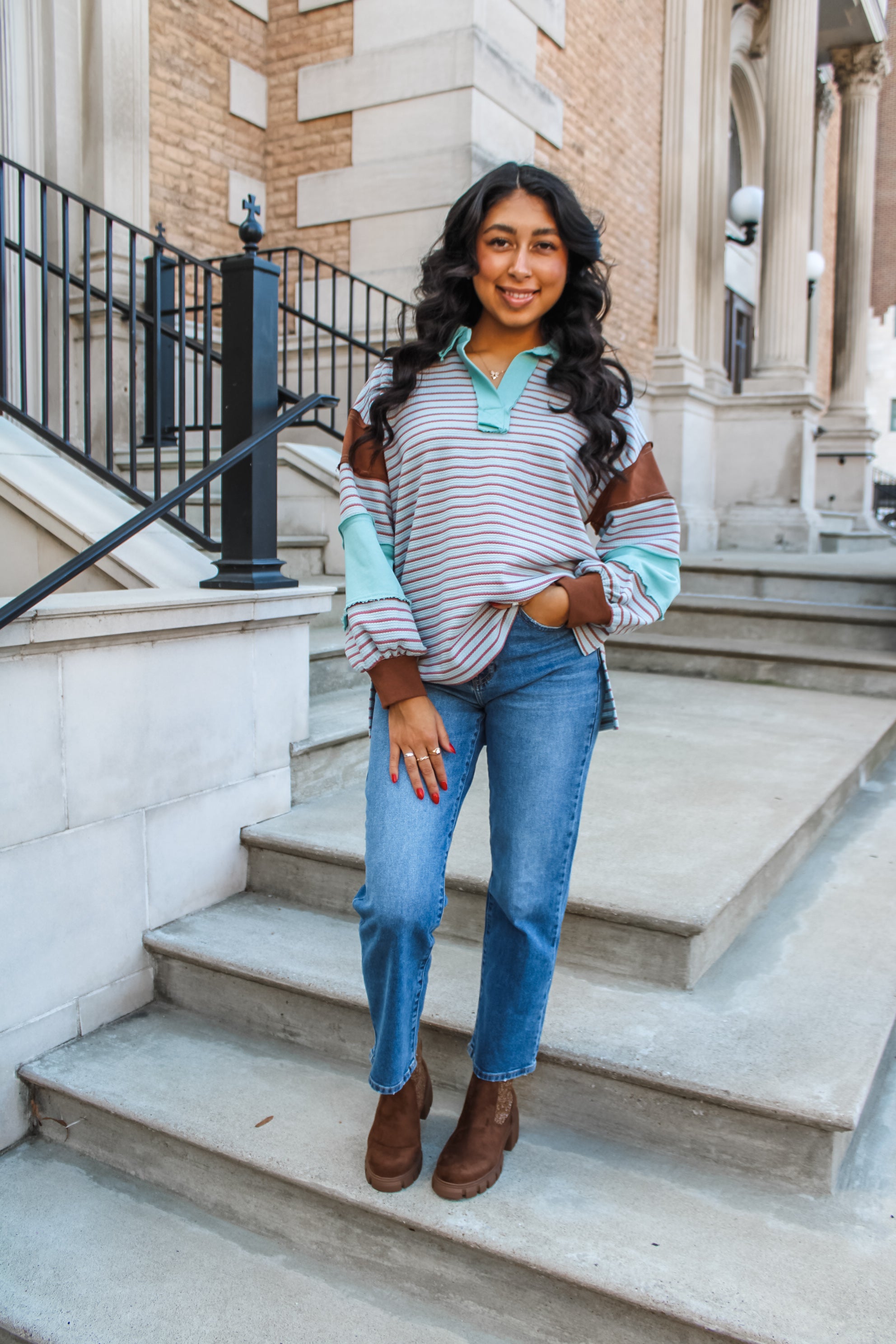 So cool in colorblock and stripes, our Ember Pullover is a standout essential. The patchwork-style fabrication keeps it cute and current, while the loose dolman silhouette provides a comfy and modern fit. Featuring a collared neckline, deconstructed seaming, lantern sleeves and a high low hem.