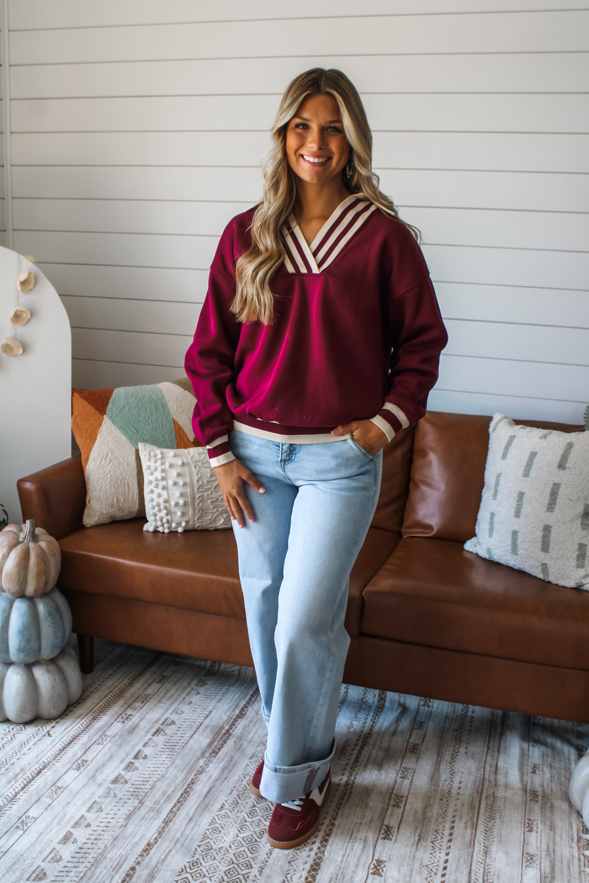 Relaxed style elevated, this pullover effortlessly combines a comfortable silhouette with sophisticated accents. The soft fleece fabrication provide a layer of warmth, and the relaxed silhouette give it an easy, modern fit. Featuring a collared neckline, drop shoulder sleeves and striped stretch band detailing.